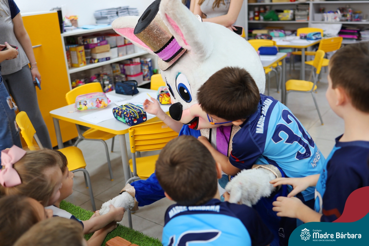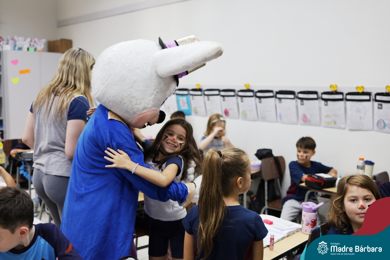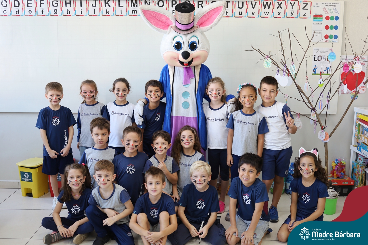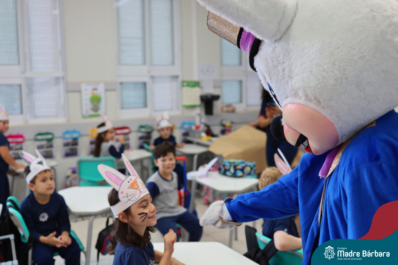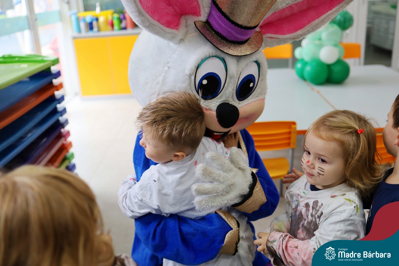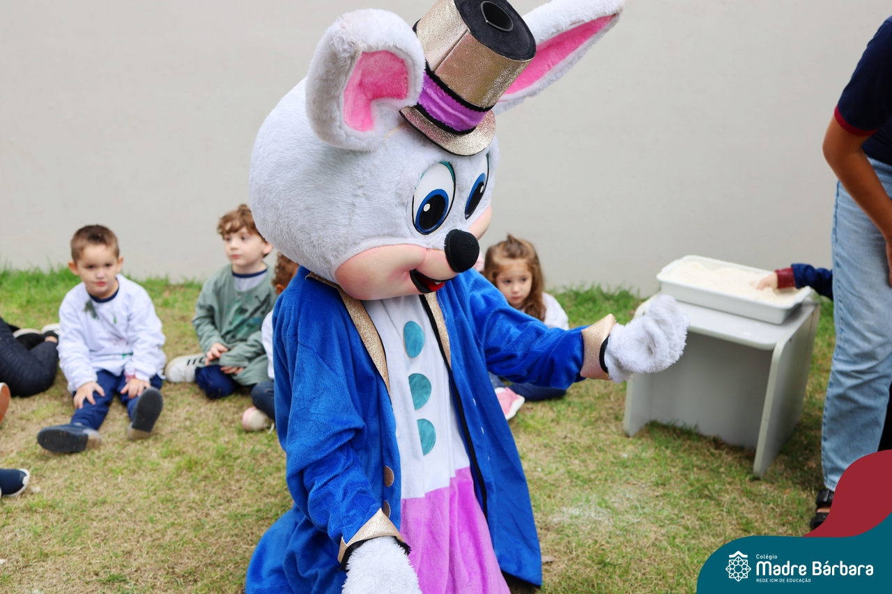 Na quinta-feira (17.04) as turmas da Educação Infantil ao Ensino Médio receberam a visita do Coelho da Páscoa do Grêmio Estudantil (Gembar). No Ensino Médio, o Gembar esteve acompanhado pela coordenação pedagógica, que entregou um mimo para os alunos e professores. Já na Educação Infantil e nos Anos Iniciais, as crianças aproveitaram para abraçar e fazer fotos com o amigo Coelho, já que ele havia deixado o ninho escondido por espaços do Colégio. Foi um dia muito alegre e feliz. Parabéns para o Gembar pela dedicação e por tornar o dia das crianças mais encantador e especial.