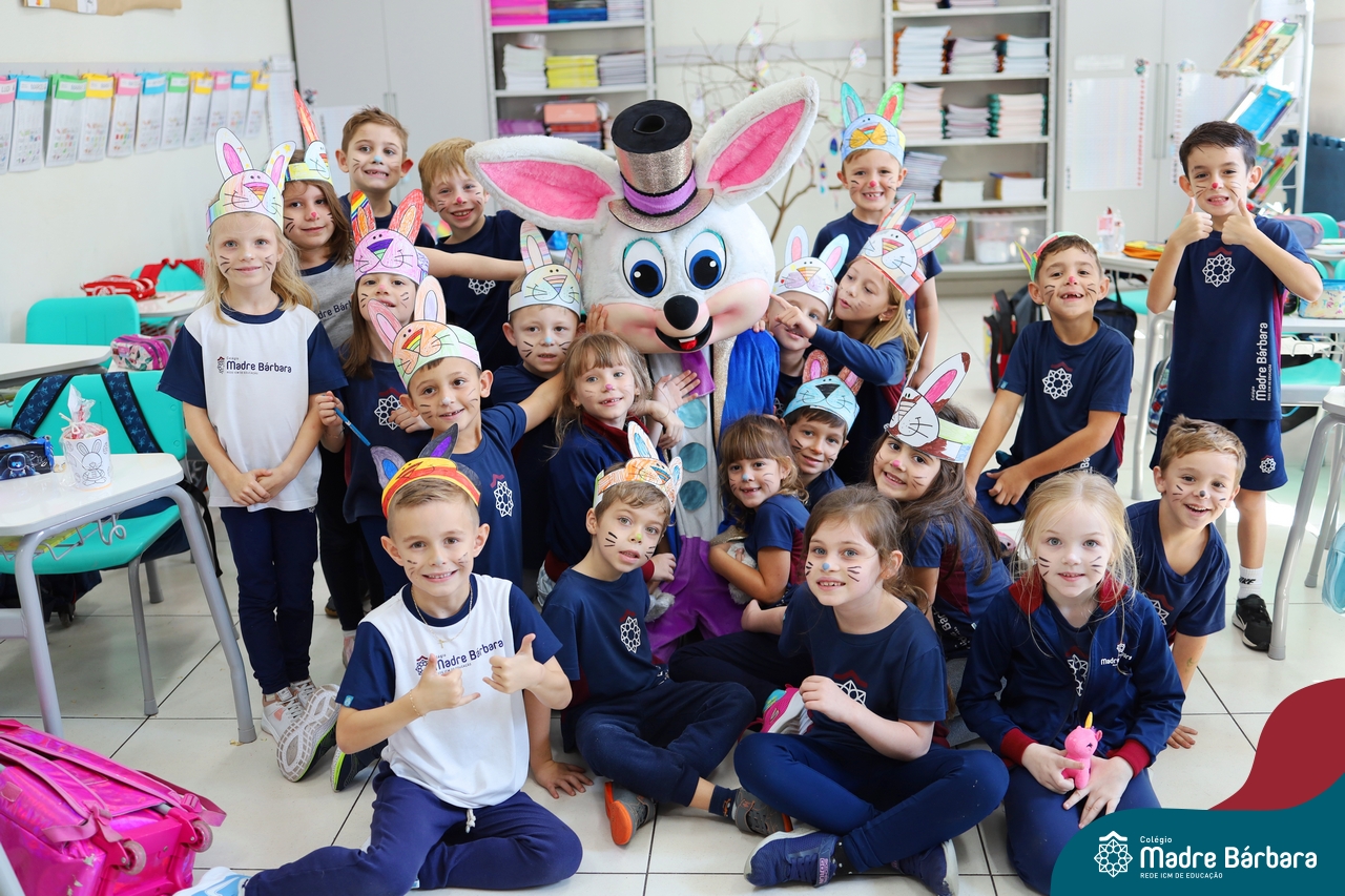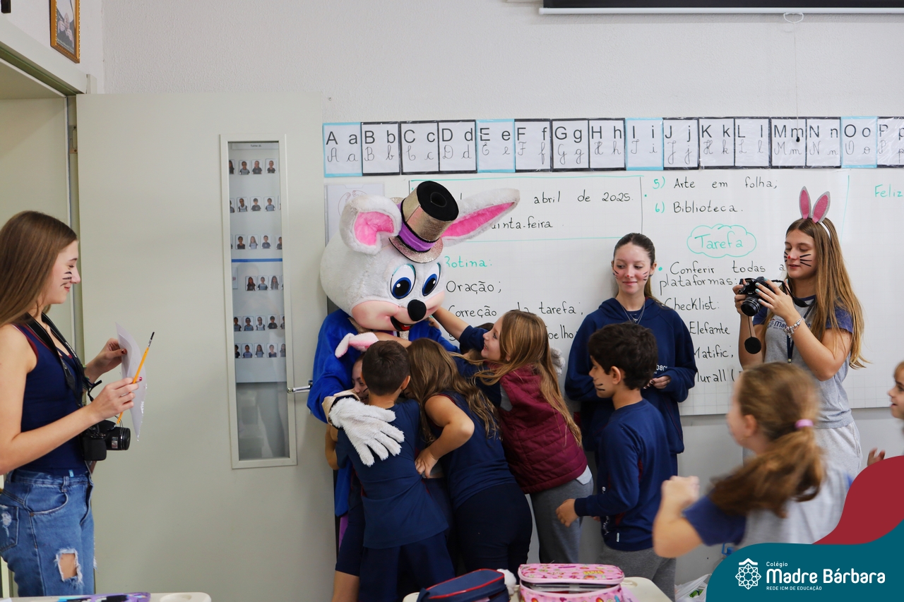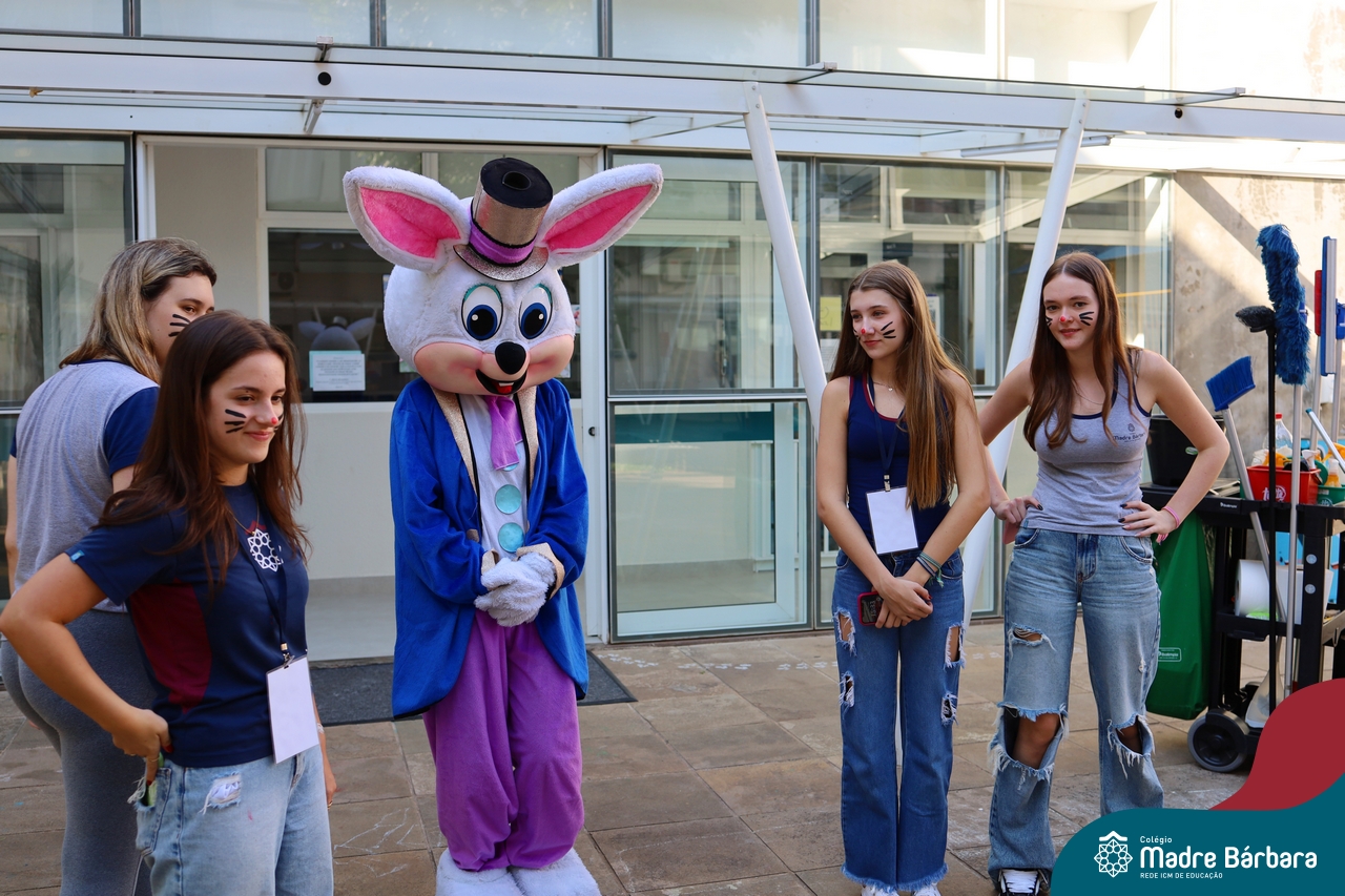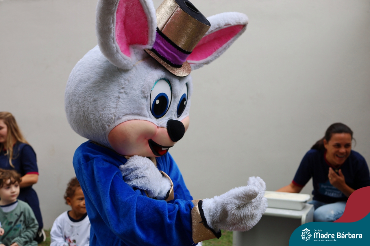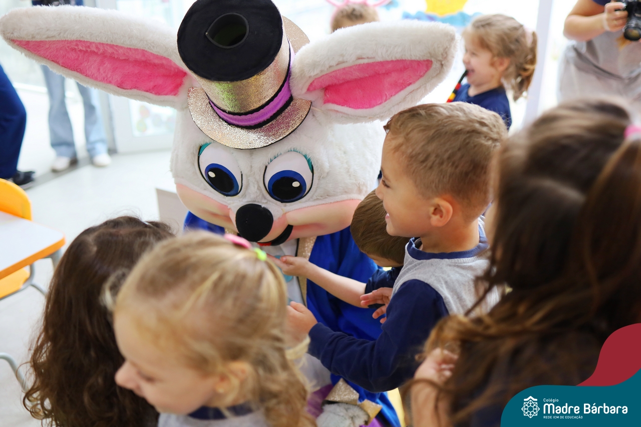 Na quinta-feira (17.04) as turmas da Educação Infantil ao Ensino Médio receberam a visita do Coelho da Páscoa do Grêmio Estudantil (Gembar). No Ensino Médio, o Gembar esteve acompanhado pela coordenação pedagógica, que entregou um mimo para os alunos e professores. Já na Educação Infantil e nos Anos Iniciais, as crianças aproveitaram para abraçar e fazer fotos com o amigo Coelho, já que ele havia deixado o ninho escondido por espaços do Colégio. Foi um dia muito alegre e feliz. Parabéns para o Gembar pela dedicação e por tornar o dia das crianças mais encantador e especial.