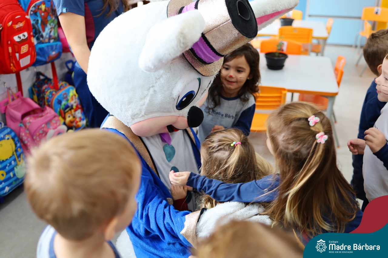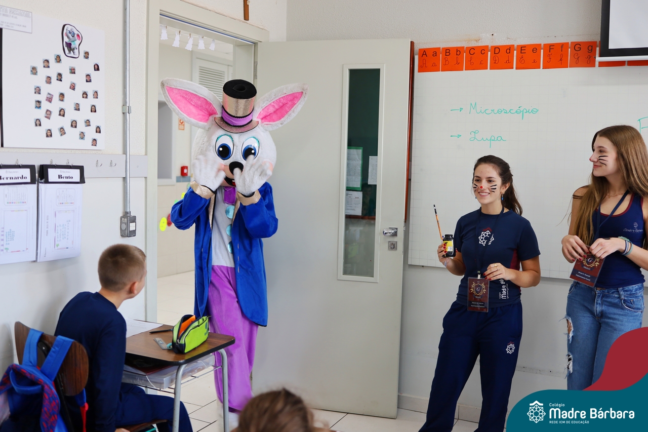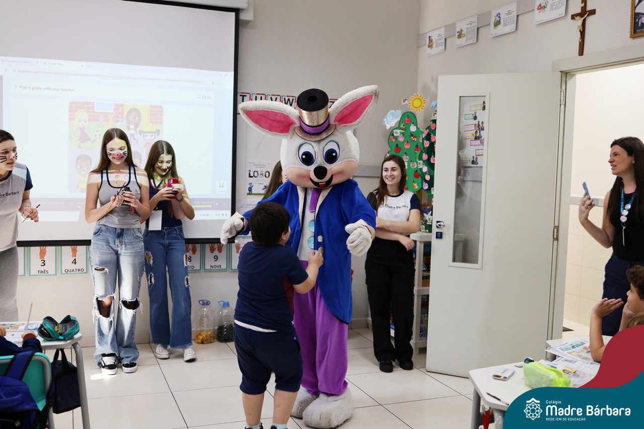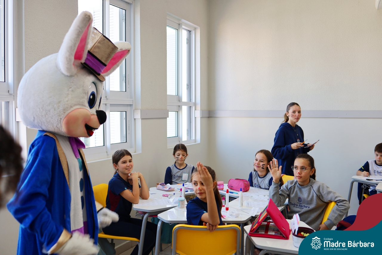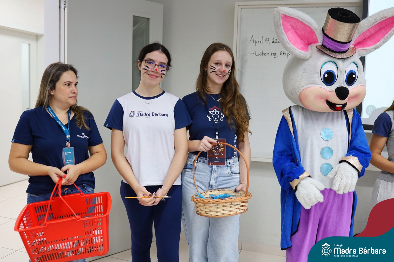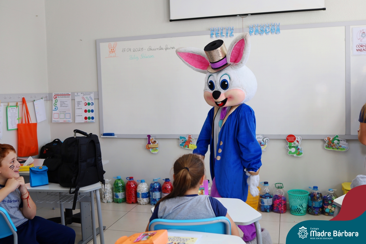 Na quinta-feira (17.04) as turmas da Educação Infantil ao Ensino Médio receberam a visita do Coelho da Páscoa do Grêmio Estudantil (Gembar). No Ensino Médio, o Gembar esteve acompanhado pela coordenação pedagógica, que entregou um mimo para os alunos e professores. Já na Educação Infantil e nos Anos Iniciais, as crianças aproveitaram para abraçar e fazer fotos com o amigo Coelho, já que ele havia deixado o ninho escondido por espaços do Colégio. Foi um dia muito alegre e feliz. Parabéns para o Gembar pela dedicação e por tornar o dia das crianças mais encantador e especial.