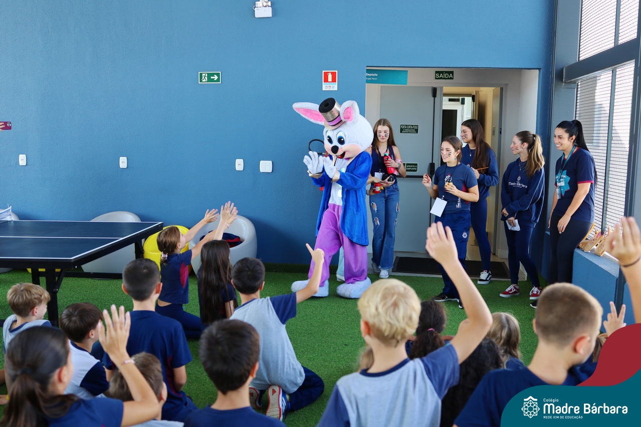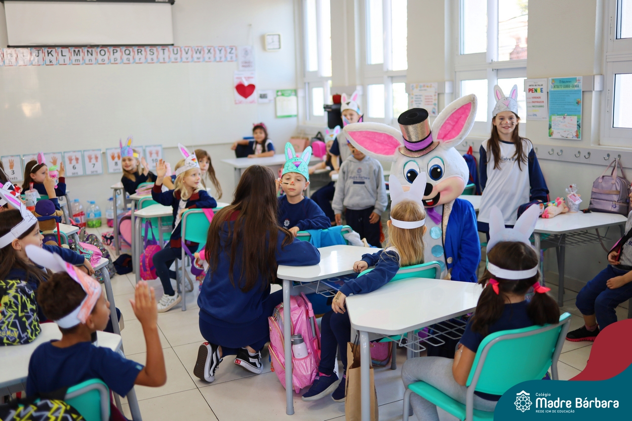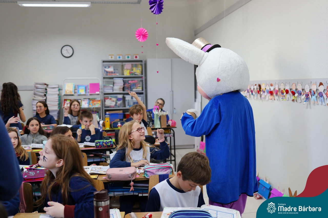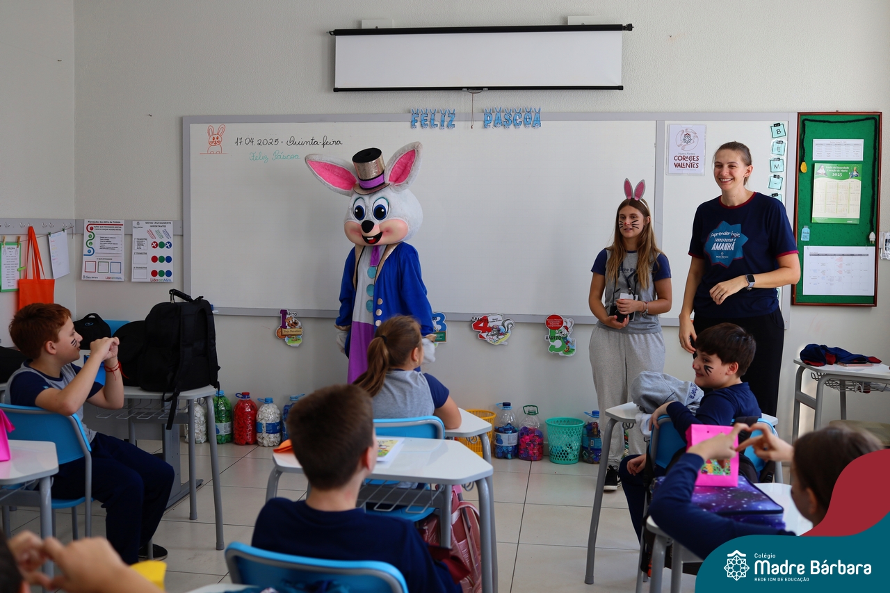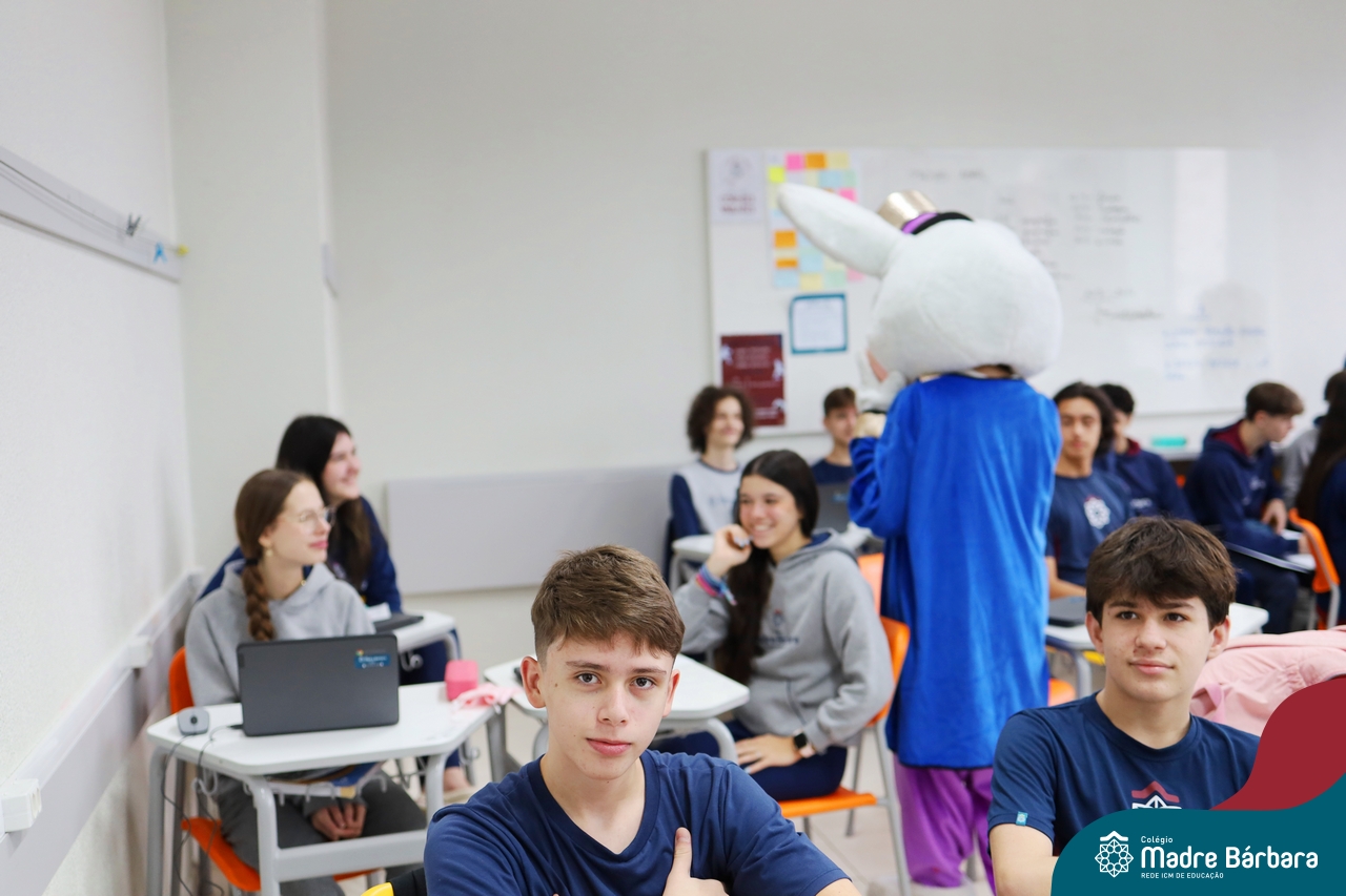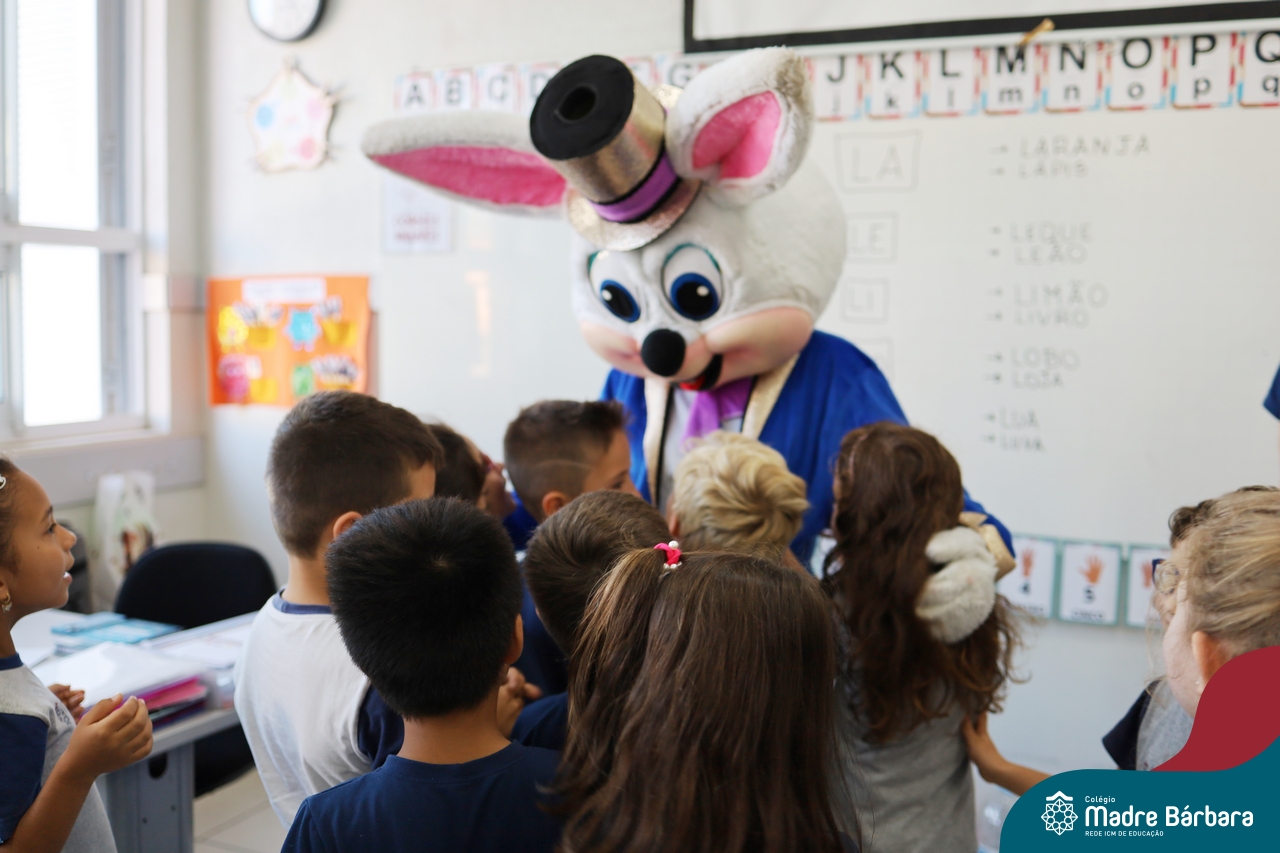 Na quinta-feira (17.04) as turmas da Educação Infantil ao Ensino Médio receberam a visita do Coelho da Páscoa do Grêmio Estudantil (Gembar). No Ensino Médio, o Gembar esteve acompanhado pela coordenação pedagógica, que entregou um mimo para os alunos e professores. Já na Educação Infantil e nos Anos Iniciais, as crianças aproveitaram para abraçar e fazer fotos com o amigo Coelho, já que ele havia deixado o ninho escondido por espaços do Colégio. Foi um dia muito alegre e feliz. Parabéns para o Gembar pela dedicação e por tornar o dia das crianças mais encantador e especial.