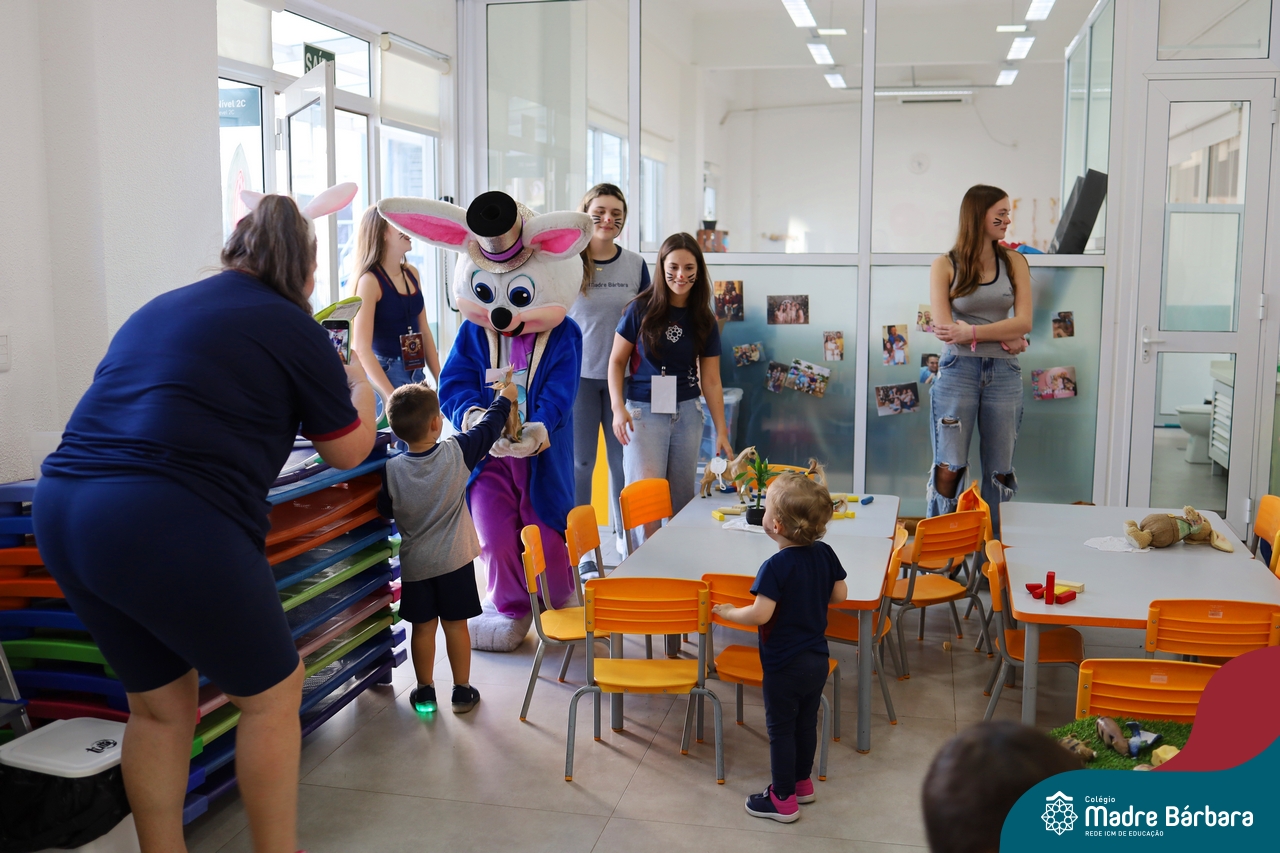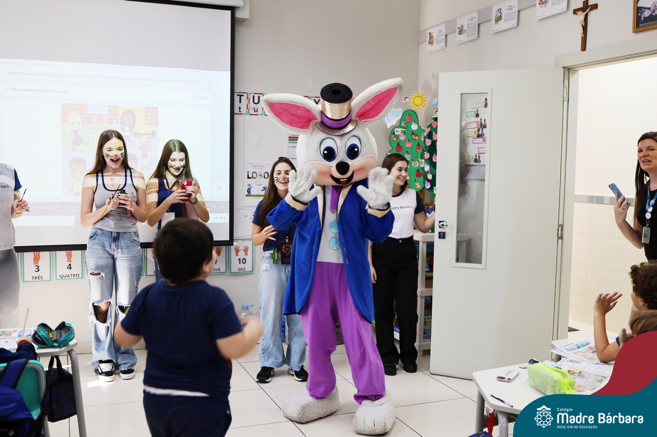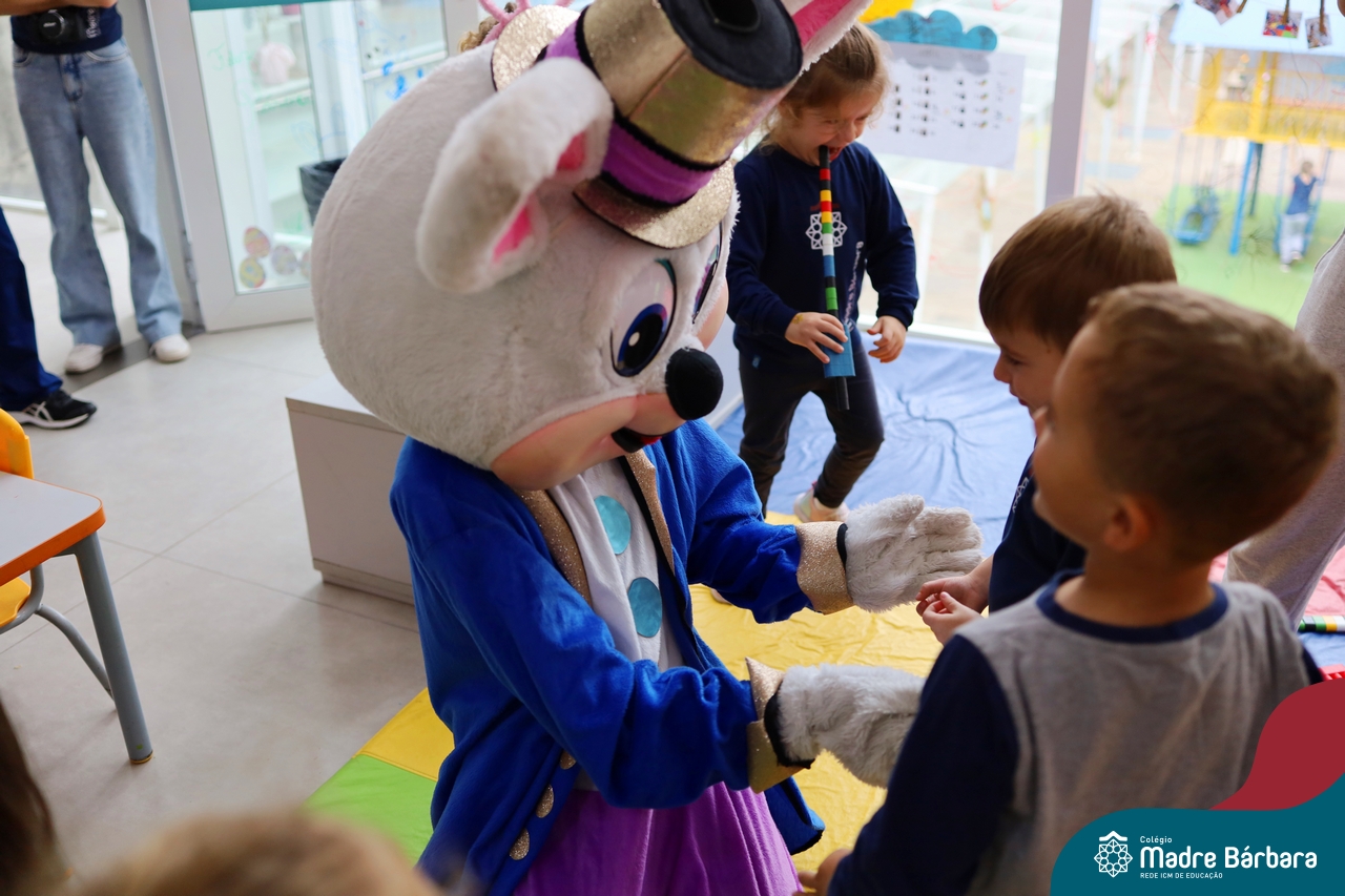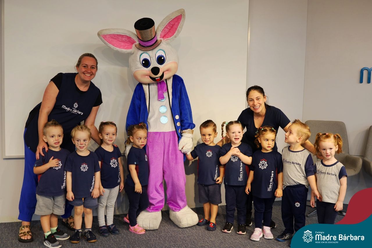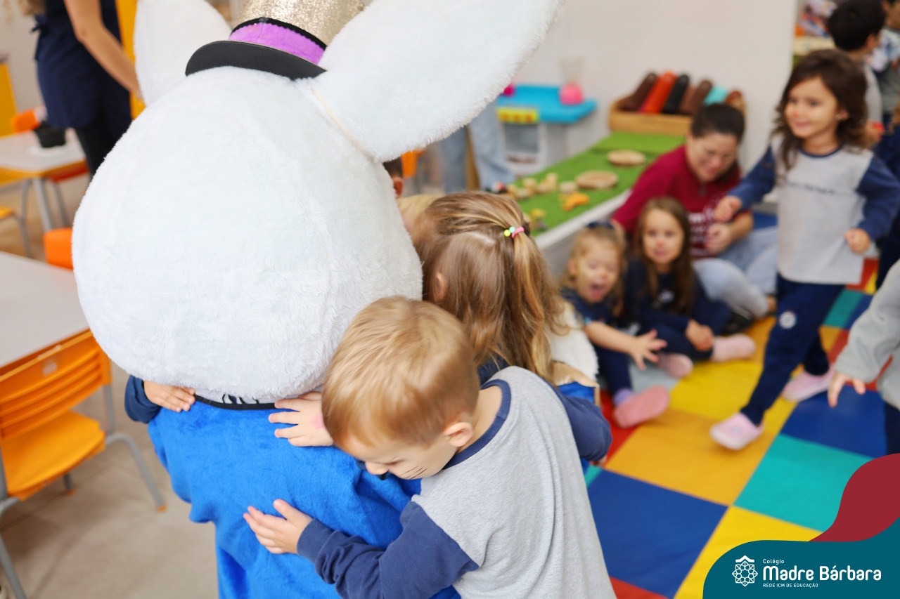 Na quinta-feira (17.04) as turmas da Educação Infantil ao Ensino Médio receberam a visita do Coelho da Páscoa do Grêmio Estudantil (Gembar). No Ensino Médio, o Gembar esteve acompanhado pela coordenação pedagógica, que entregou um mimo para os alunos e professores. Já na Educação Infantil e nos Anos Iniciais, as crianças aproveitaram para abraçar e fazer fotos com o amigo Coelho, já que ele havia deixado o ninho escondido por espaços do Colégio. Foi um dia muito alegre e feliz. Parabéns para o Gembar pela dedicação e por tornar o dia das crianças mais encantador e especial.
