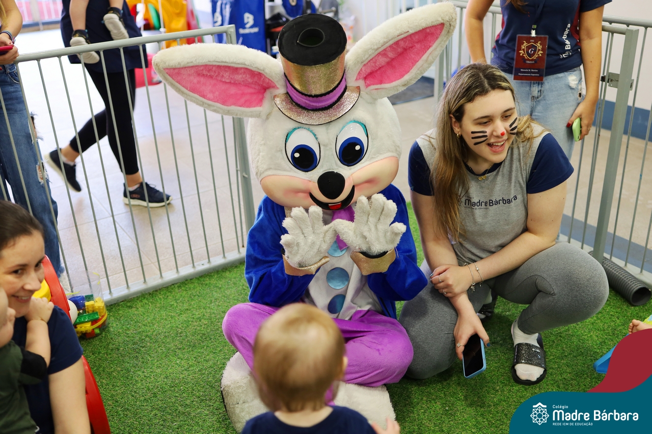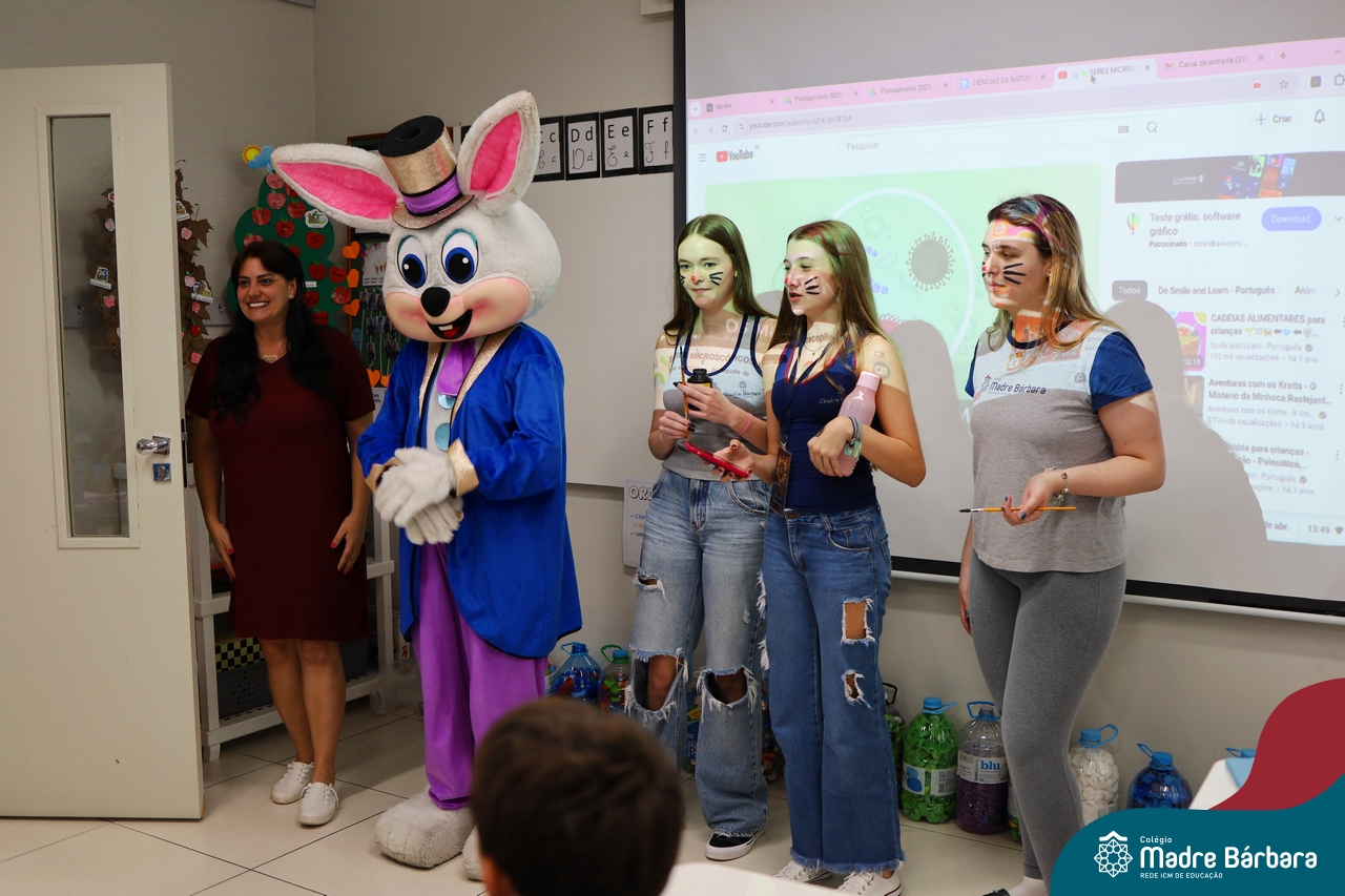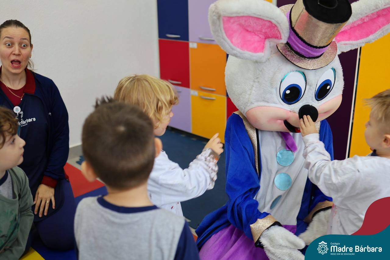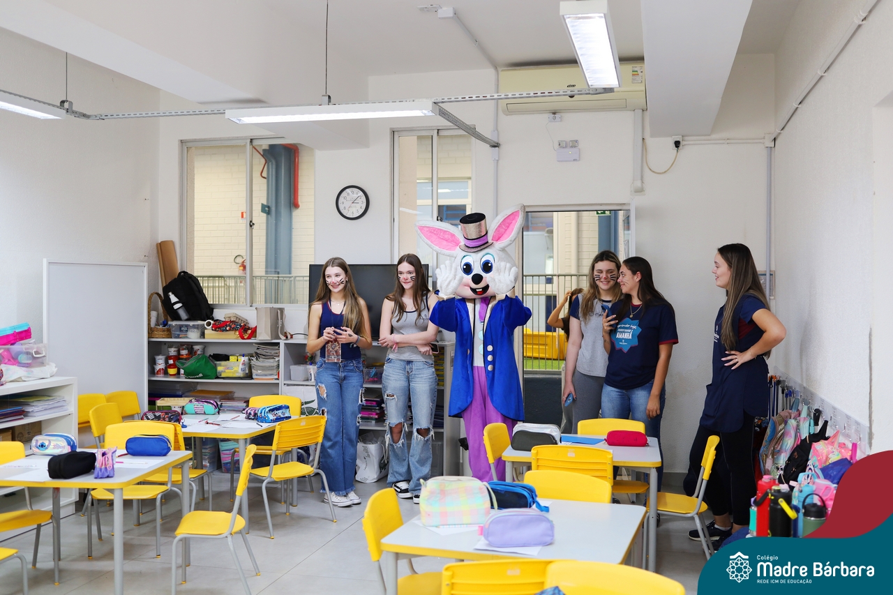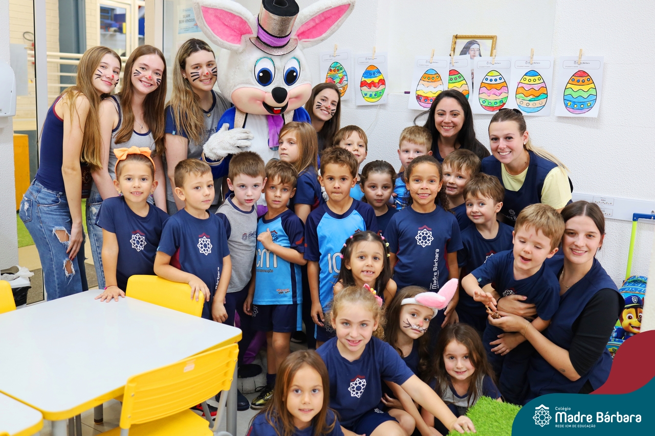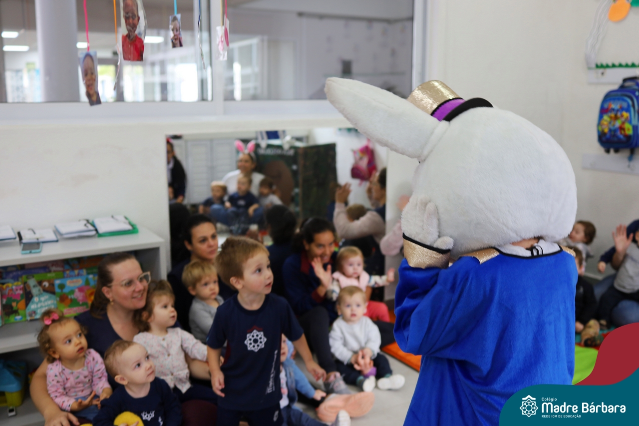 Na quinta-feira (17.04) as turmas da Educação Infantil ao Ensino Médio receberam a visita do Coelho da Páscoa do Grêmio Estudantil (Gembar). No Ensino Médio, o Gembar esteve acompanhado pela coordenação pedagógica, que entregou um mimo para os alunos e professores. Já na Educação Infantil e nos Anos Iniciais, as crianças aproveitaram para abraçar e fazer fotos com o amigo Coelho, já que ele havia deixado o ninho escondido por espaços do Colégio. Foi um dia muito alegre e feliz. Parabéns para o Gembar pela dedicação e por tornar o dia das crianças mais encantador e especial.