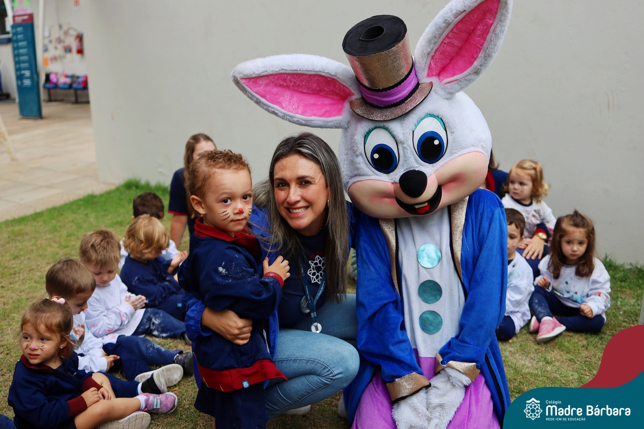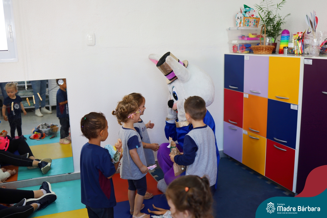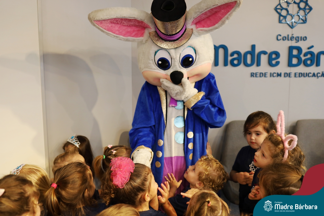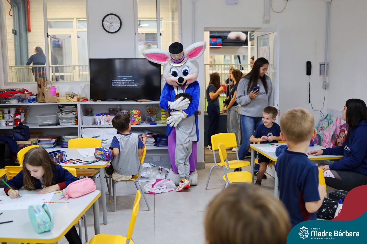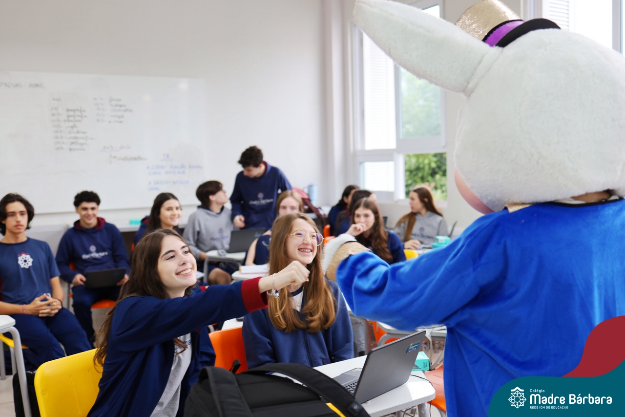 Na quinta-feira (17.04) as turmas da Educação Infantil ao Ensino Médio receberam a visita do Coelho da Páscoa do Grêmio Estudantil (Gembar). No Ensino Médio, o Gembar esteve acompanhado pela coordenação pedagógica, que entregou um mimo para os alunos e professores. Já na Educação Infantil e nos Anos Iniciais, as crianças aproveitaram para abraçar e fazer fotos com o amigo Coelho, já que ele havia deixado o ninho escondido por espaços do Colégio. Foi um dia muito alegre e feliz. Parabéns para o Gembar pela dedicação e por tornar o dia das crianças mais encantador e especial.