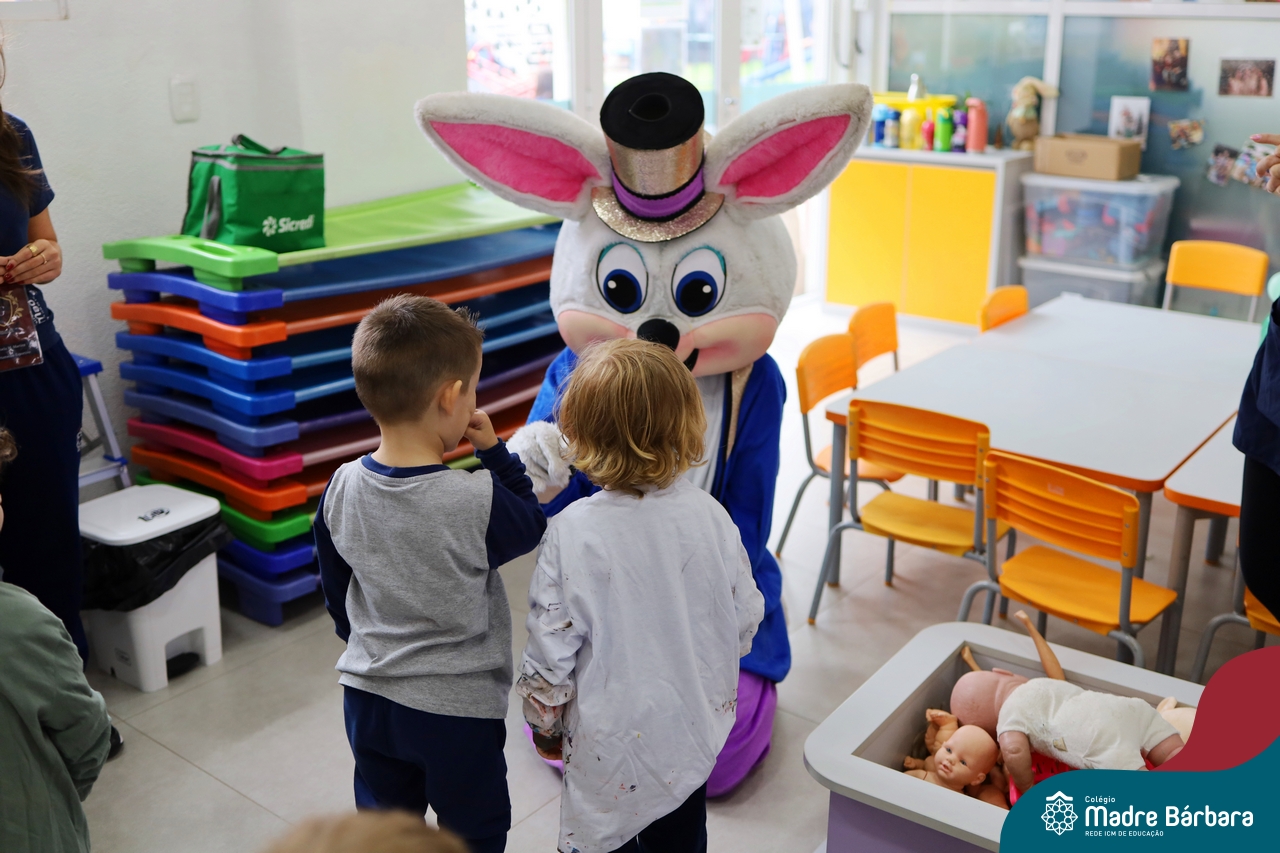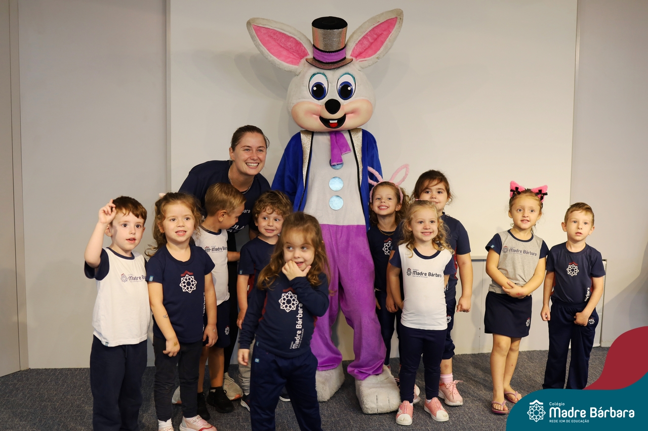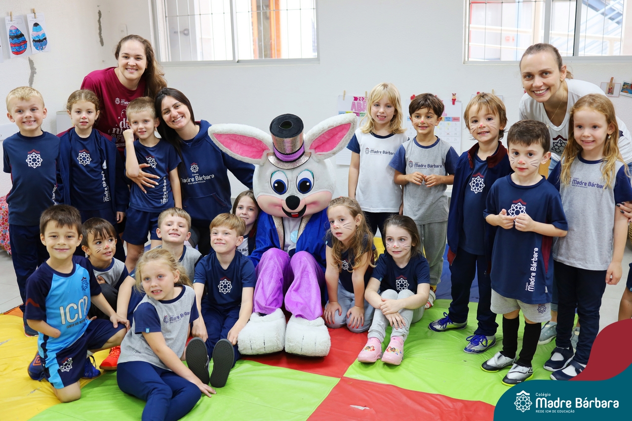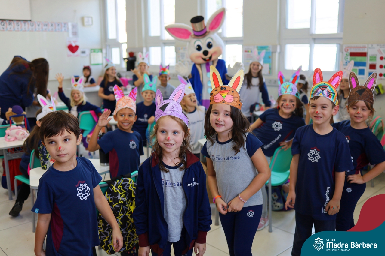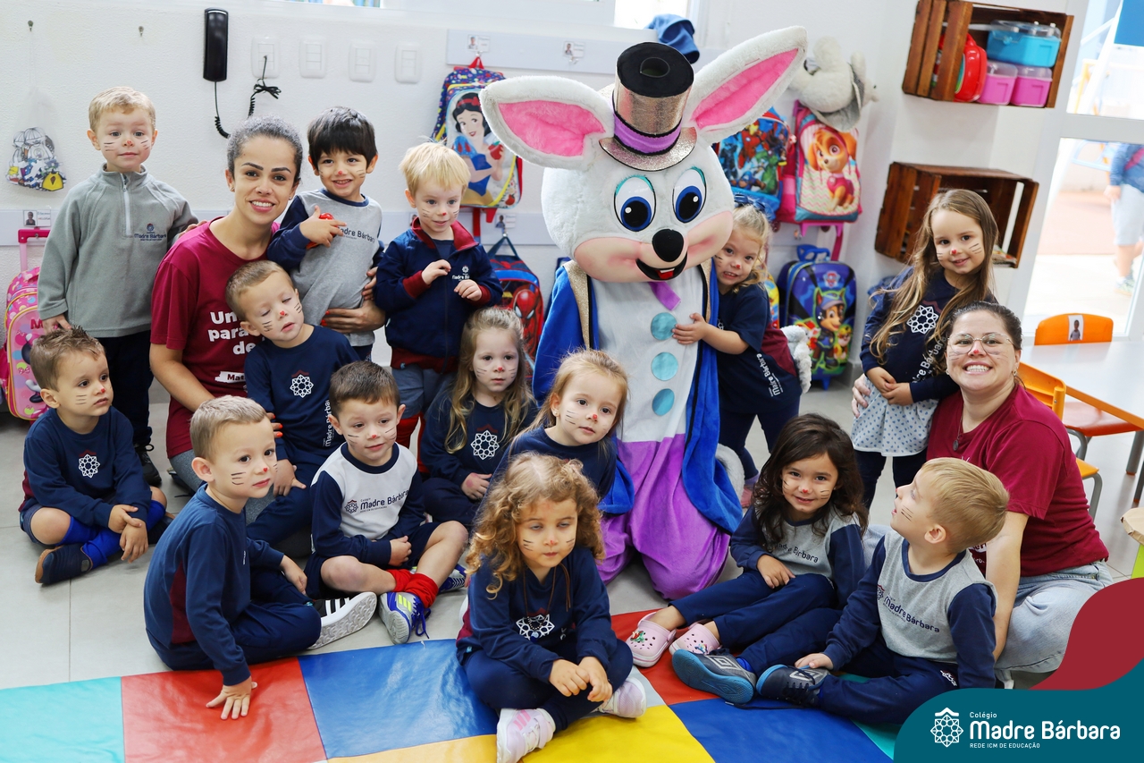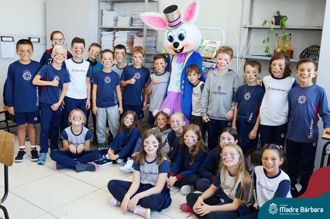Na quinta-feira (17.04) as turmas da Educação Infantil ao Ensino Médio receberam a visita do Coelho da Páscoa do Grêmio Estudantil (Gembar). No Ensino Médio, o Gembar esteve acompanhado pela coordenação pedagógica, que entregou um mimo para os alunos e professores. Já na Educação Infantil e nos Anos Iniciais, as crianças aproveitaram para abraçar e fazer fotos com o amigo Coelho, já que ele havia deixado o ninho escondido por espaços do Colégio. Foi um dia muito alegre e feliz. Parabéns para o Gembar pela dedicação e por tornar o dia das crianças mais encantador e especial.