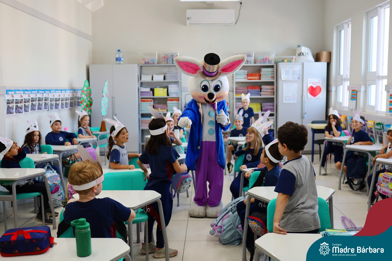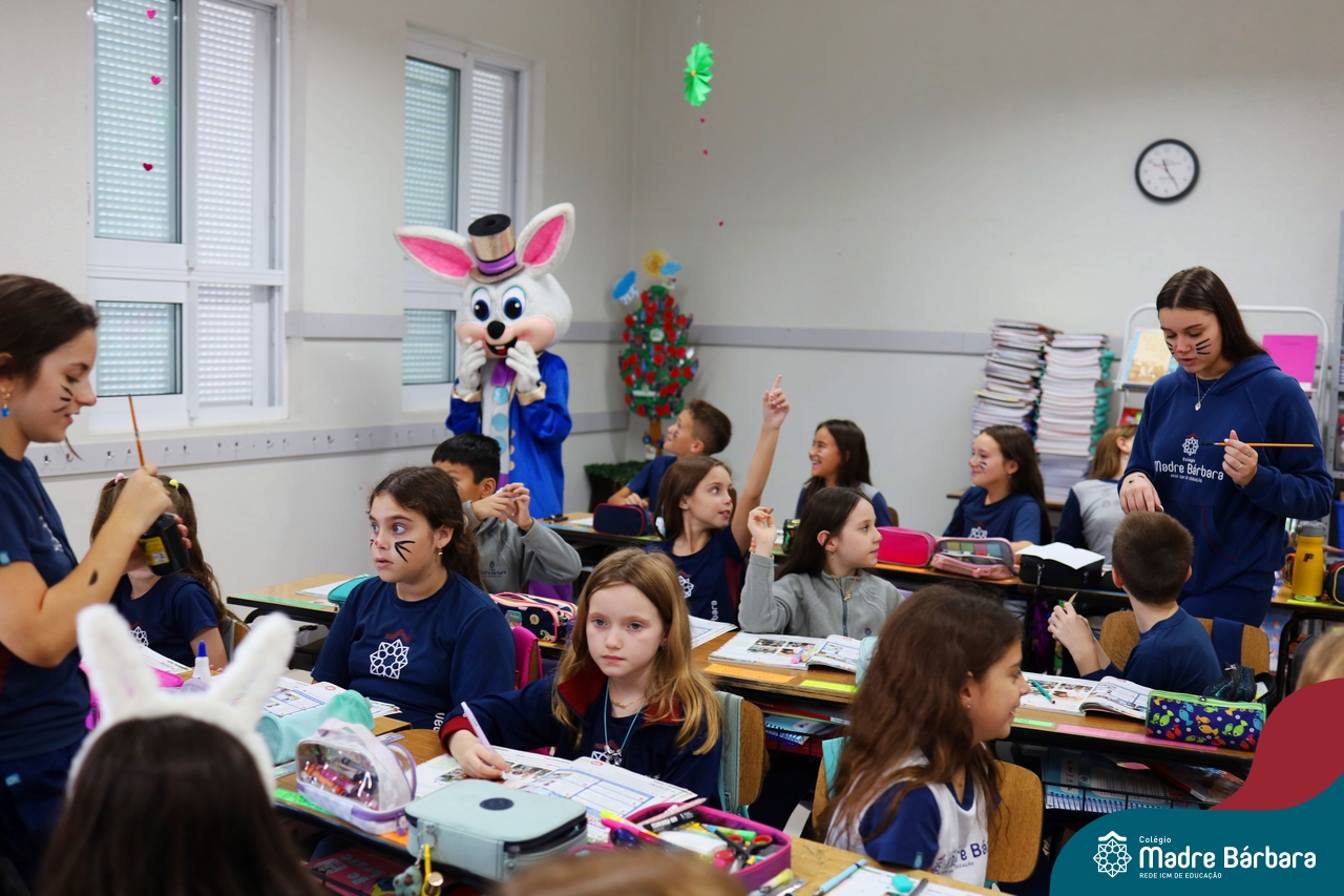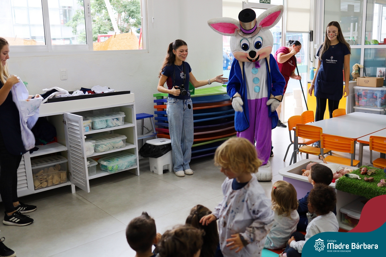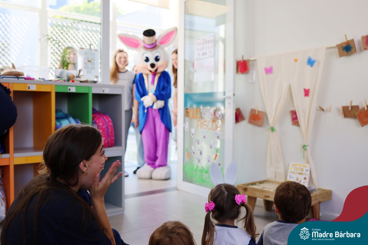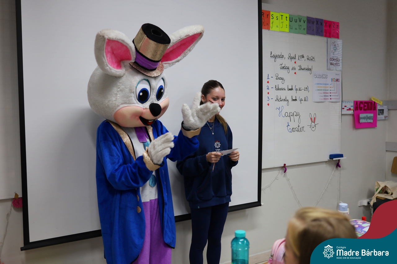 Na quinta-feira (17.04) as turmas da Educação Infantil ao Ensino Médio receberam a visita do Coelho da Páscoa do Grêmio Estudantil (Gembar). No Ensino Médio, o Gembar esteve acompanhado pela coordenação pedagógica, que entregou um mimo para os alunos e professores. Já na Educação Infantil e nos Anos Iniciais, as crianças aproveitaram para abraçar e fazer fotos com o amigo Coelho, já que ele havia deixado o ninho escondido por espaços do Colégio. Foi um dia muito alegre e feliz. Parabéns para o Gembar pela dedicação e por tornar o dia das crianças mais encantador e especial.
