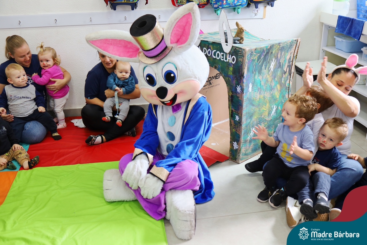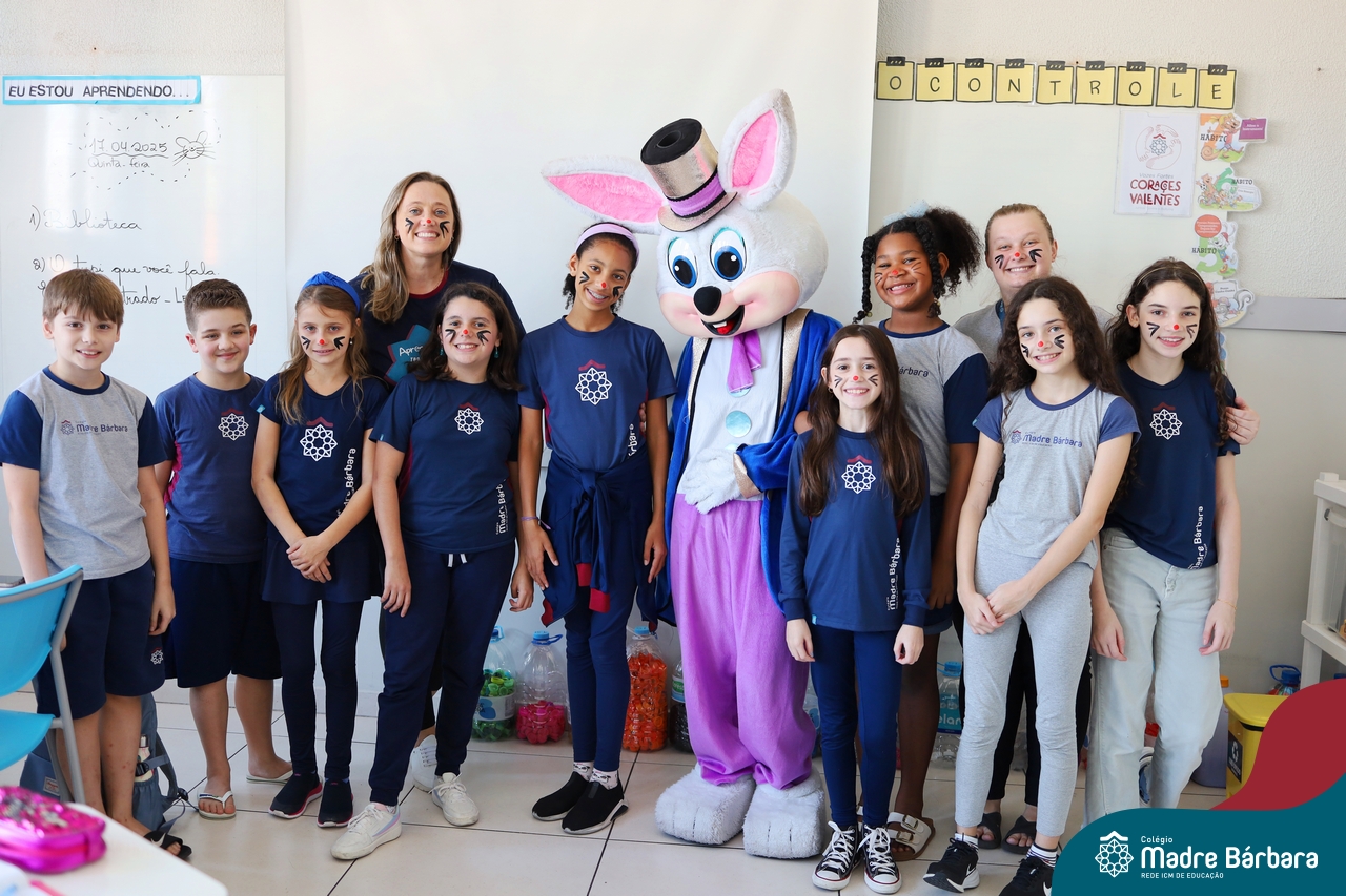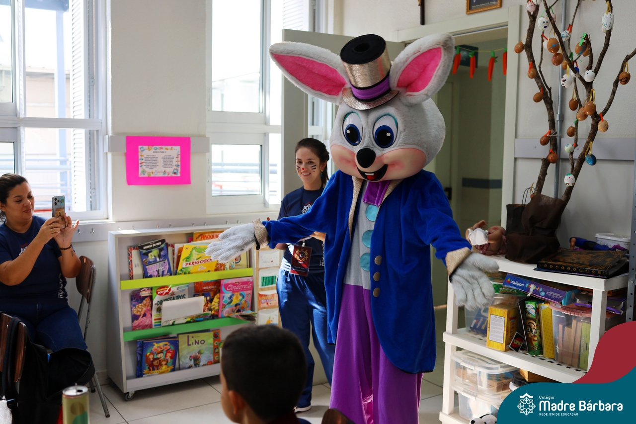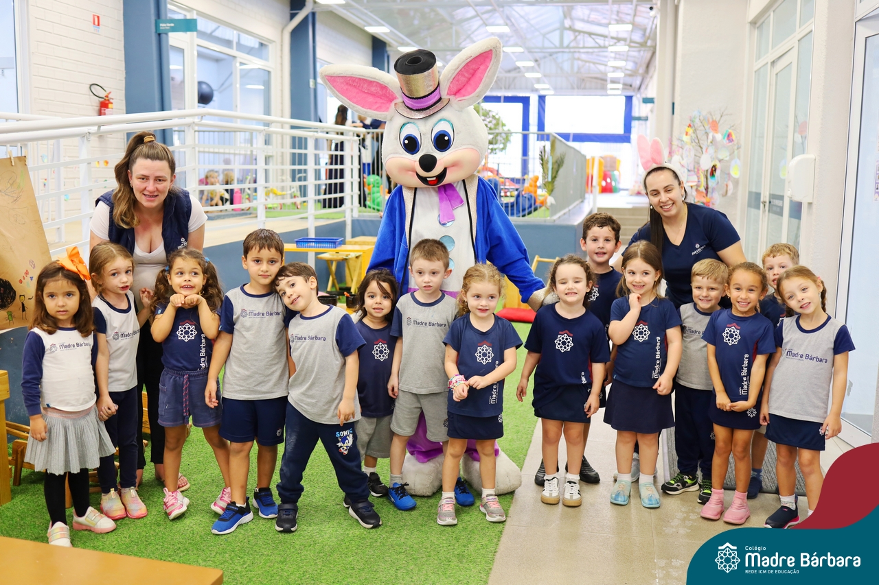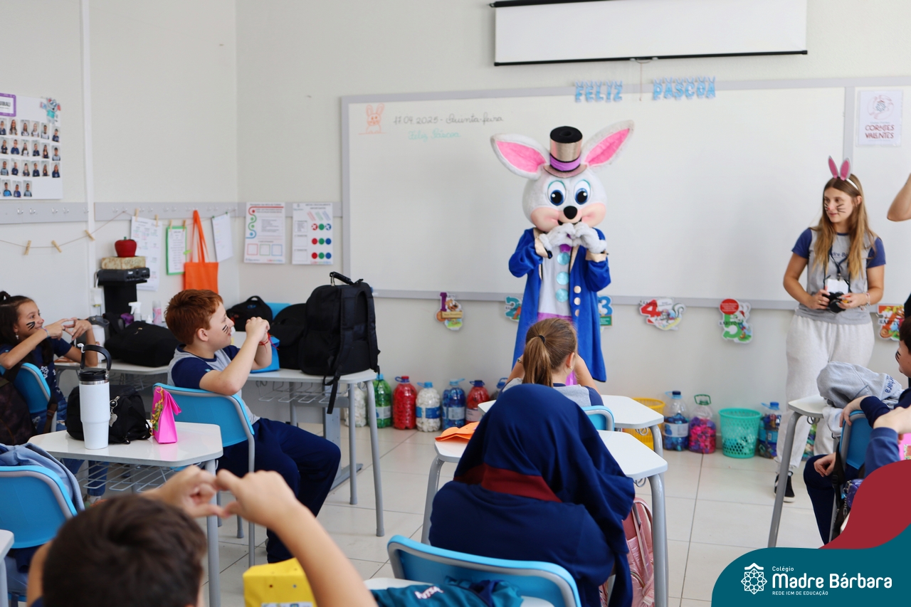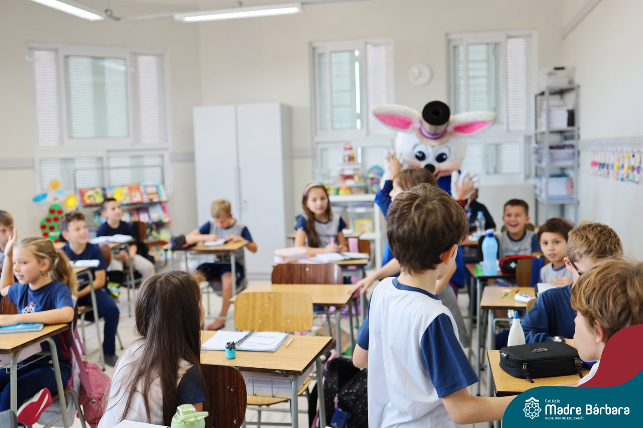 Na quinta-feira (17.04) as turmas da Educação Infantil ao Ensino Médio receberam a visita do Coelho da Páscoa do Grêmio Estudantil (Gembar). No Ensino Médio, o Gembar esteve acompanhado pela coordenação pedagógica, que entregou um mimo para os alunos e professores. Já na Educação Infantil e nos Anos Iniciais, as crianças aproveitaram para abraçar e fazer fotos com o amigo Coelho, já que ele havia deixado o ninho escondido por espaços do Colégio. Foi um dia muito alegre e feliz. Parabéns para o Gembar pela dedicação e por tornar o dia das crianças mais encantador e especial.