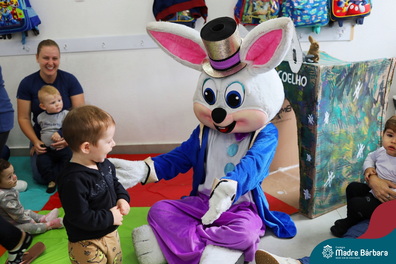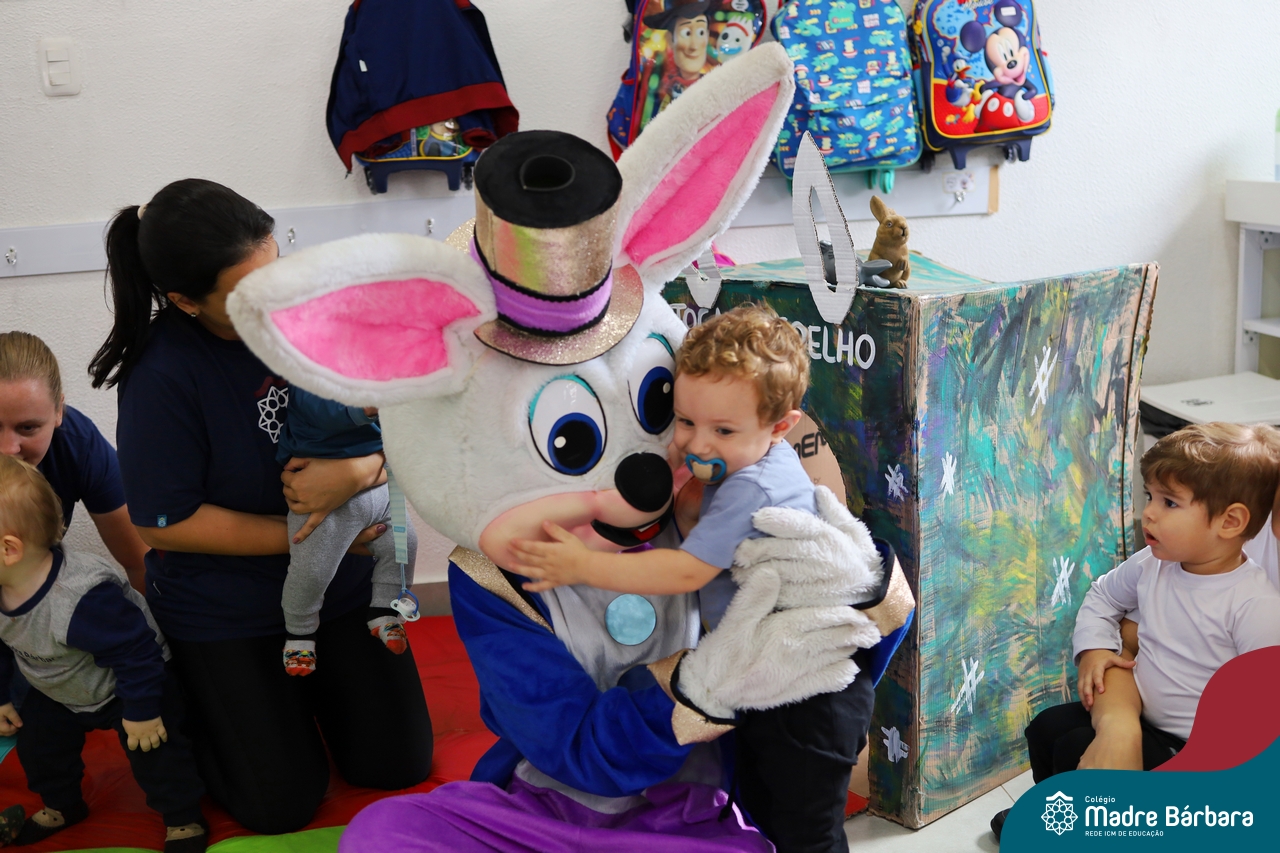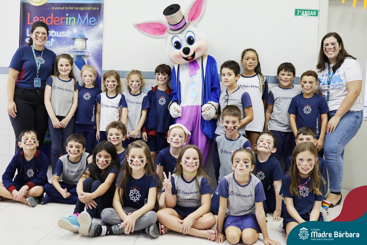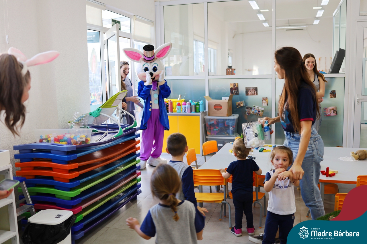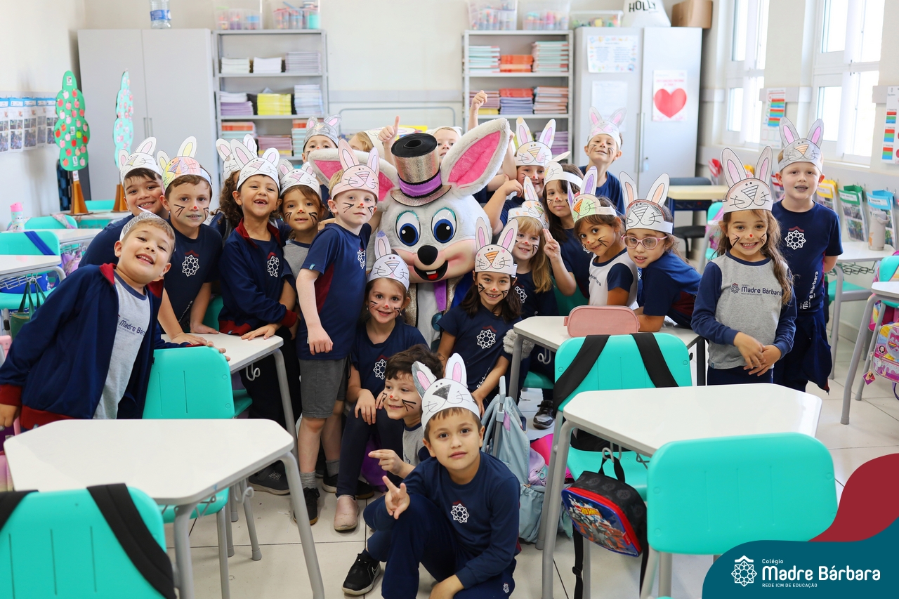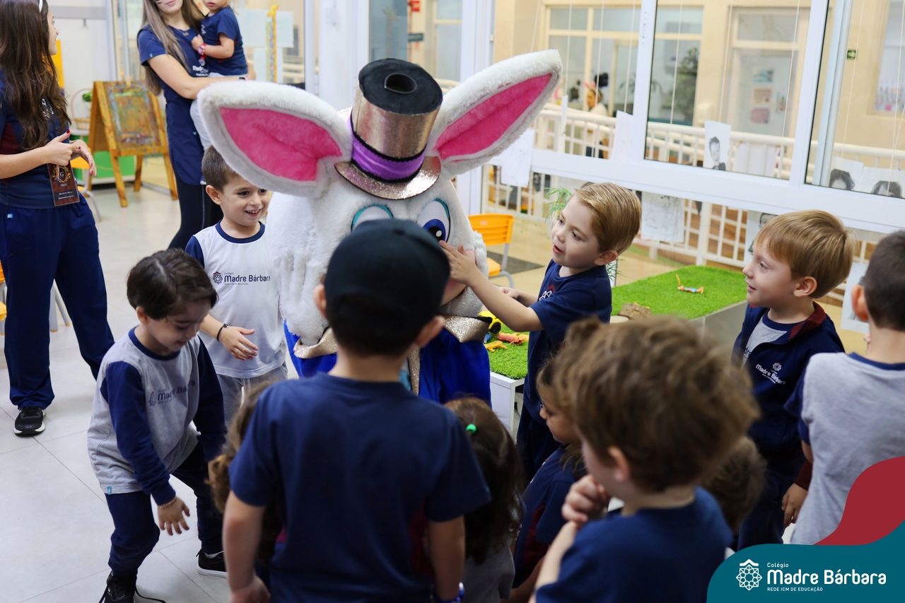 Na quinta-feira (17.04) as turmas da Educação Infantil ao Ensino Médio receberam a visita do Coelho da Páscoa do Grêmio Estudantil (Gembar). No Ensino Médio, o Gembar esteve acompanhado pela coordenação pedagógica, que entregou um mimo para os alunos e professores. Já na Educação Infantil e nos Anos Iniciais, as crianças aproveitaram para abraçar e fazer fotos com o amigo Coelho, já que ele havia deixado o ninho escondido por espaços do Colégio. Foi um dia muito alegre e feliz. Parabéns para o Gembar pela dedicação e por tornar o dia das crianças mais encantador e especial.