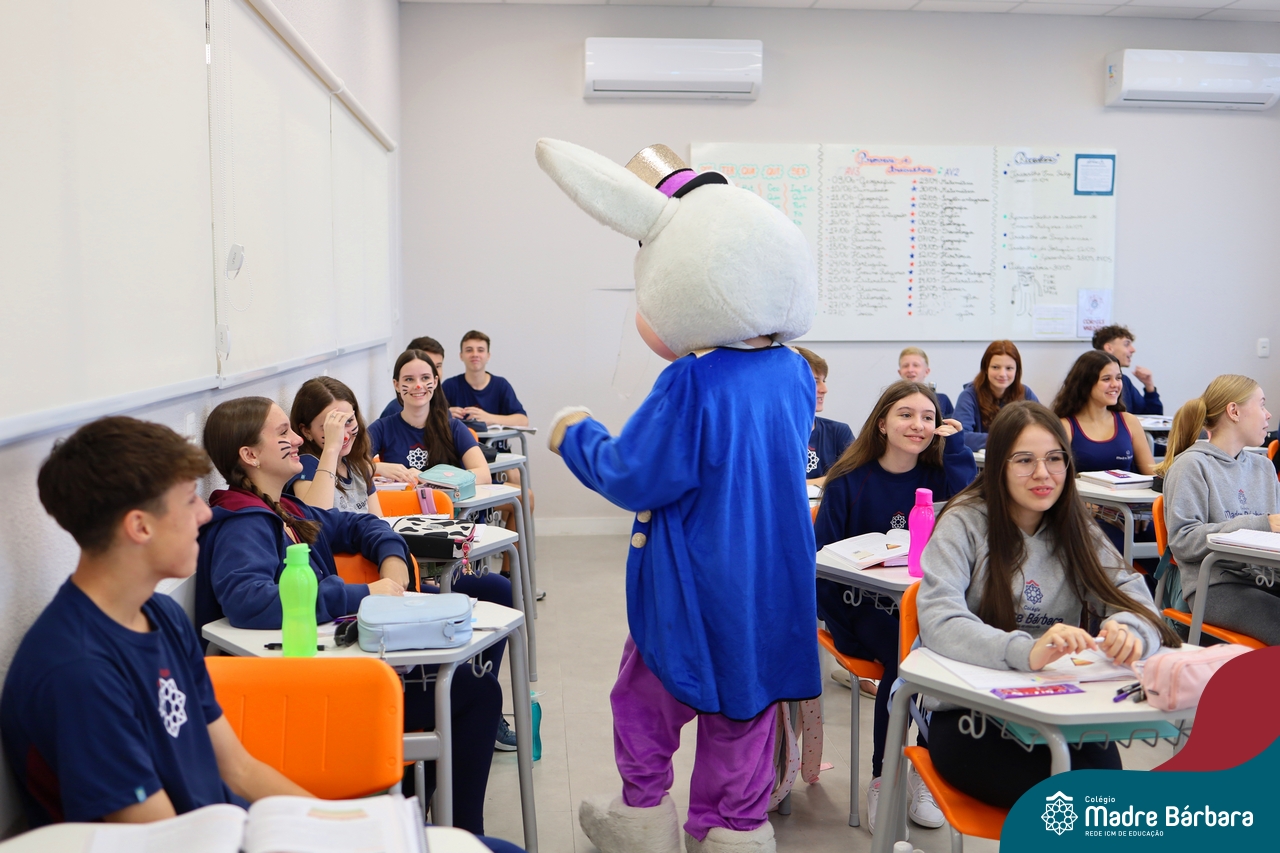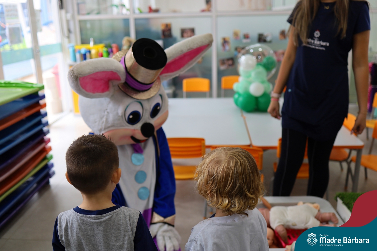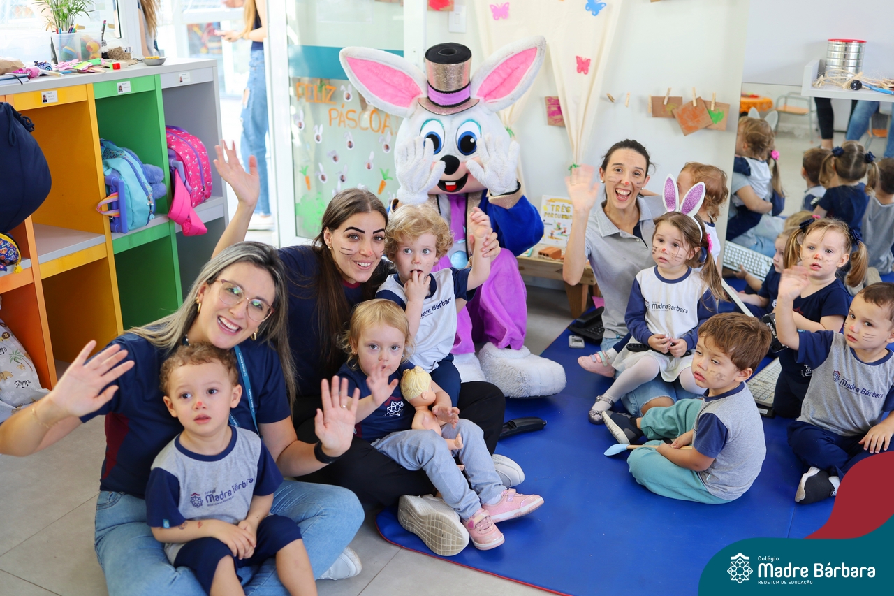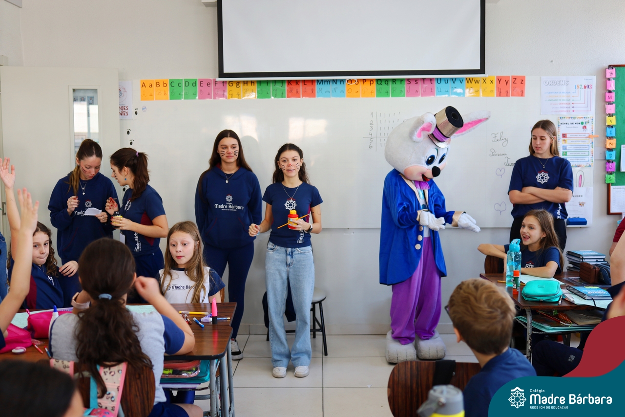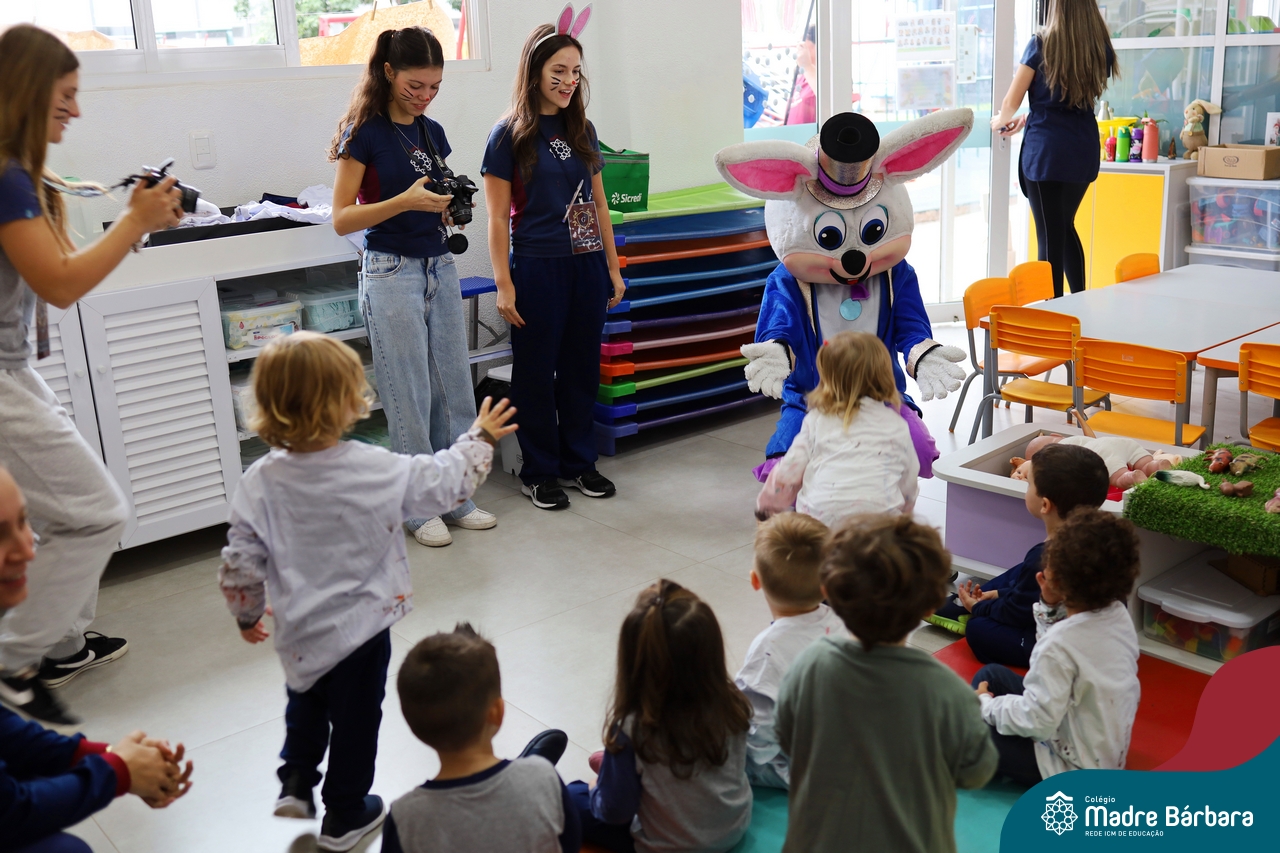Na quinta-feira (17.04) as turmas da Educação Infantil ao Ensino Médio receberam a visita do Coelho da Páscoa do Grêmio Estudantil (Gembar). No Ensino Médio, o Gembar esteve acompanhado pela coordenação pedagógica, que entregou um mimo para os alunos e professores. Já na Educação Infantil e nos Anos Iniciais, as crianças aproveitaram para abraçar e fazer fotos com o amigo Coelho, já que ele havia deixado o ninho escondido por espaços do Colégio. Foi um dia muito alegre e feliz. Parabéns para o Gembar pela dedicação e por tornar o dia das crianças mais encantador e especial.