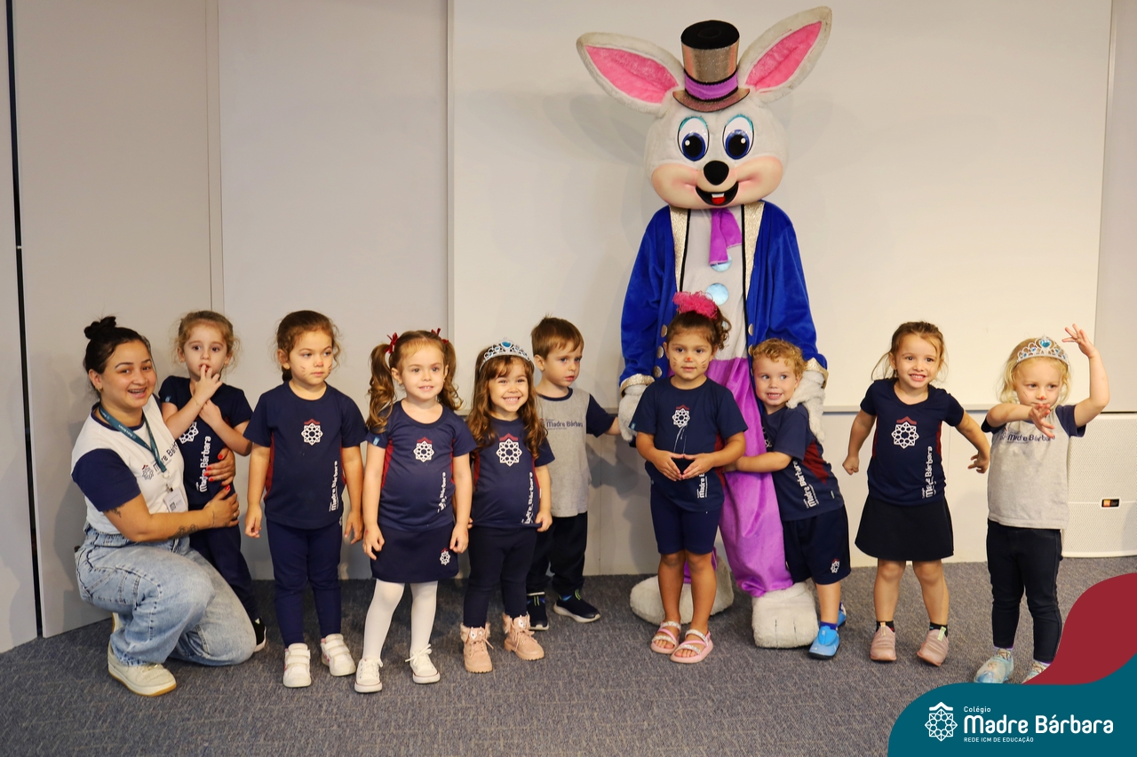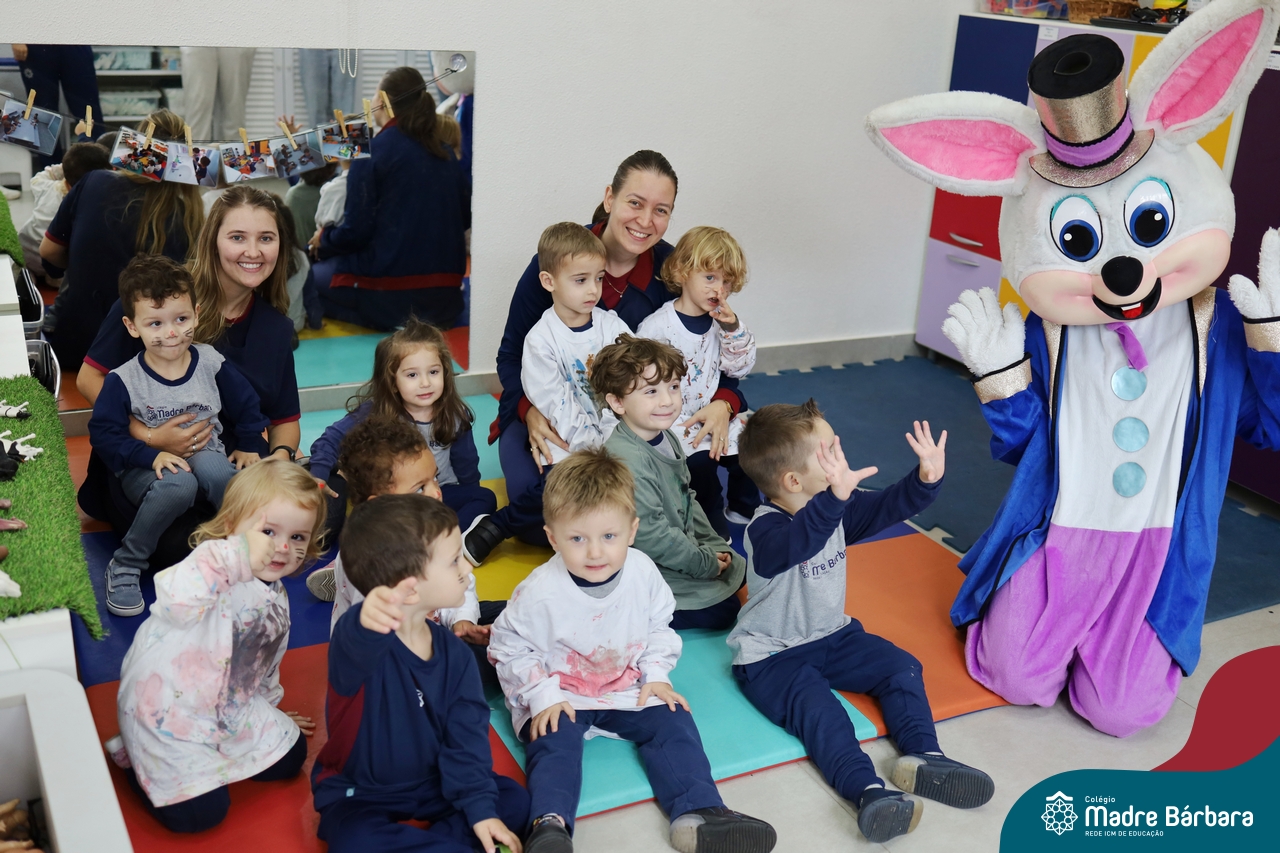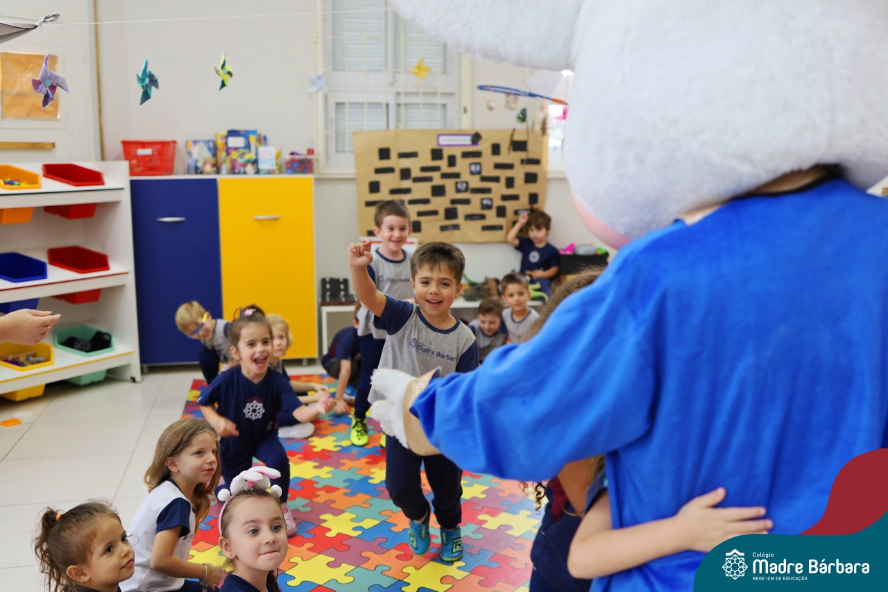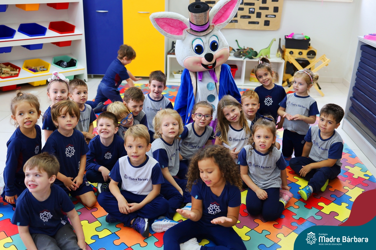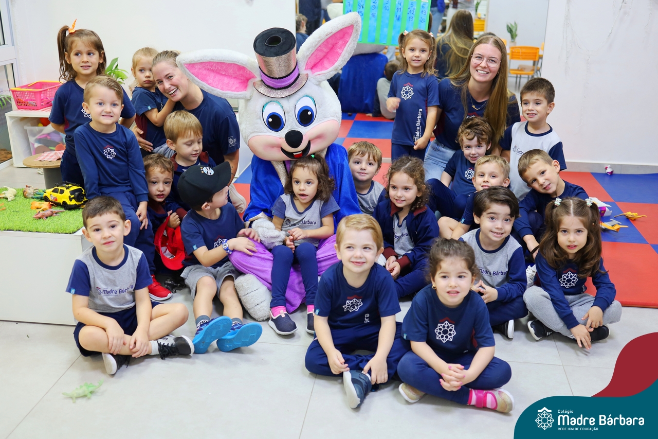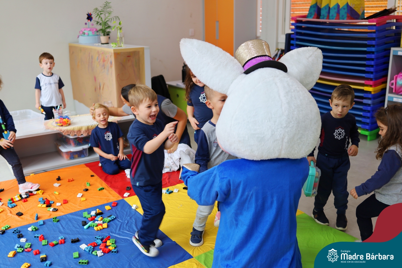 Na quinta-feira (17.04) as turmas da Educação Infantil ao Ensino Médio receberam a visita do Coelho da Páscoa do Grêmio Estudantil (Gembar). No Ensino Médio, o Gembar esteve acompanhado pela coordenação pedagógica, que entregou um mimo para os alunos e professores. Já na Educação Infantil e nos Anos Iniciais, as crianças aproveitaram para abraçar e fazer fotos com o amigo Coelho, já que ele havia deixado o ninho escondido por espaços do Colégio. Foi um dia muito alegre e feliz. Parabéns para o Gembar pela dedicação e por tornar o dia das crianças mais encantador e especial.