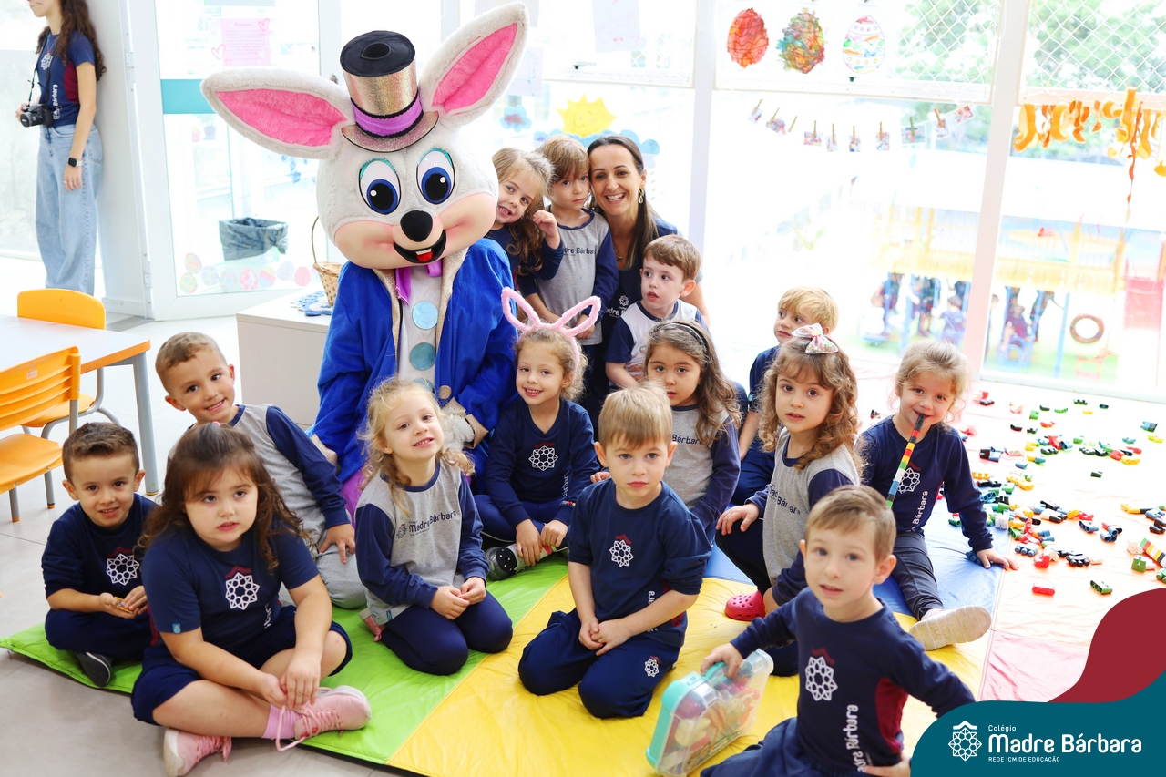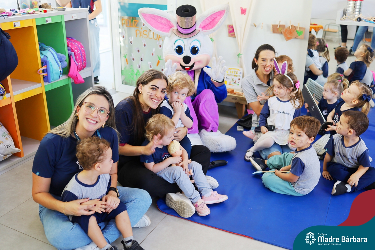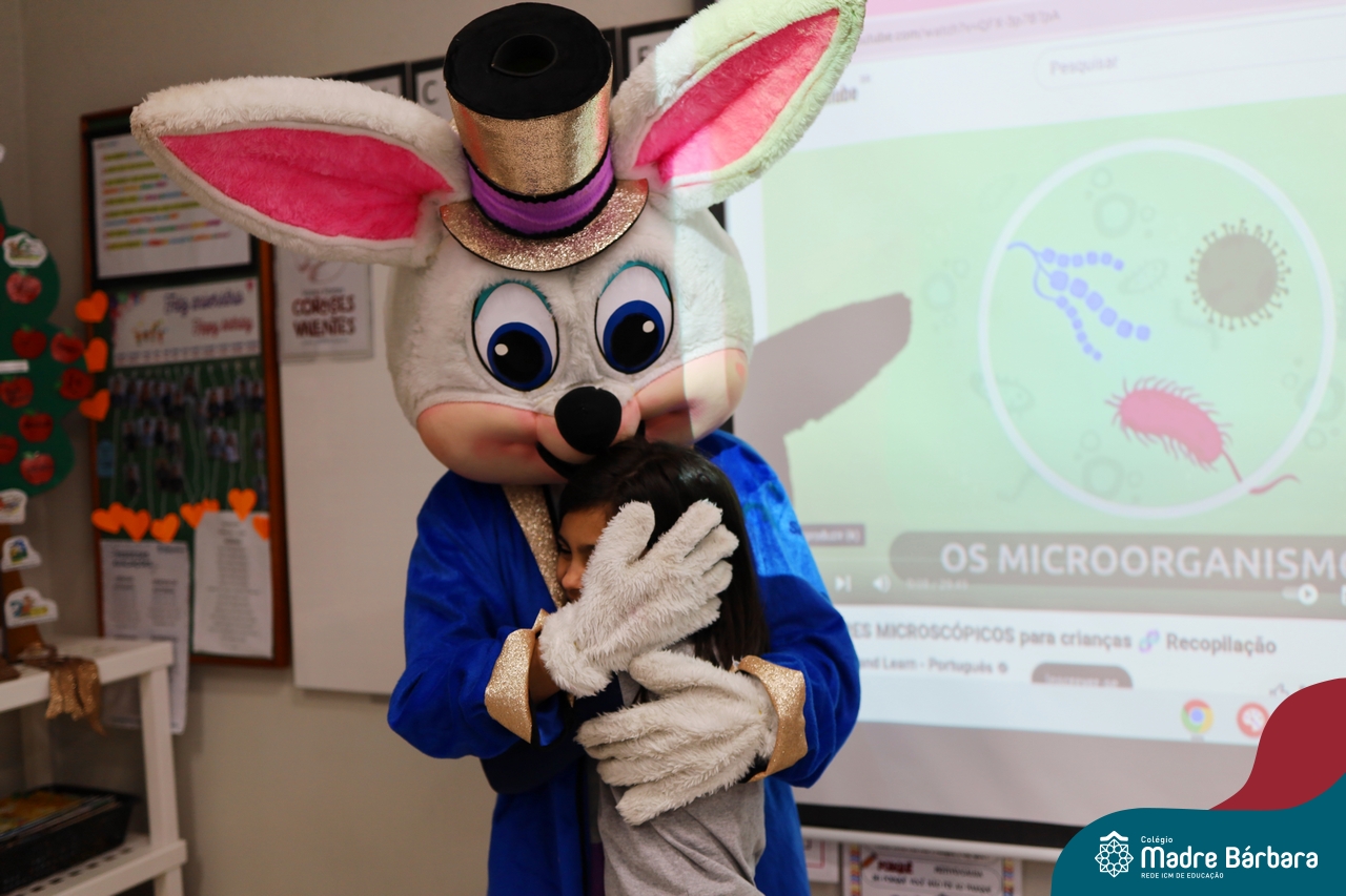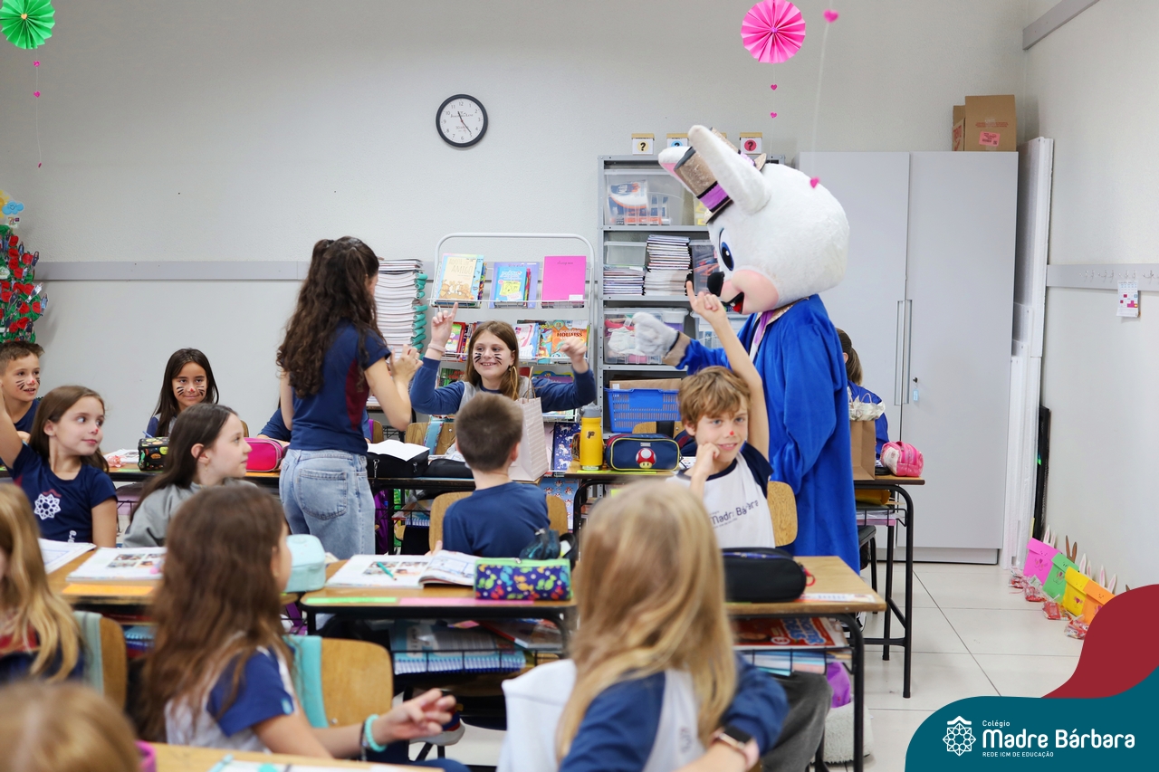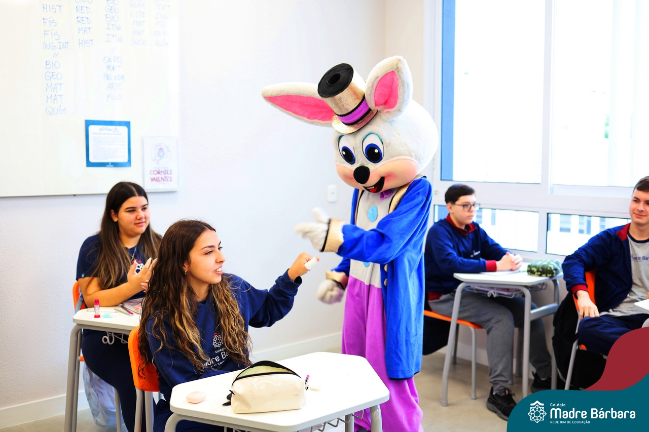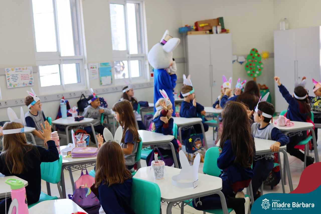 Na quinta-feira (17.04) as turmas da Educação Infantil ao Ensino Médio receberam a visita do Coelho da Páscoa do Grêmio Estudantil (Gembar). No Ensino Médio, o Gembar esteve acompanhado pela coordenação pedagógica, que entregou um mimo para os alunos e professores. Já na Educação Infantil e nos Anos Iniciais, as crianças aproveitaram para abraçar e fazer fotos com o amigo Coelho, já que ele havia deixado o ninho escondido por espaços do Colégio. Foi um dia muito alegre e feliz. Parabéns para o Gembar pela dedicação e por tornar o dia das crianças mais encantador e especial.