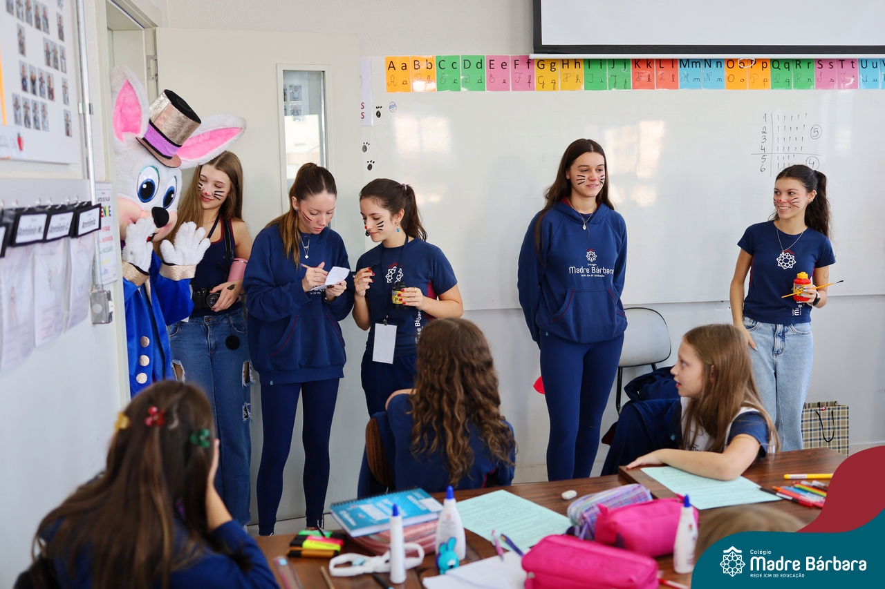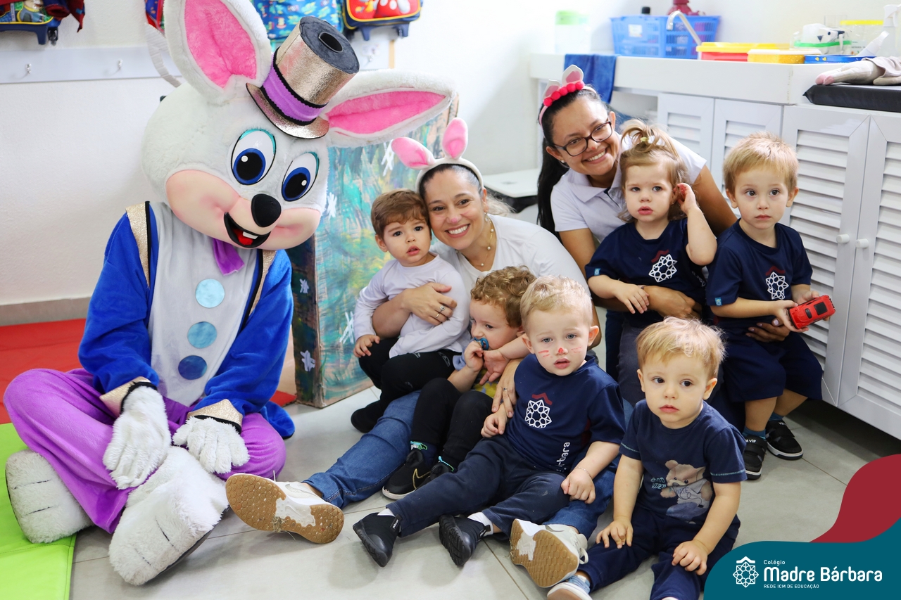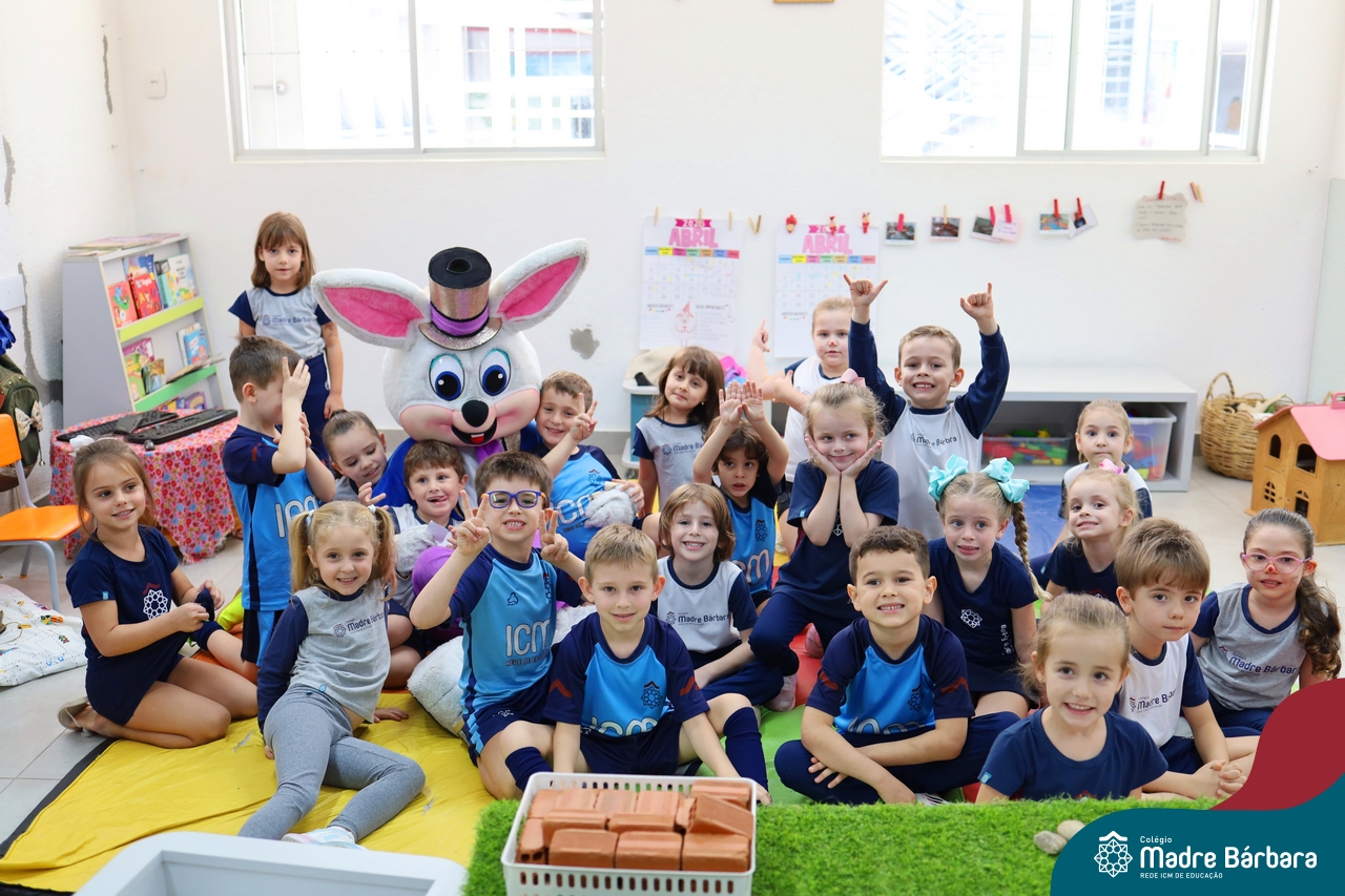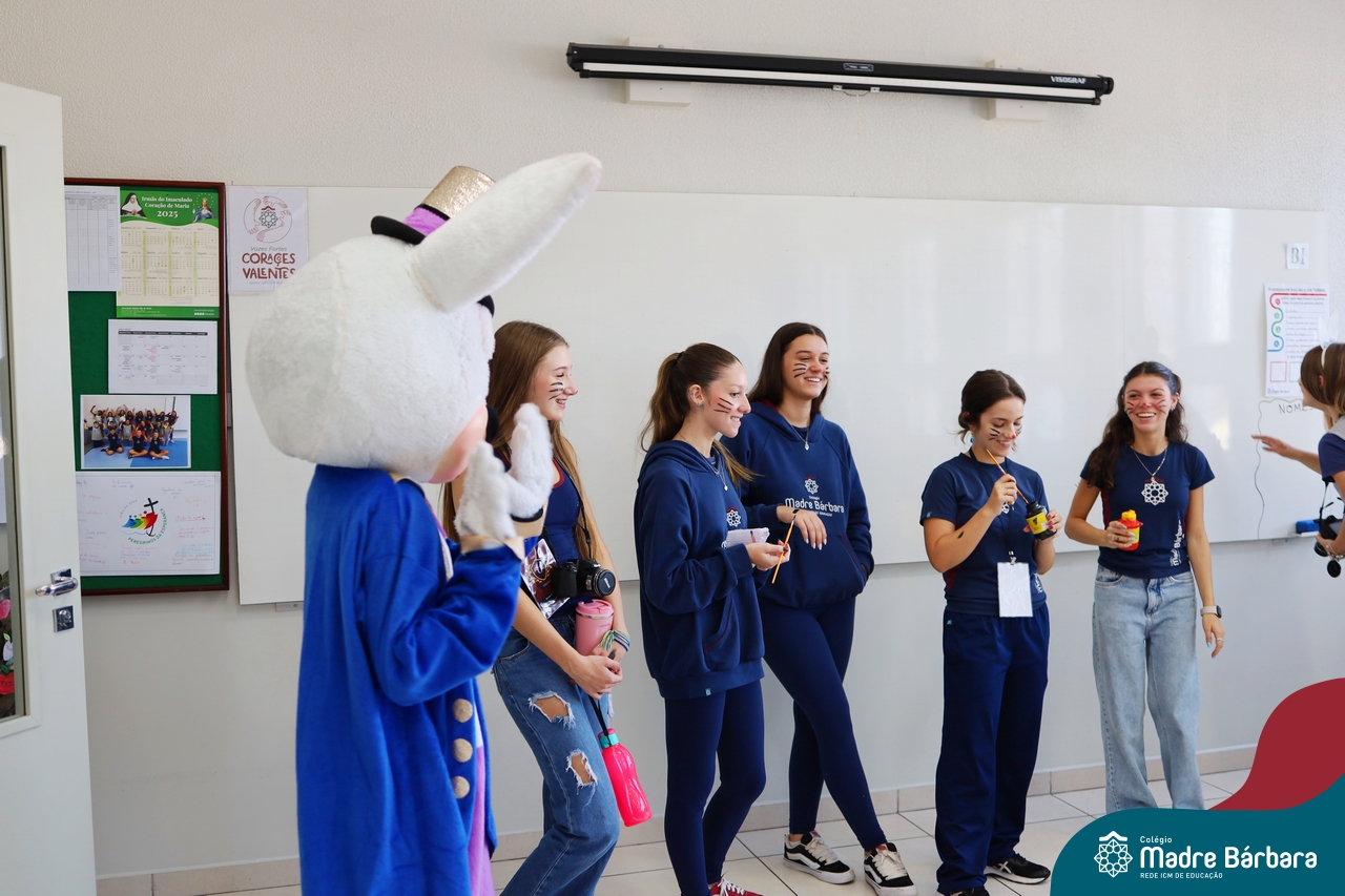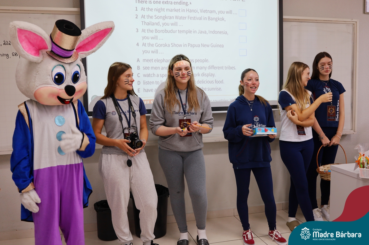 Na quinta-feira (17.04) as turmas da Educação Infantil ao Ensino Médio receberam a visita do Coelho da Páscoa do Grêmio Estudantil (Gembar). No Ensino Médio, o Gembar esteve acompanhado pela coordenação pedagógica, que entregou um mimo para os alunos e professores. Já na Educação Infantil e nos Anos Iniciais, as crianças aproveitaram para abraçar e fazer fotos com o amigo Coelho, já que ele havia deixado o ninho escondido por espaços do Colégio. Foi um dia muito alegre e feliz. Parabéns para o Gembar pela dedicação e por tornar o dia das crianças mais encantador e especial.