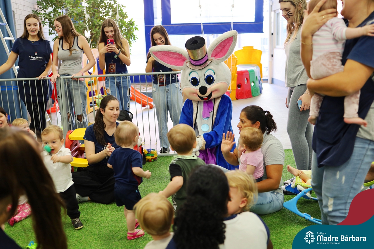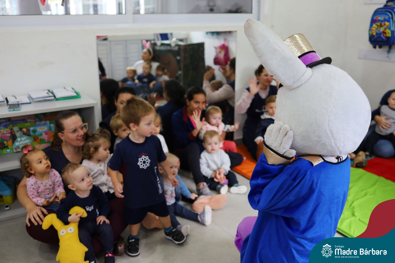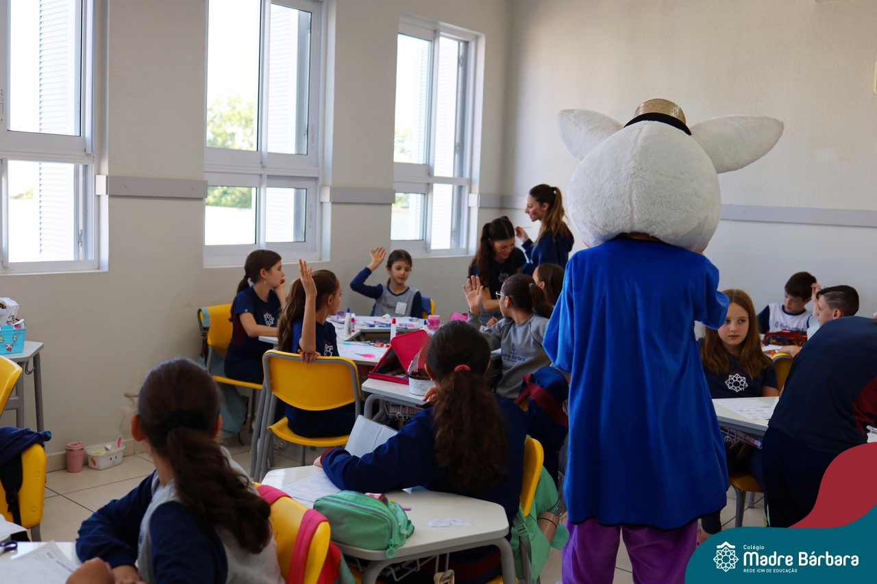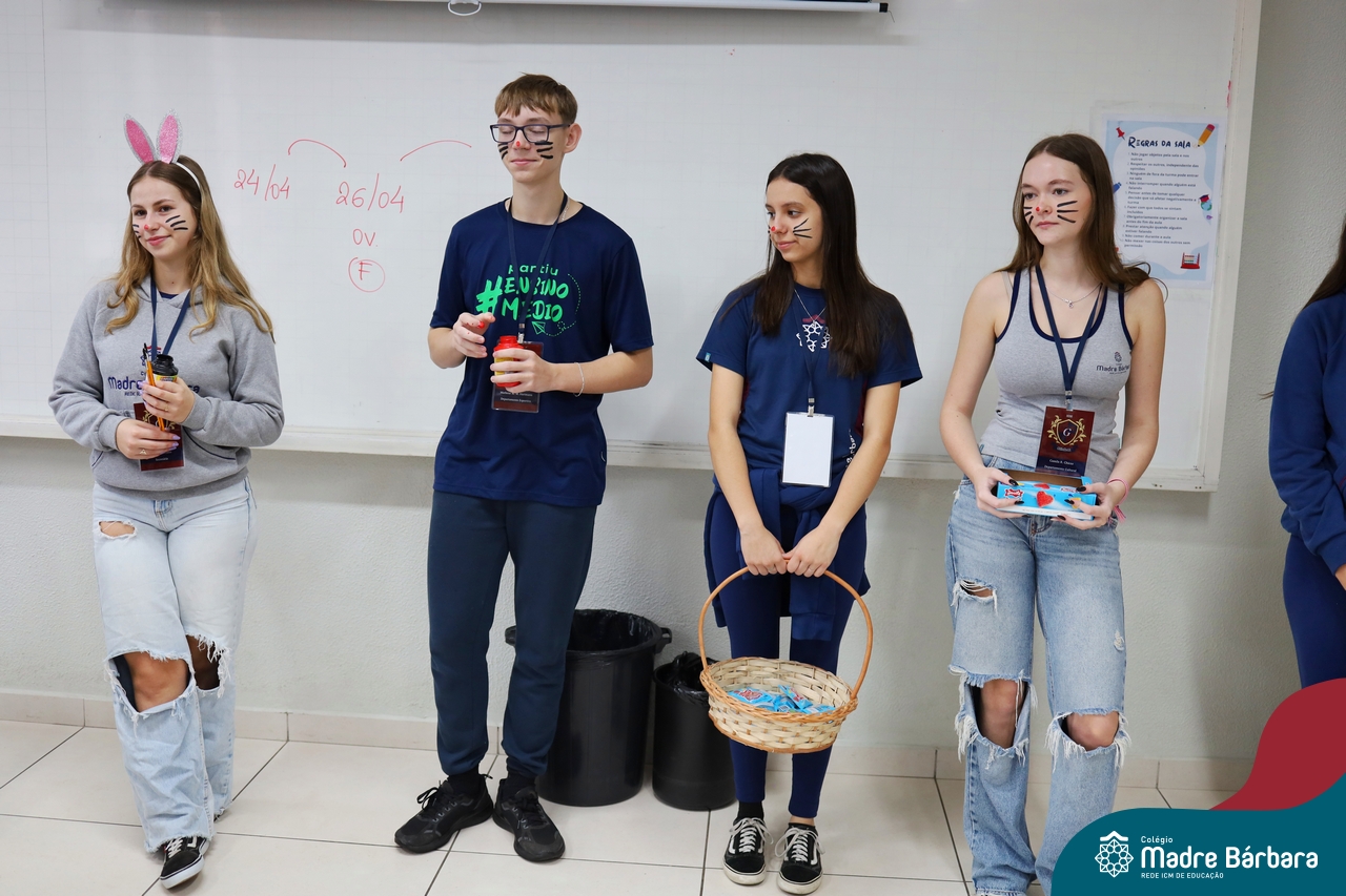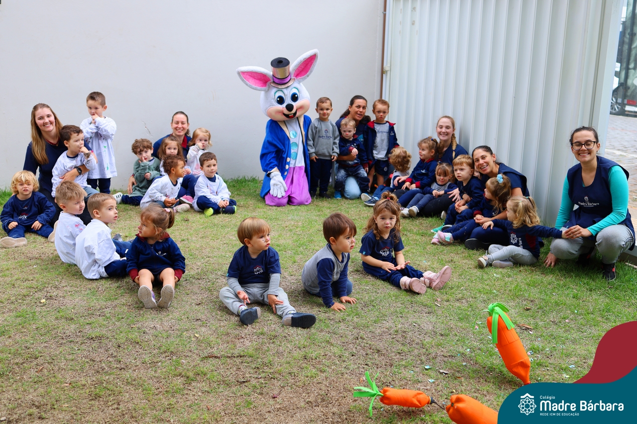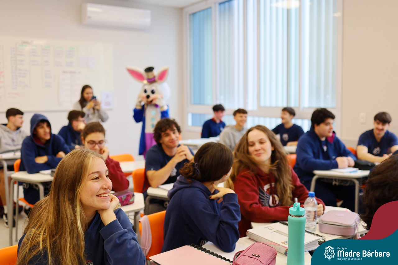 Na quinta-feira (17.04) as turmas da Educação Infantil ao Ensino Médio receberam a visita do Coelho da Páscoa do Grêmio Estudantil (Gembar). No Ensino Médio, o Gembar esteve acompanhado pela coordenação pedagógica, que entregou um mimo para os alunos e professores. Já na Educação Infantil e nos Anos Iniciais, as crianças aproveitaram para abraçar e fazer fotos com o amigo Coelho, já que ele havia deixado o ninho escondido por espaços do Colégio. Foi um dia muito alegre e feliz. Parabéns para o Gembar pela dedicação e por tornar o dia das crianças mais encantador e especial.