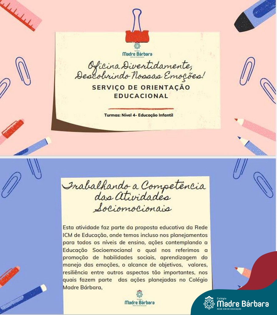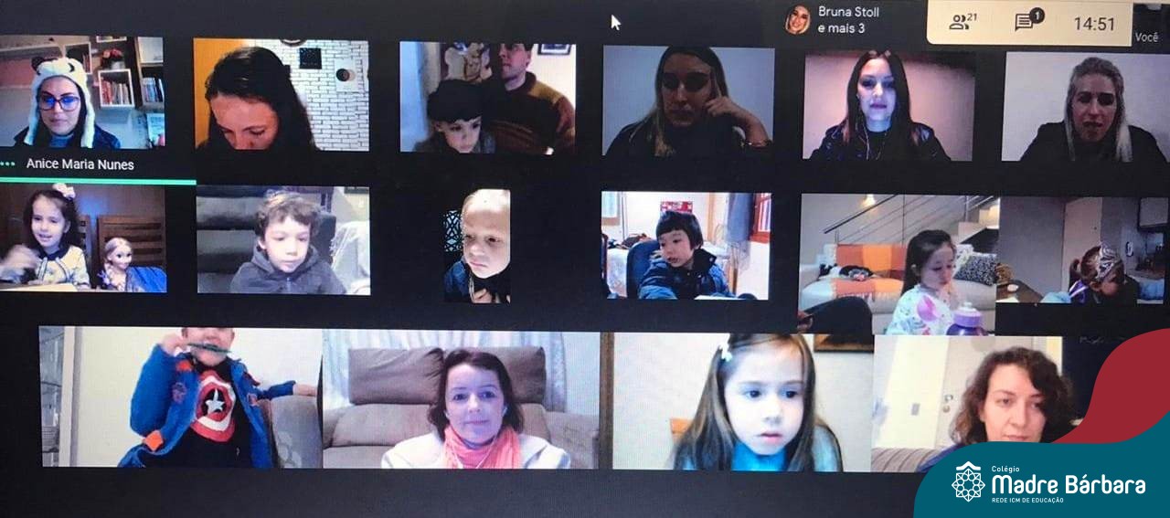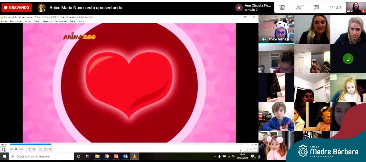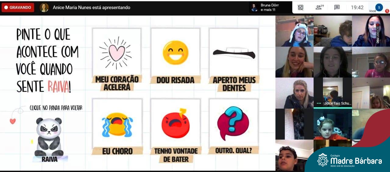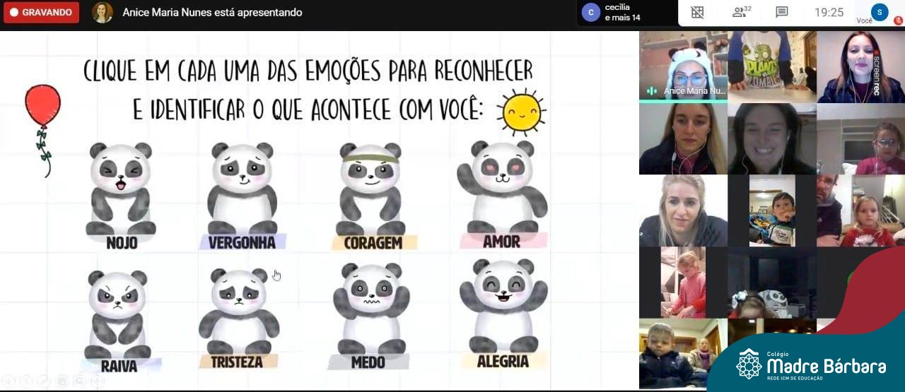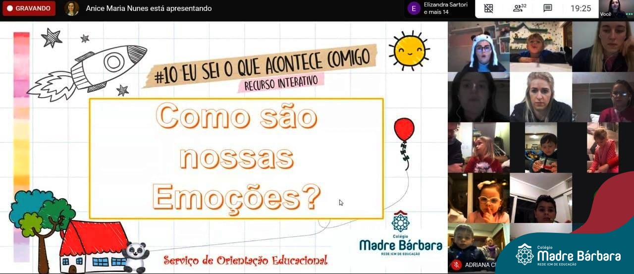 Na quinta-feira, dia 16, os Níveis 4 participaram de um Encontro Online com a Orientadora Educacional do Colégio Madre Bárbara – Rede ICM, Anice Maria Nunes, que trabalhou sobre as competências socioemocionais. Este momento, teve como objetivo conversar e interagir com as crianças sobre as emoções, de uma forma lúdica e atrativa através da “Turma do Amoreco”, de um arquivo interativo online sobre as emoções e da música “O som do coração.” O encontro foi muito oportuno e testificou que é essencial trabalhar sobre a educação socioemocional.