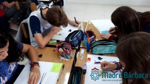 Junto com a professora de ciências Rosana Fagundes, as turmas 91 e 92 estão “confeccionando” átomos em aula prática, usando sementes para representar as partículas formadoras.