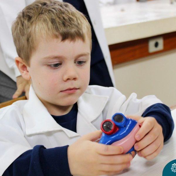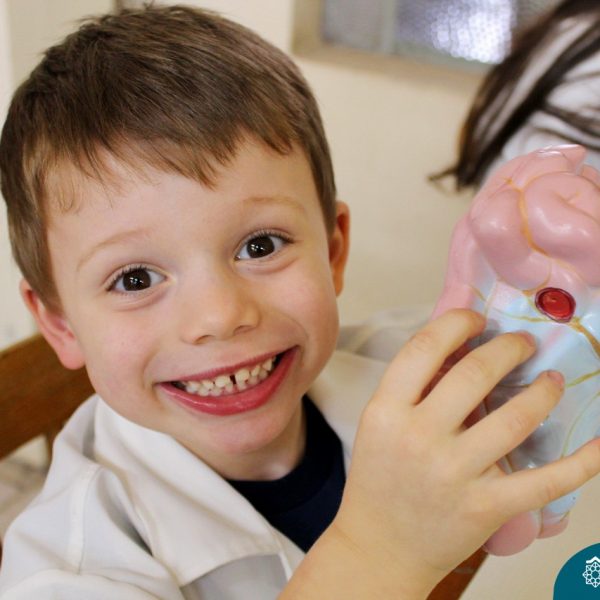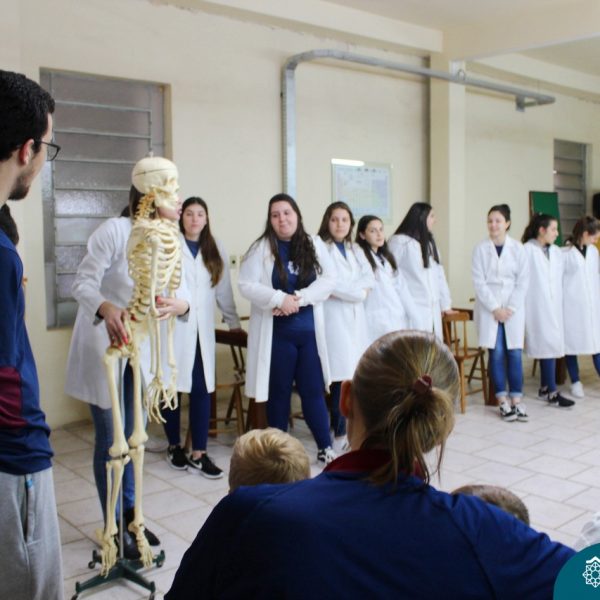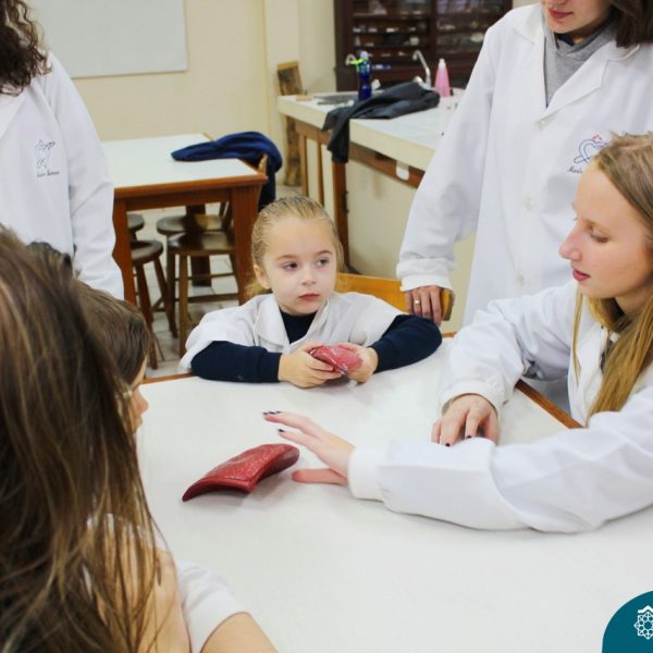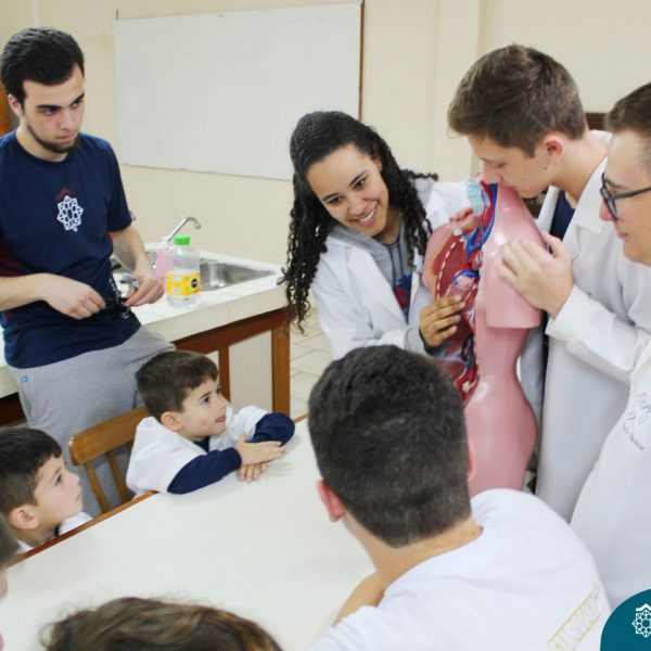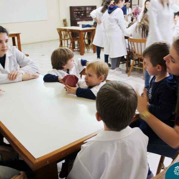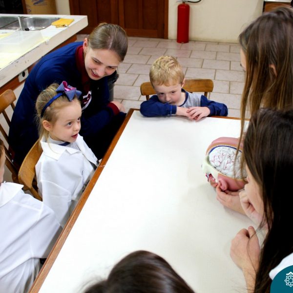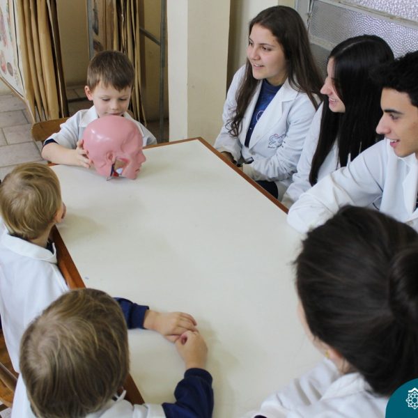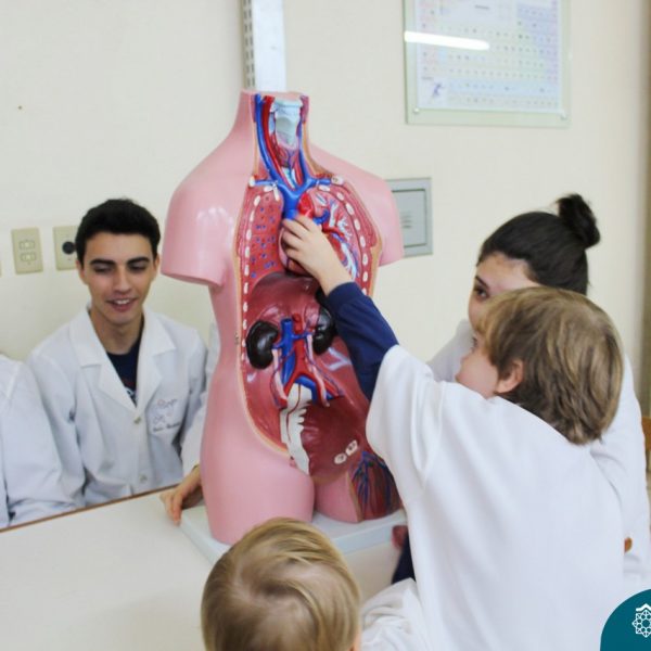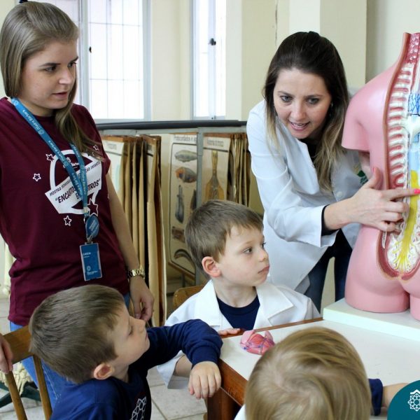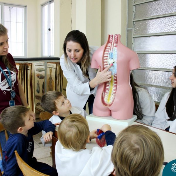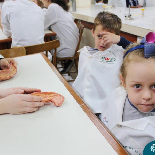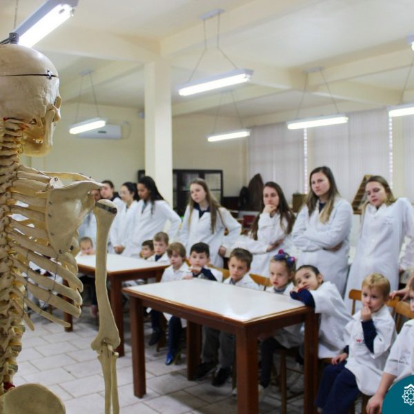 A turma do nível 3A está envolvida no projeto “Quem sou eu. Como me chamo?”, que tem como objetivo conhecer o corpo, perceber as diferenças físicas entre os colegas, incentivando o respeito ao próximo e a si mesmo, desenvolvendo situações de identificação oral e/ou visual através do nome próprio. Nas últimas semanas a turma conheceu a história “O corpo do Bóris”, e a partir da história muitas situações foram propostas. Pensando no desenvolvimento integral, na tarde de quarta-feira, dia 16, as crianças juntamente com as professoras Letícia e Jaqueline e a parceria da professora de biologia Ângela realizaram uma prática no Laboratório de Ciências do Colégio. A professora Ângela e os alunos do 3° ano, mostraram para as crianças o esqueleto, apresentando sua funcionalidade, bem como, mostrou para as crianças alguns dos órgãos que fazem parte do nosso corpo. Foi uma vivência maravilhosa.