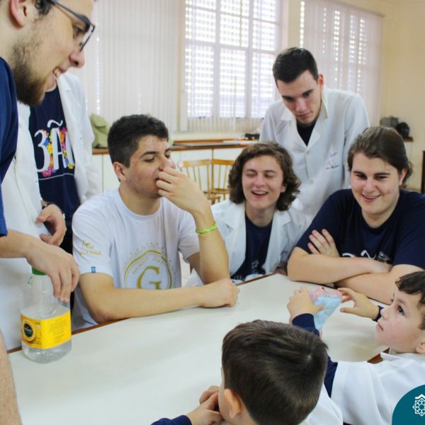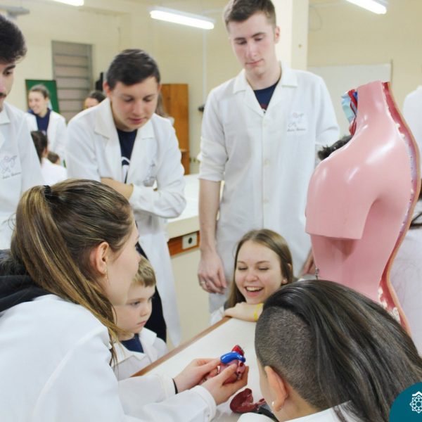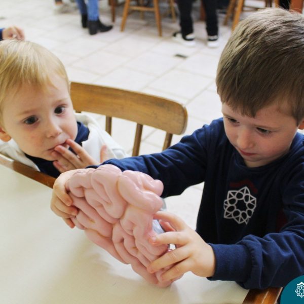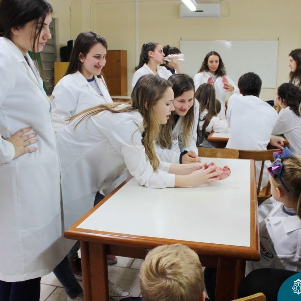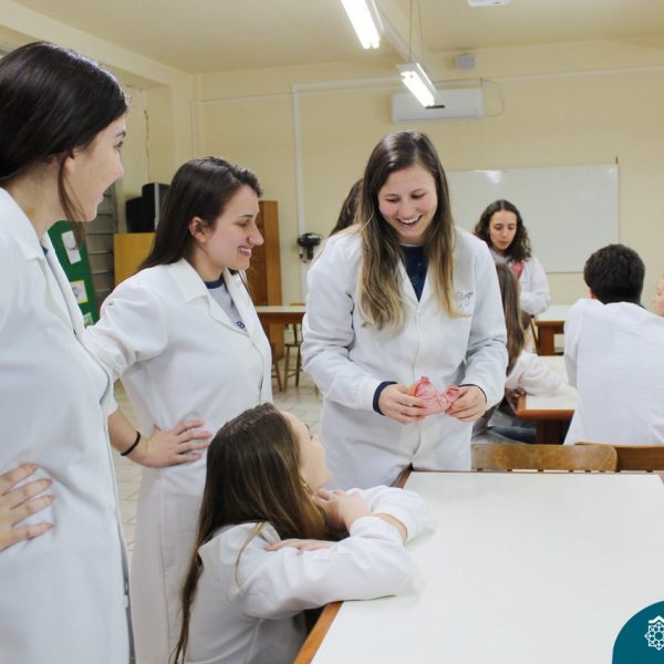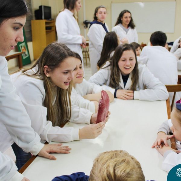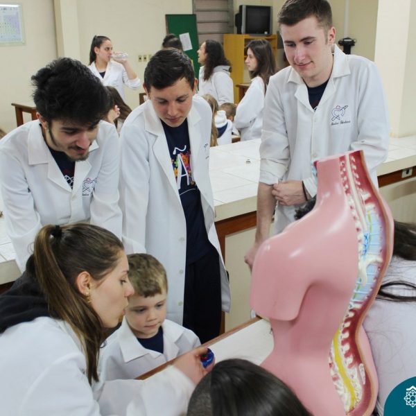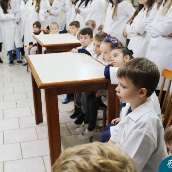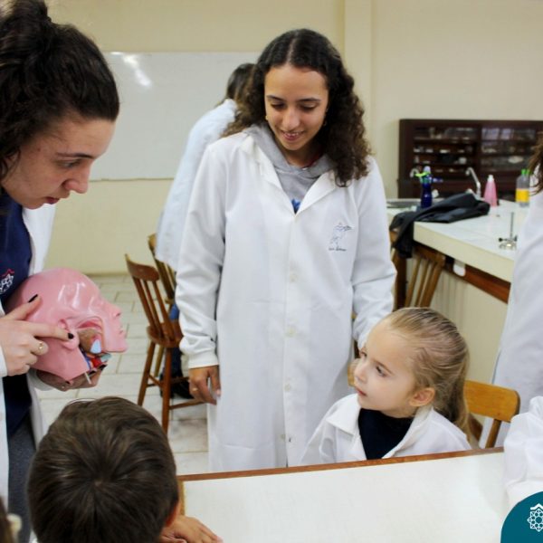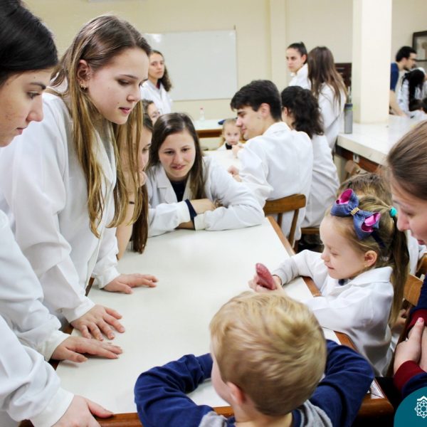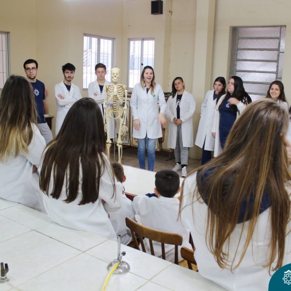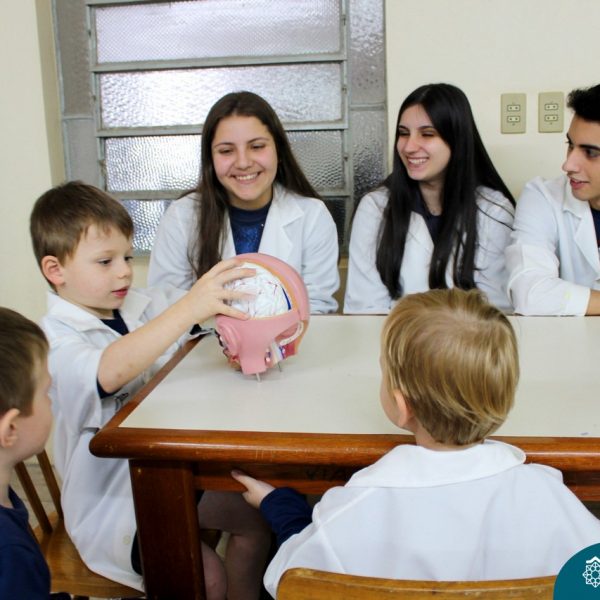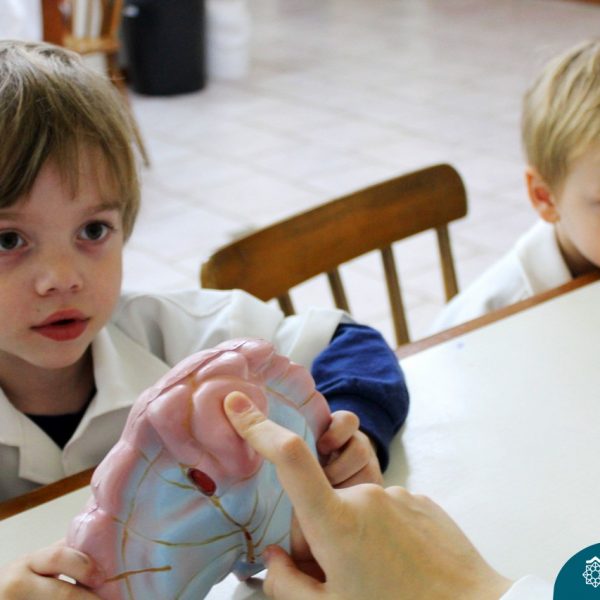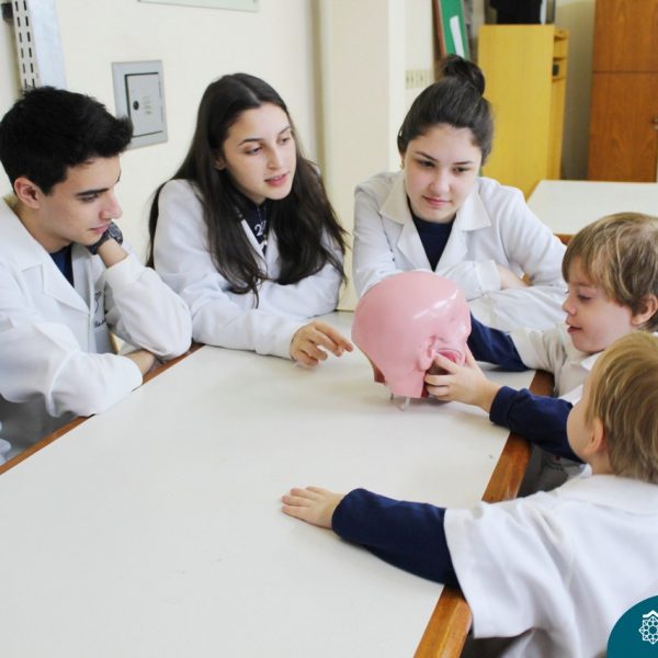 A turma do nível 3A está envolvida no projeto “Quem sou eu. Como me chamo?”, que tem como objetivo conhecer o corpo, perceber as diferenças físicas entre os colegas, incentivando o respeito ao próximo e a si mesmo, desenvolvendo situações de identificação oral e/ou visual através do nome próprio. Nas últimas semanas a turma conheceu a história “O corpo do Bóris”, e a partir da história muitas situações foram propostas. Pensando no desenvolvimento integral, na tarde de quarta-feira, dia 16, as crianças juntamente com as professoras Letícia e Jaqueline e a parceria da professora de biologia Ângela realizaram uma prática no Laboratório de Ciências do Colégio. A professora Ângela e os alunos do 3° ano, mostraram para as crianças o esqueleto, apresentando sua funcionalidade, bem como, mostrou para as crianças alguns dos órgãos que fazem parte do nosso corpo. Foi uma vivência maravilhosa.