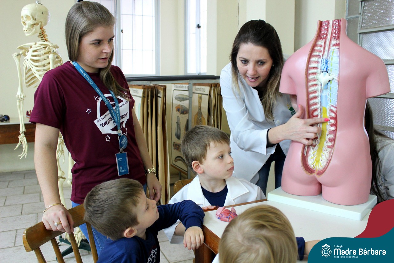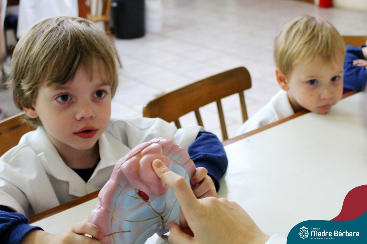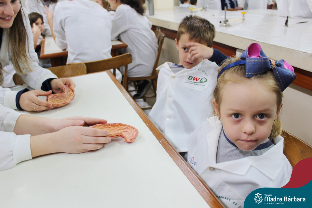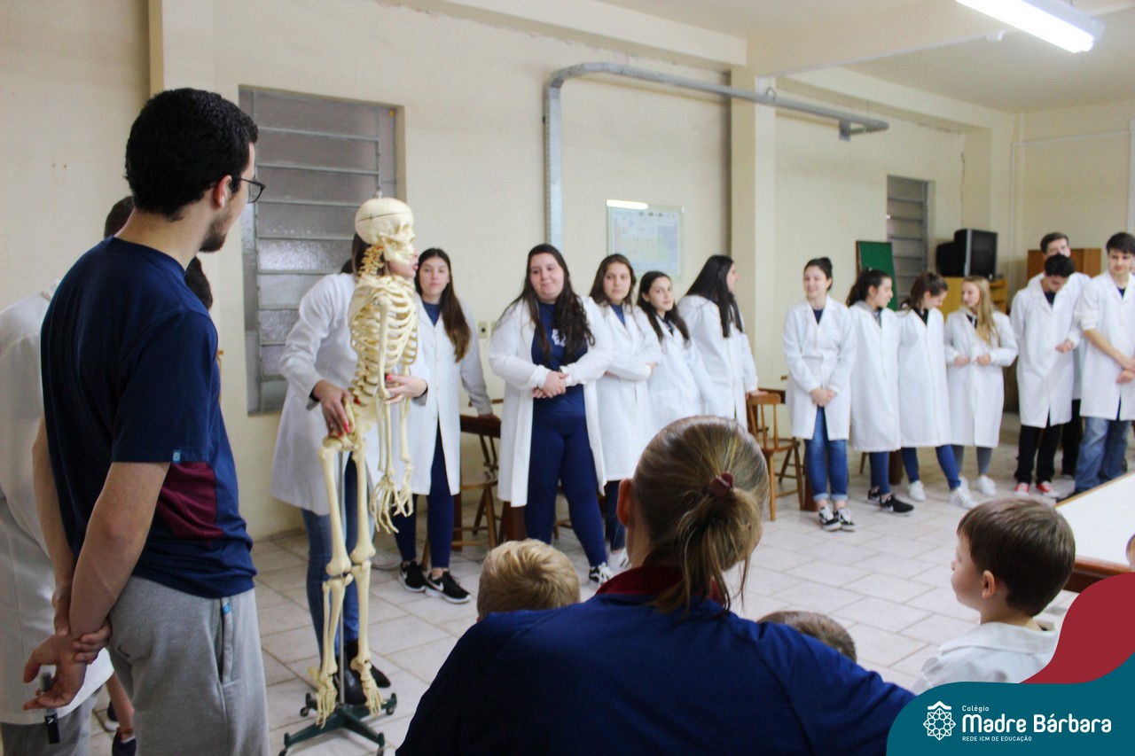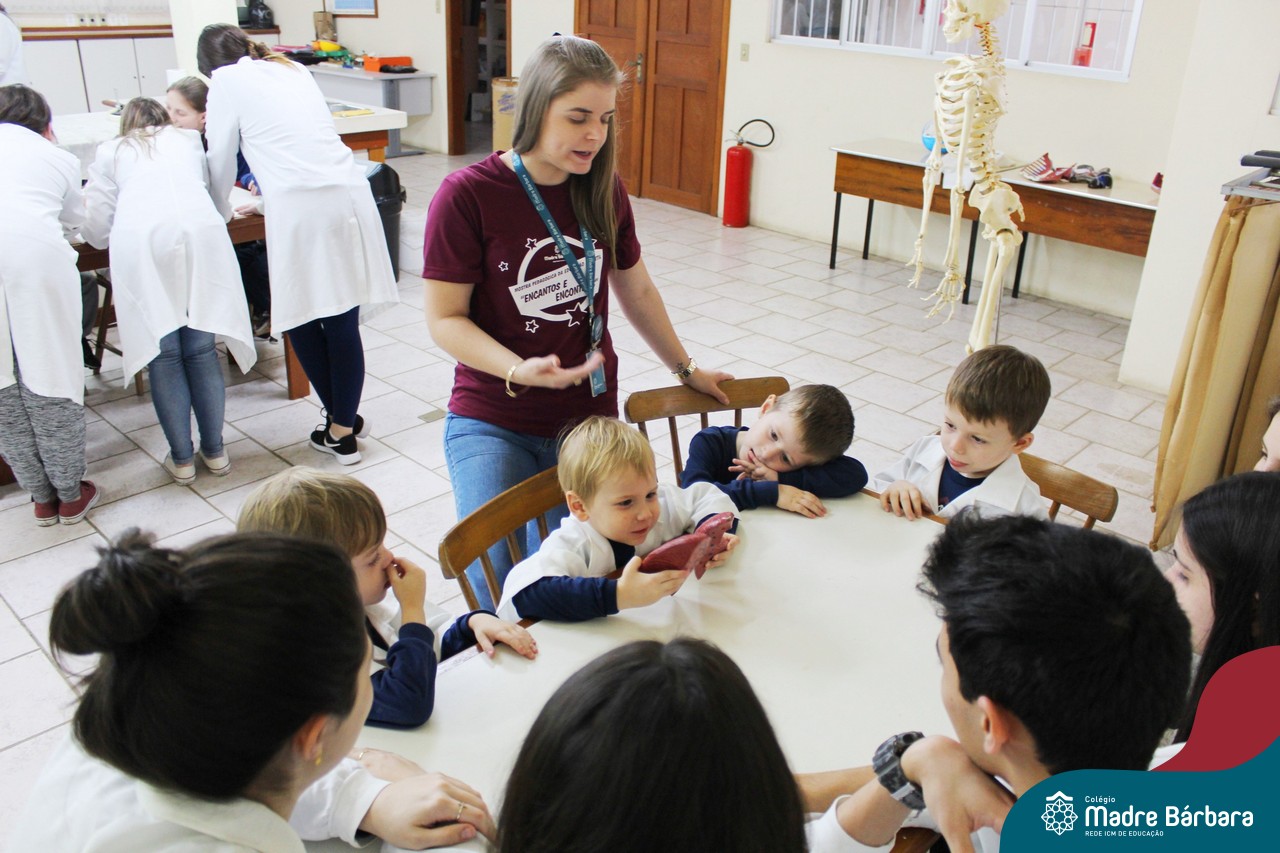 A turma do nível 3A está envolvida no projeto “Quem sou eu. Como me chamo?”, que tem como objetivo conhecer o corpo, perceber as diferenças físicas entre os colegas, incentivando o respeito ao próximo e a si mesmo, desenvolvendo situações de identificação oral e/ou visual através do nome próprio. Nas últimas semanas a turma conheceu a história “O corpo do Bóris”, e a partir da história muitas situações foram propostas. Pensando no desenvolvimento integral, na tarde de quarta-feira, dia 16, as crianças juntamente com as professoras Letícia e Jaqueline e a parceria da professora de biologia Ângela realizaram uma prática no Laboratório de Ciências do Colégio. A professora Ângela e os alunos do 3° ano, mostraram para as crianças o esqueleto, apresentando sua funcionalidade, bem como, mostrou para as crianças alguns dos órgãos que fazem parte do nosso corpo. Foi uma vivência maravilhosa.