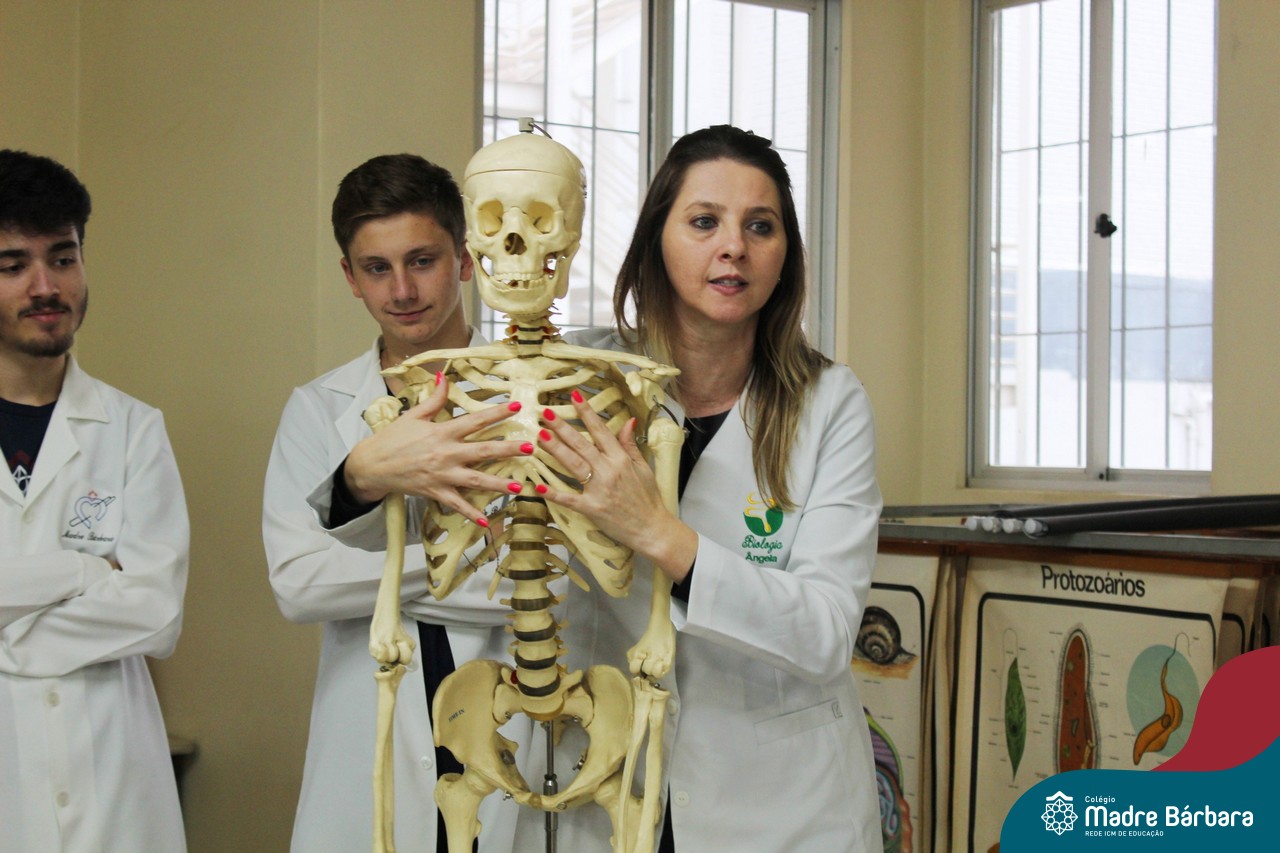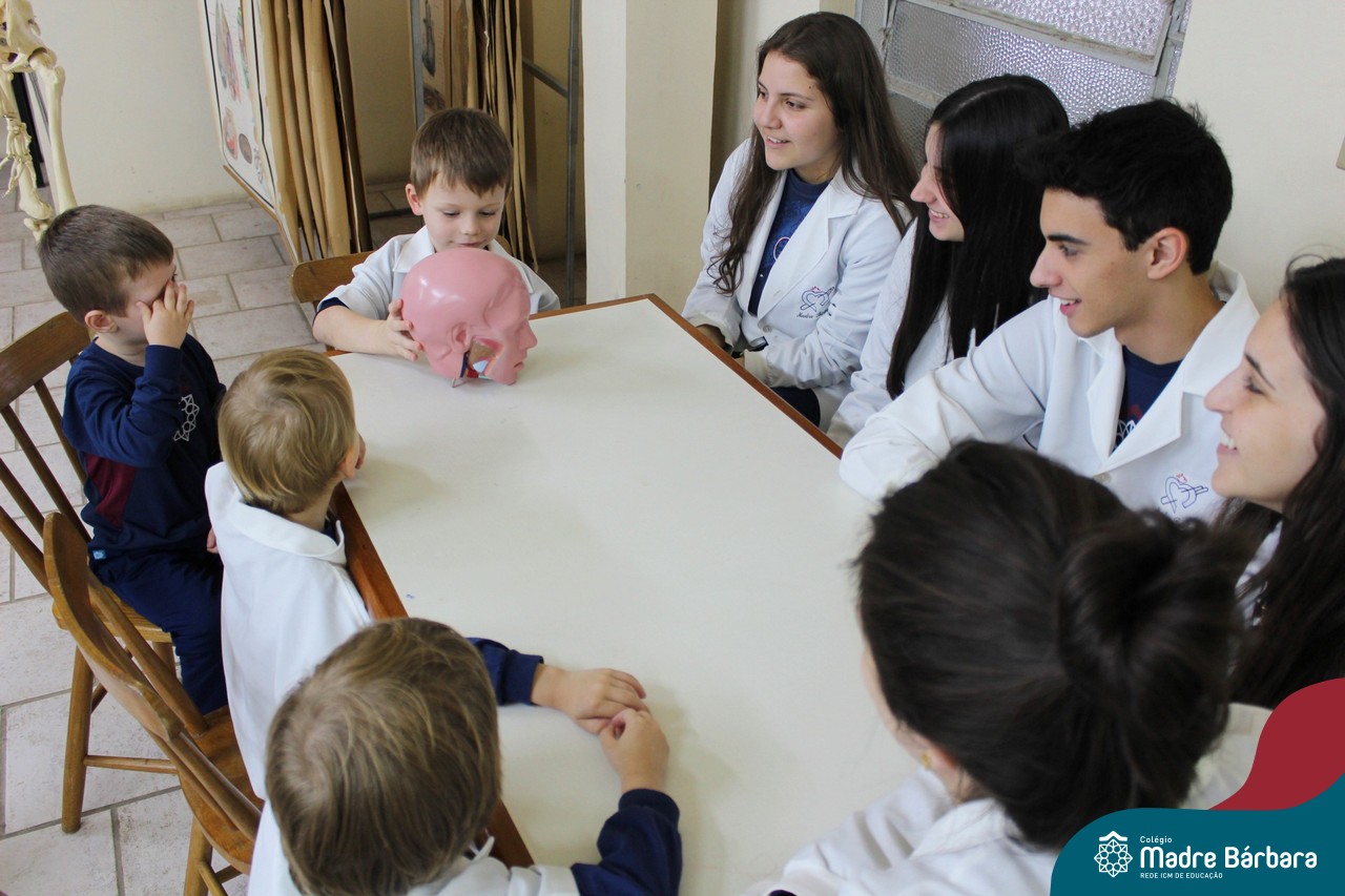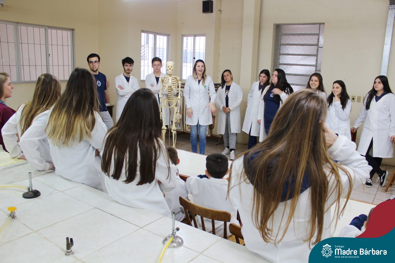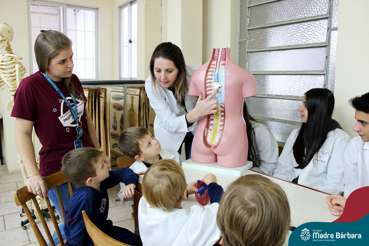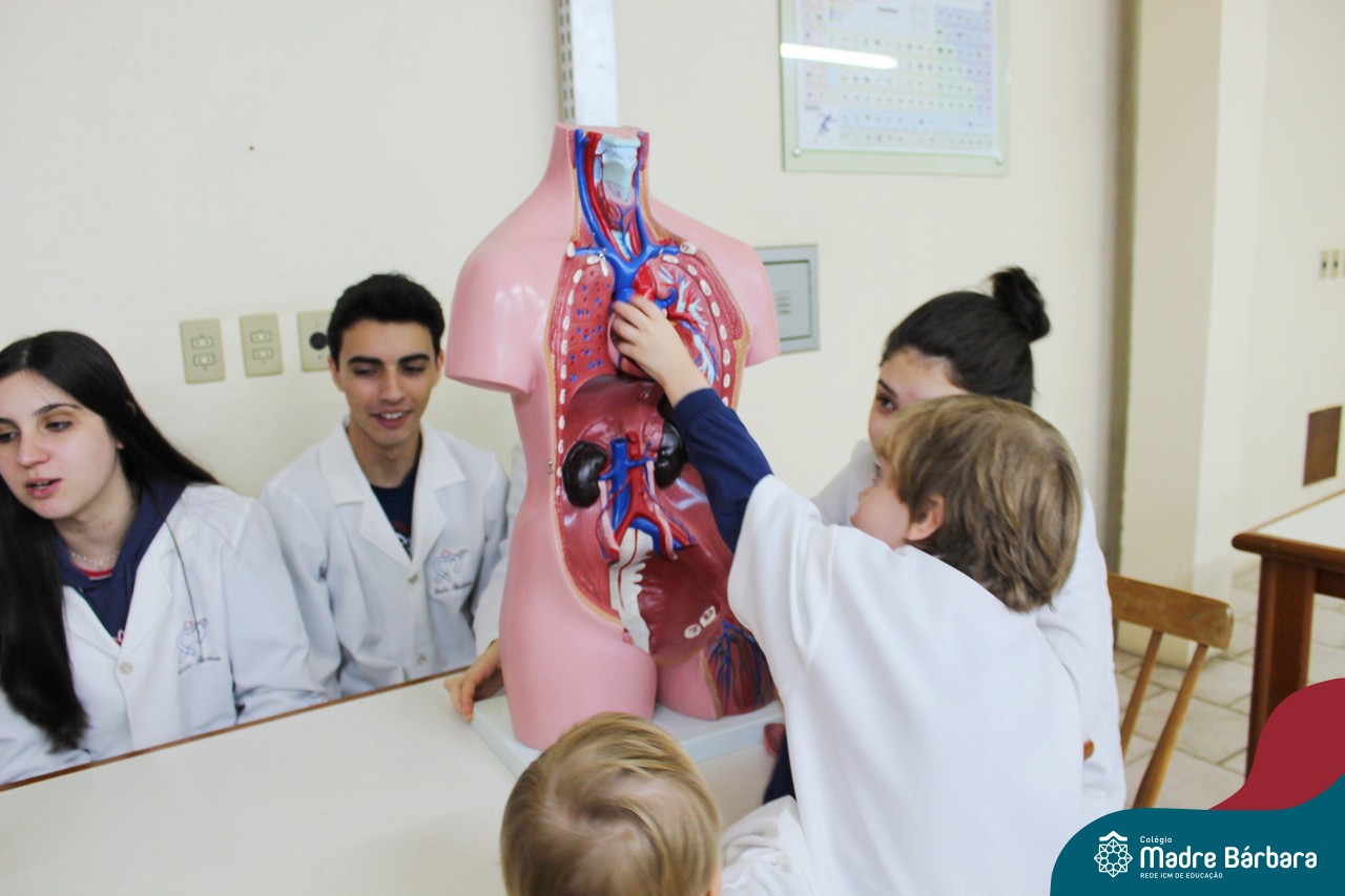 A turma do nível 3A está envolvida no projeto “Quem sou eu. Como me chamo?”, que tem como objetivo conhecer o corpo, perceber as diferenças físicas entre os colegas, incentivando o respeito ao próximo e a si mesmo, desenvolvendo situações de identificação oral e/ou visual através do nome próprio. Nas últimas semanas a turma conheceu a história “O corpo do Bóris”, e a partir da história muitas situações foram propostas. Pensando no desenvolvimento integral, na tarde de quarta-feira, dia 16, as crianças juntamente com as professoras Letícia e Jaqueline e a parceria da professora de biologia Ângela realizaram uma prática no Laboratório de Ciências do Colégio. A professora Ângela e os alunos do 3° ano, mostraram para as crianças o esqueleto, apresentando sua funcionalidade, bem como, mostrou para as crianças alguns dos órgãos que fazem parte do nosso corpo. Foi uma vivência maravilhosa.