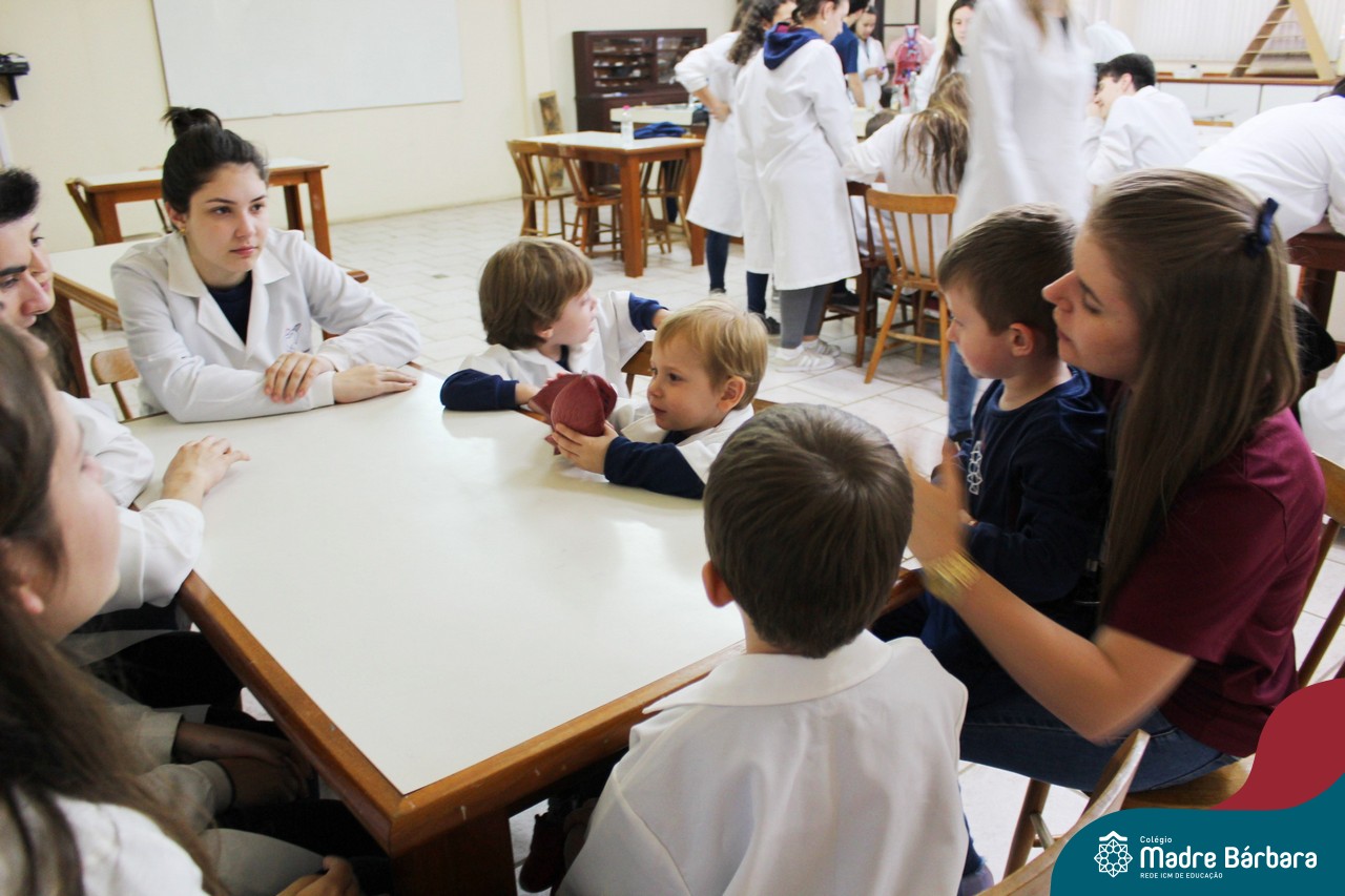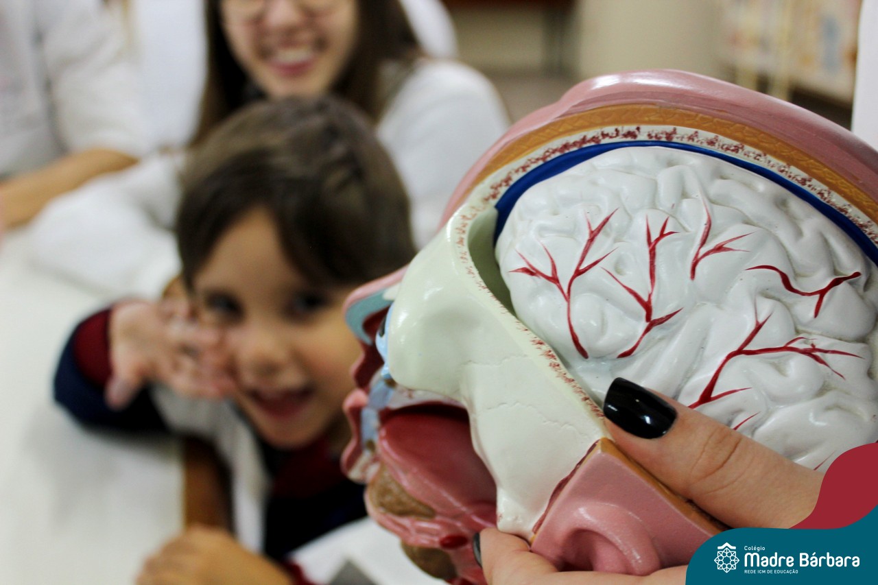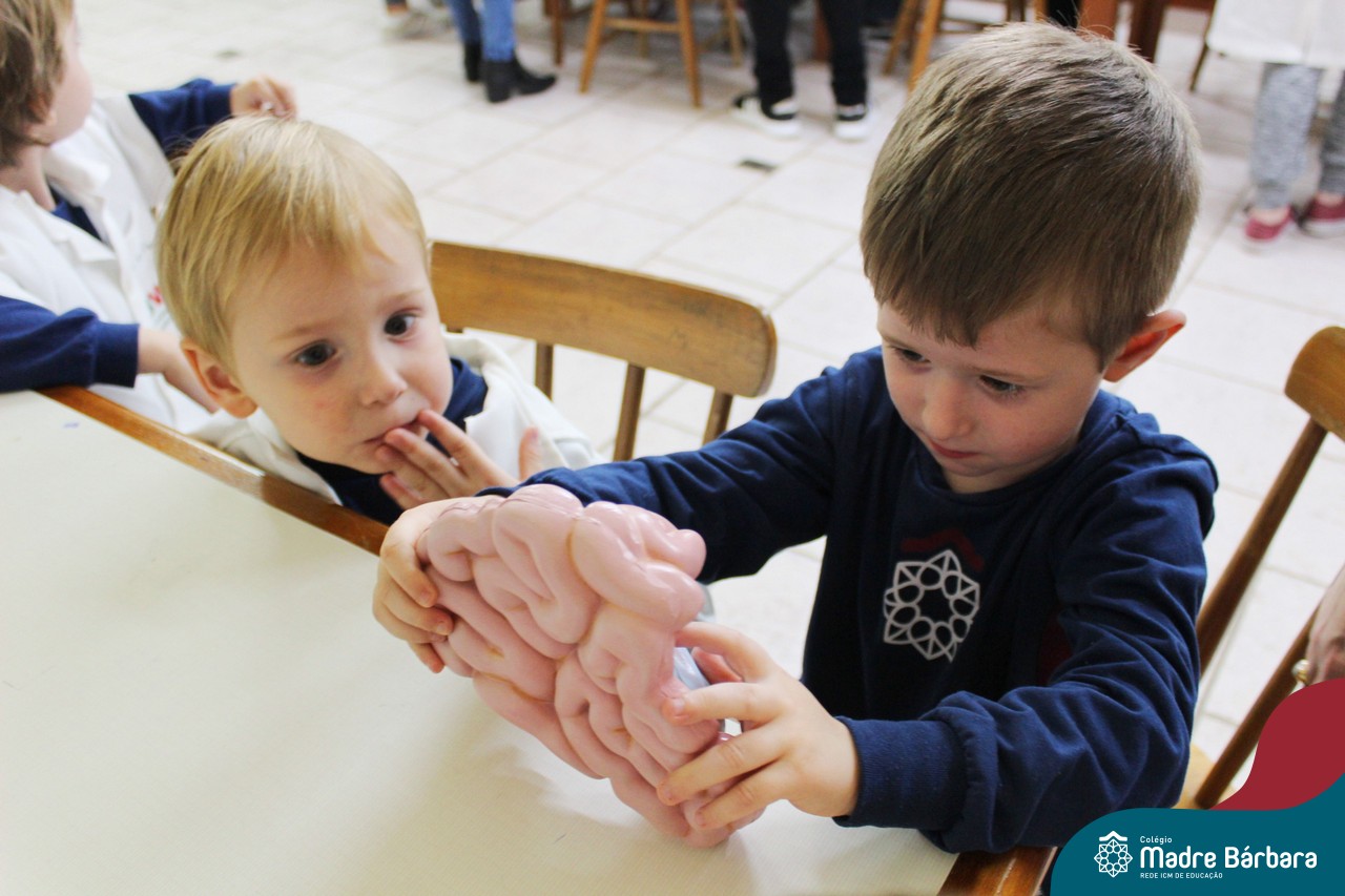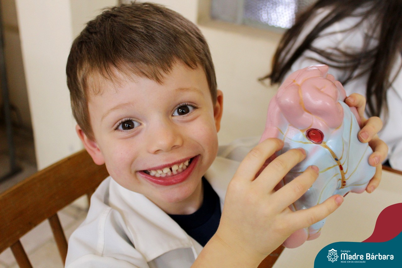 A turma do nível 3A está envolvida no projeto “Quem sou eu. Como me chamo?”, que tem como objetivo conhecer o corpo, perceber as diferenças físicas entre os colegas, incentivando o respeito ao próximo e a si mesmo, desenvolvendo situações de identificação oral e/ou visual através do nome próprio. Nas últimas semanas a turma conheceu a história “O corpo do Bóris”, e a partir da história muitas situações foram propostas. Pensando no desenvolvimento integral, na tarde de quarta-feira, dia 16, as crianças juntamente com as professoras Letícia e Jaqueline e a parceria da professora de biologia Ângela realizaram uma prática no Laboratório de Ciências do Colégio. A professora Ângela e os alunos do 3° ano, mostraram para as crianças o esqueleto, apresentando sua funcionalidade, bem como, mostrou para as crianças alguns dos órgãos que fazem parte do nosso corpo. Foi uma vivência maravilhosa.