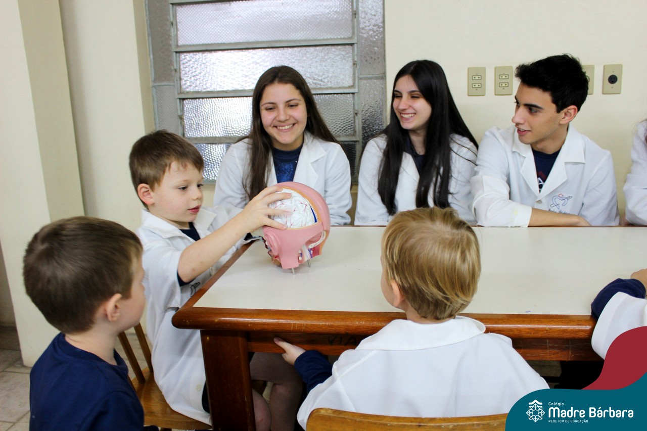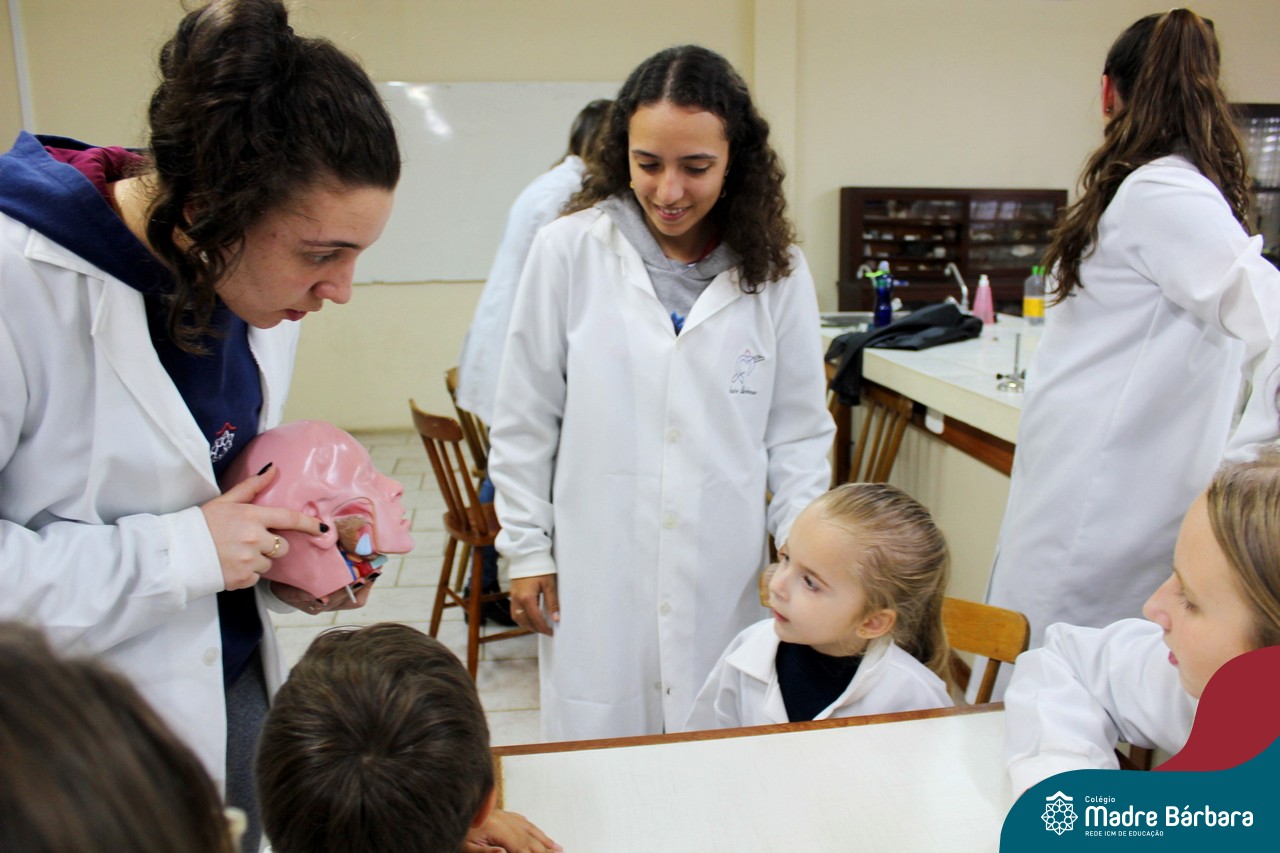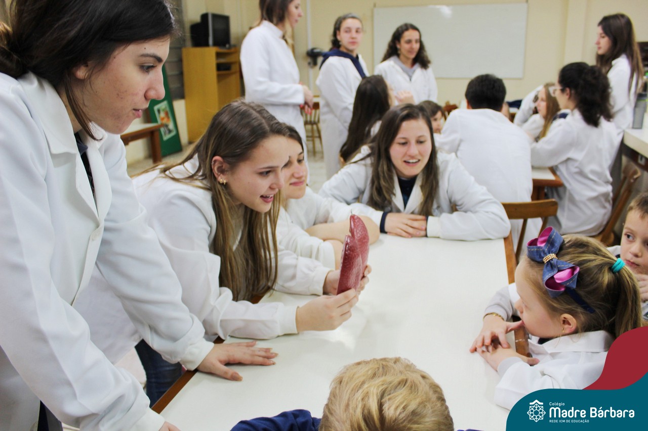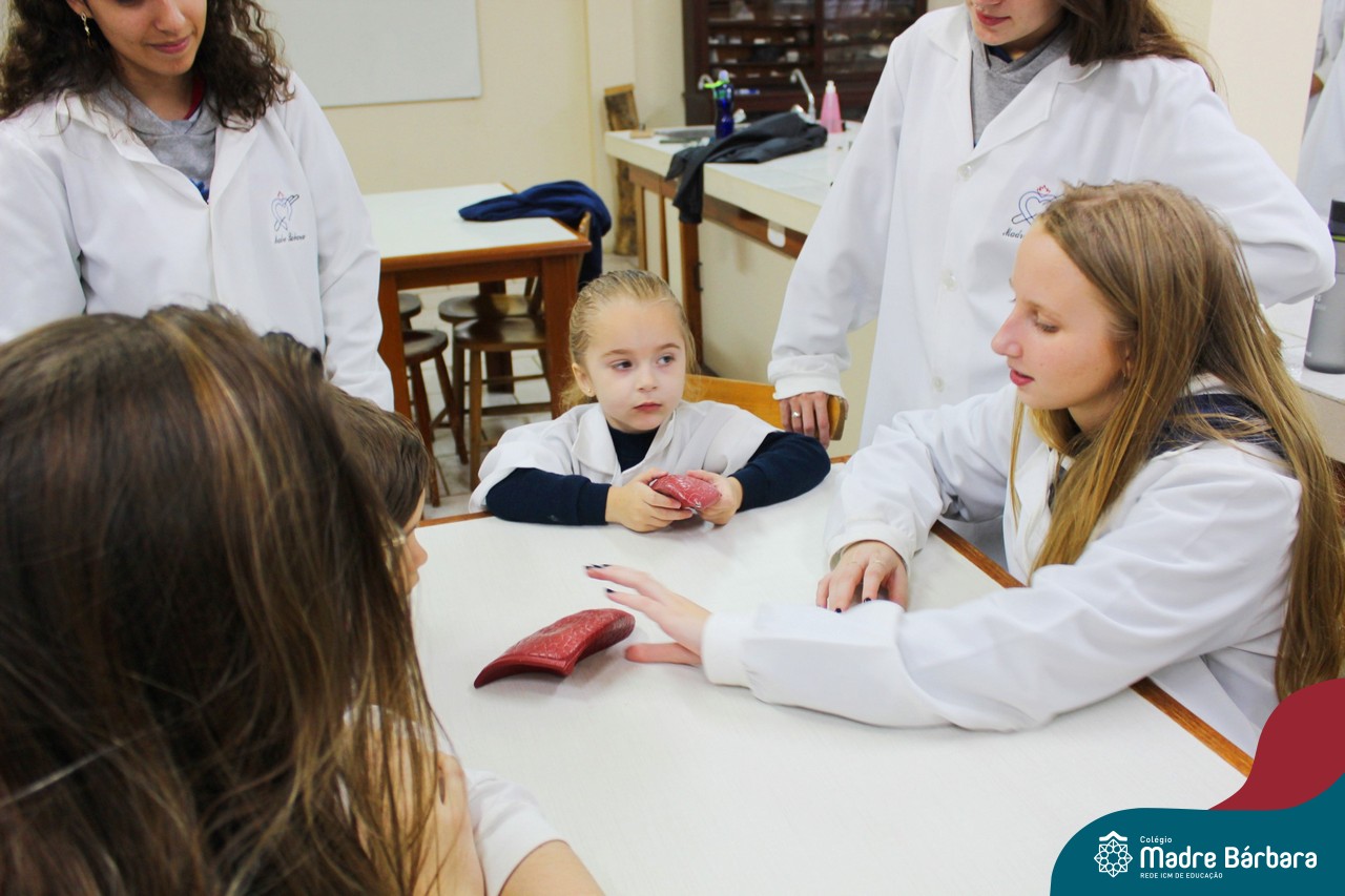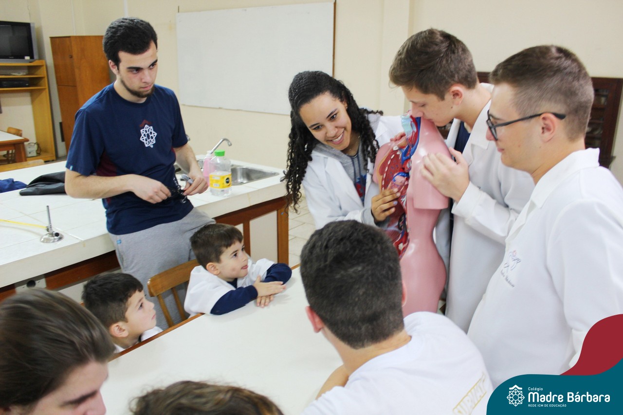 A turma do nível 3A está envolvida no projeto “Quem sou eu. Como me chamo?”, que tem como objetivo conhecer o corpo, perceber as diferenças físicas entre os colegas, incentivando o respeito ao próximo e a si mesmo, desenvolvendo situações de identificação oral e/ou visual através do nome próprio. Nas últimas semanas a turma conheceu a história “O corpo do Bóris”, e a partir da história muitas situações foram propostas. Pensando no desenvolvimento integral, na tarde de quarta-feira, dia 16, as crianças juntamente com as professoras Letícia e Jaqueline e a parceria da professora de biologia Ângela realizaram uma prática no Laboratório de Ciências do Colégio. A professora Ângela e os alunos do 3° ano, mostraram para as crianças o esqueleto, apresentando sua funcionalidade, bem como, mostrou para as crianças alguns dos órgãos que fazem parte do nosso corpo. Foi uma vivência maravilhosa.
