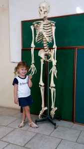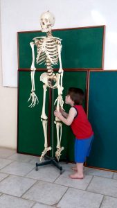 A turminha do Nível 3C, das professoras Ana Paula Fraga e Jéssica Fernanda Zarth foi visitar o Laboratório de Ciências para conhecer o “ESQUELETO”. A curiosidade surgiu a partir da música “A dança dos esqueletos”, da palavra cantada (músicos Sandra Peres e Paulo Tatit), trabalhada durante o projeto “Espelho, espelho meu”. Ao serem questionados sobre o que seria um esqueleto, muitas respostas e perguntas surgiram… “É um monstro!”, “É um fantasma!”, “Ele anda?”. Todos estavam ansiosos para o grande momento!