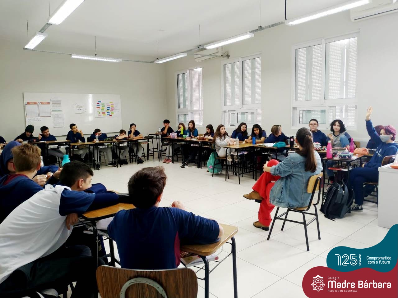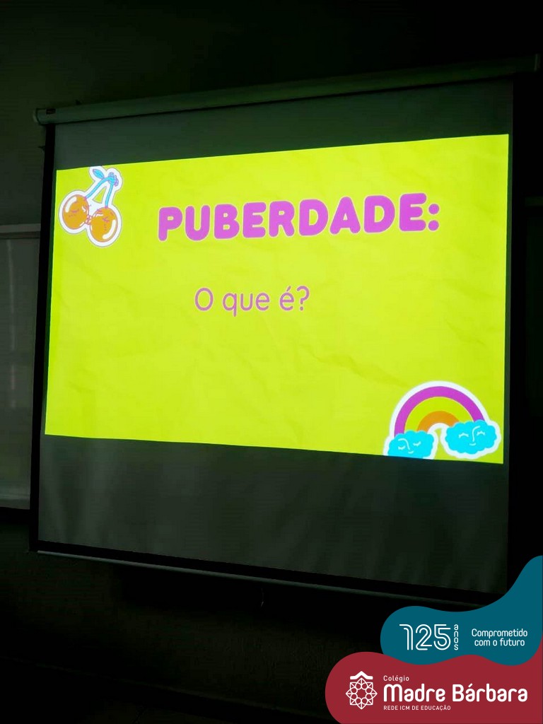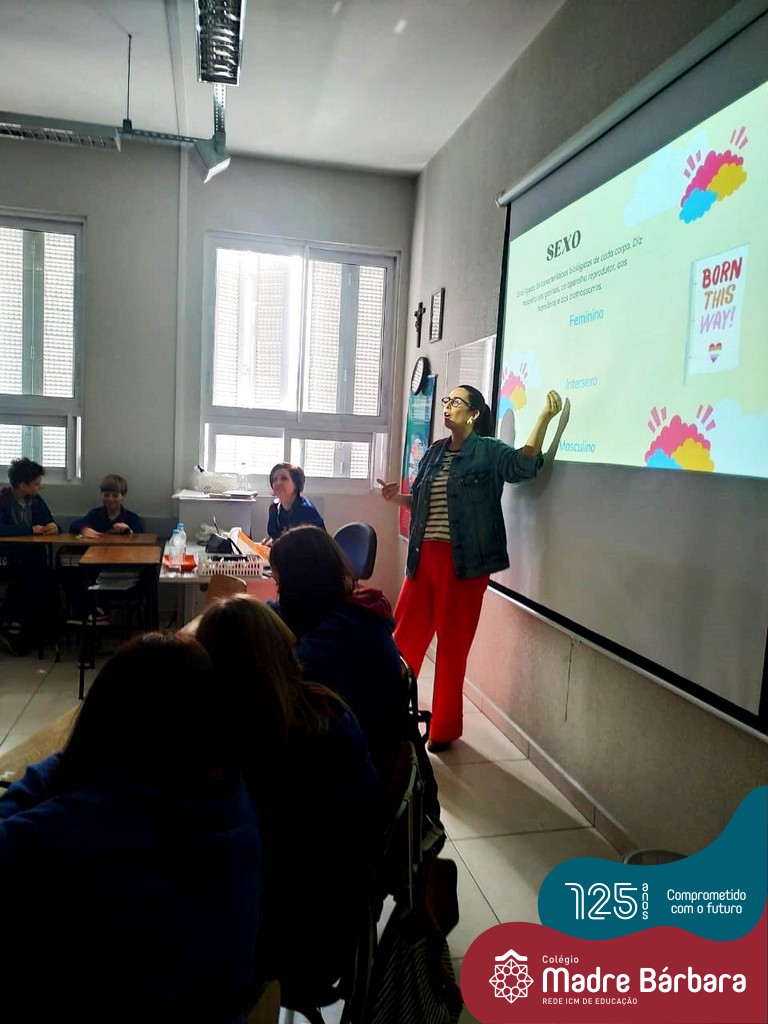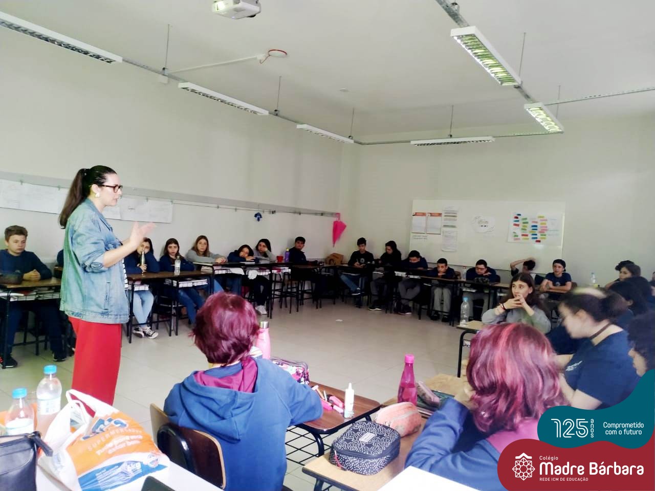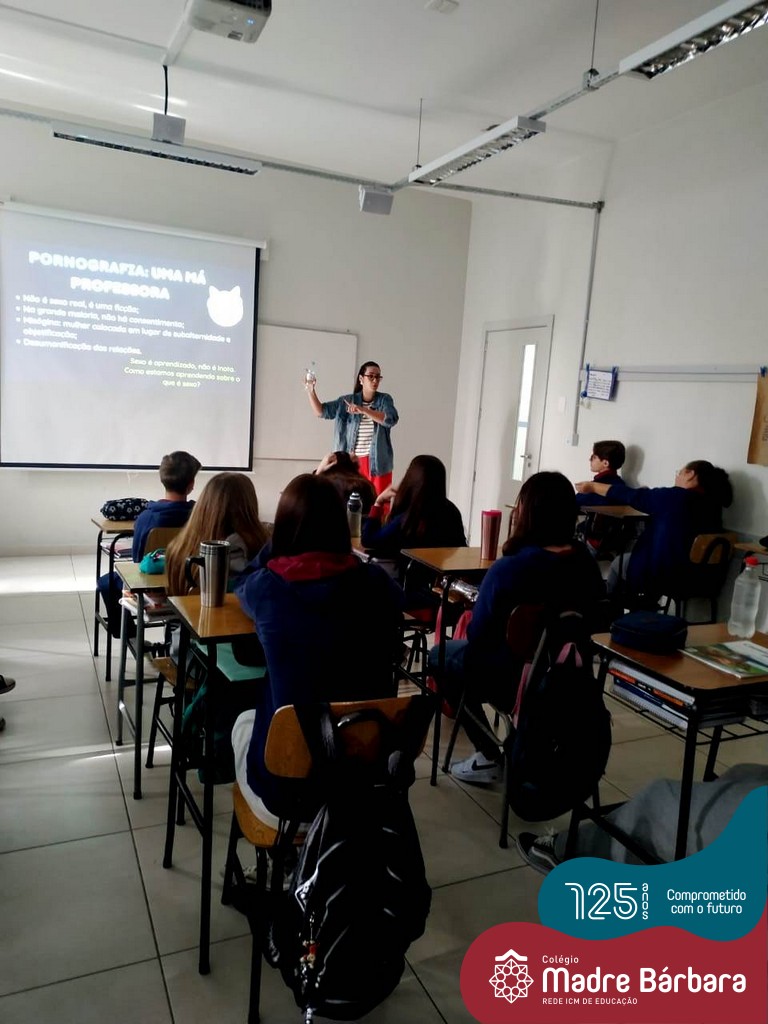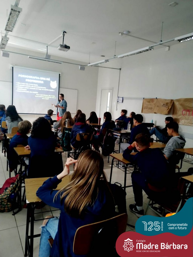 Roda de Conversa sobre Sexualidade na Adolescência, turmas 81 e 82 com a Psicóloga Natália Rissinger Bonotto, Mestra em Psicologia Social. Foram abordados os seguintes assuntos: Mudanças corporais e emocionais, respeito ao corpo, conceito de consentimento, masturbação como uma manifestação saudável do desenvolvimento.