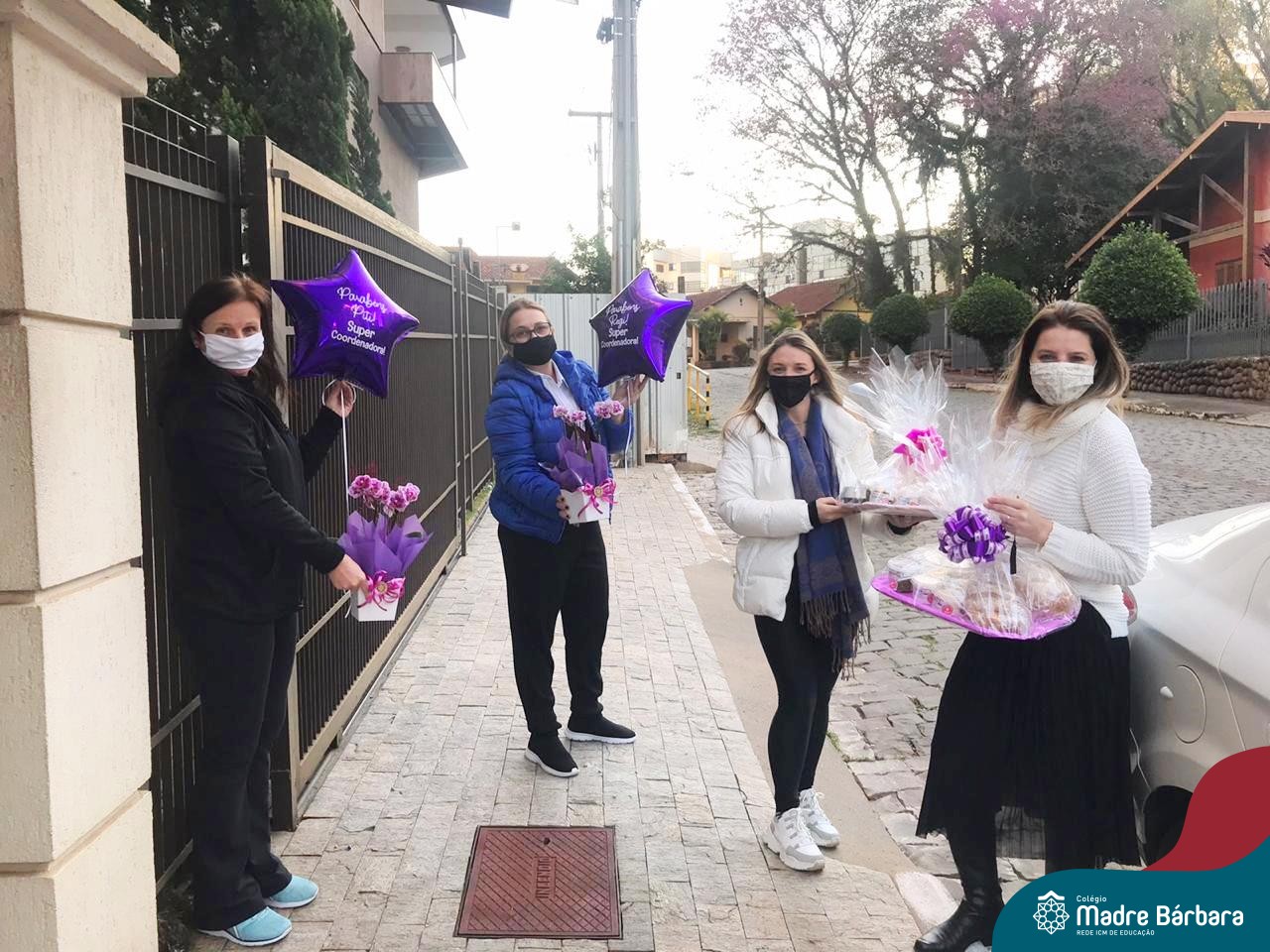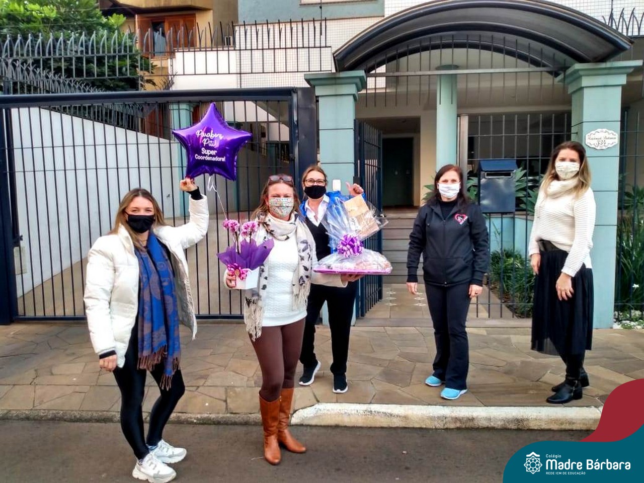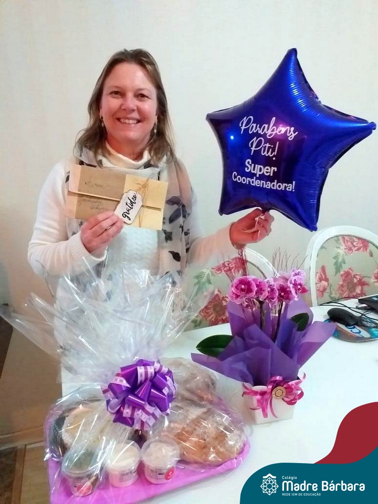 Nesse sábado (22.08) as coordenadoras pedagógicas do Colégio Madre Bárbara – Rede ICM foram homenageadas pelo seu dia. No turno da manhã, a coordenadora da Educação Infantil Vanessa Ely recebeu uma cesta surpresa de suas professoras no Colégio, quando estavam entregando relatórios às famílias. As coordenadoras dos Anos Iniciais Cláudia Rockenbach e Simone Faleiro foram surpreendidas ainda pela manhã em suas casas, quando receberam dos professores um vídeo de homenagem, um kit com jogo de toalhas e espumante, além de balões personalizados. Já as coordenadoras dos Anos Finais e Ensino Médio Justine Thomas e Regiane Pretto receberam a tarde um grupo de professores representantes, secretária e Associação de Pais e Mestres (APM) em suas casas e ganharam uma cesta, também com balões personalizados.