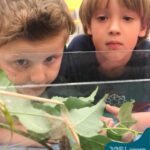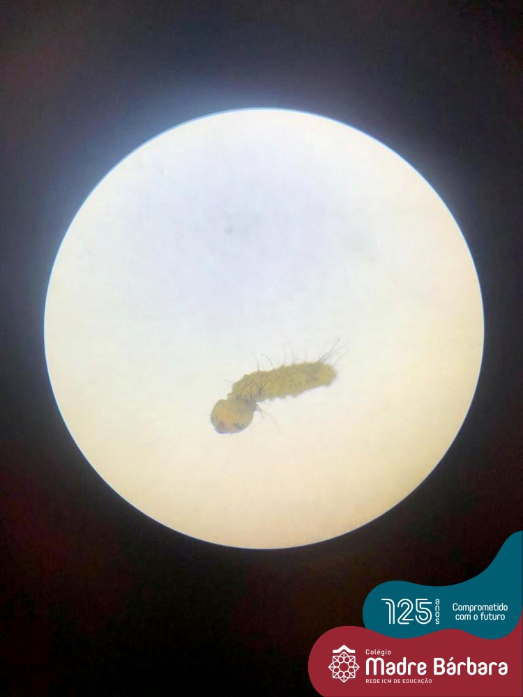 Observaram uma lagarta no microscópio e puderam conhecer um pouco mais sobre a biologia destes. O Projeto busca a interação das crianças com o meio natural, aprendizagem sobre o mundo, fazendo perguntas e procurando respostas às suas indagações e curiosidades.