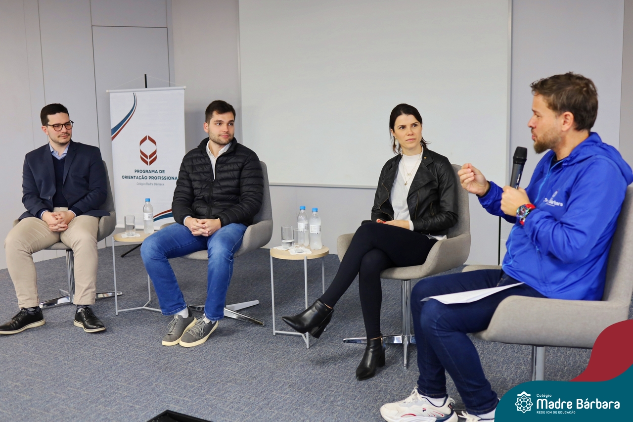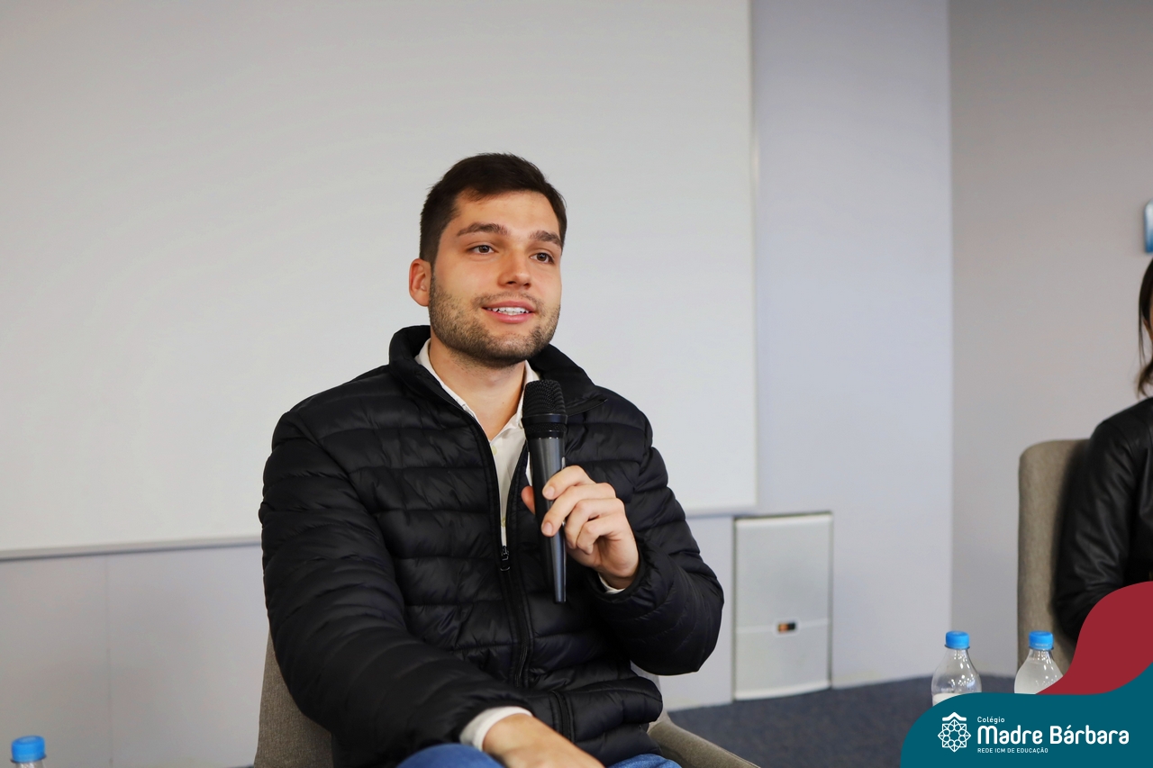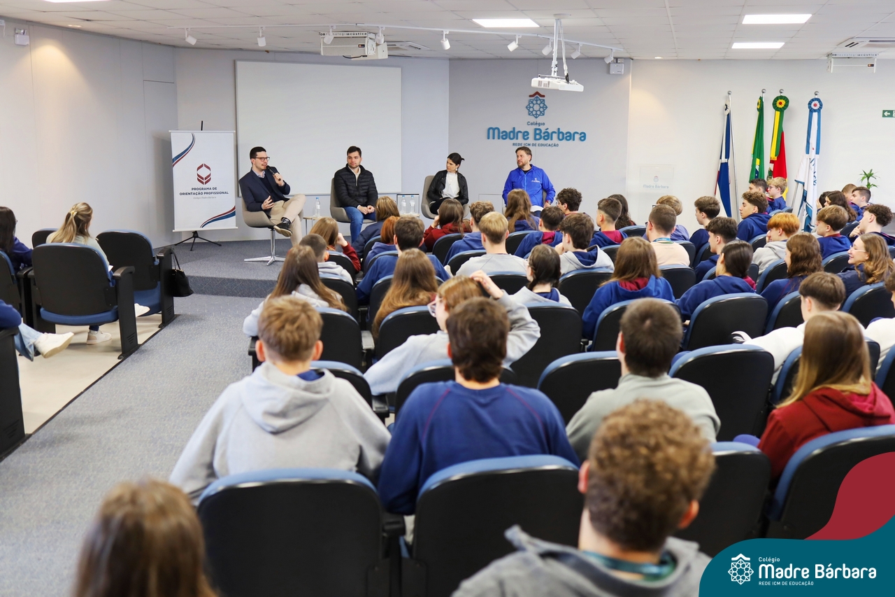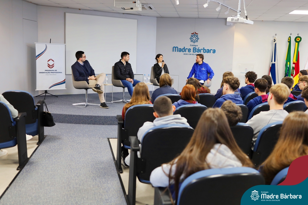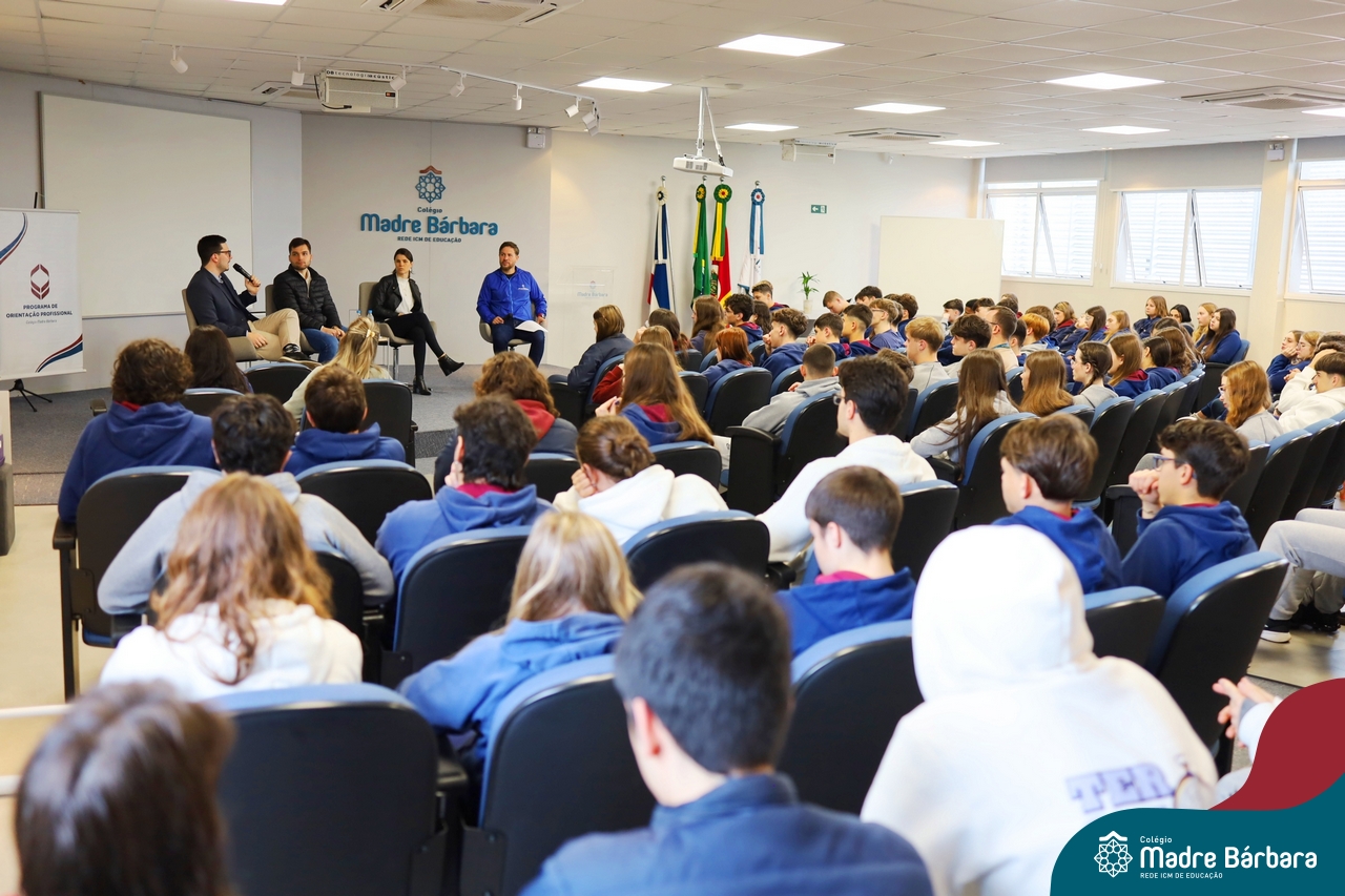 A escolha profissional é um projeto de vida e não apenas de carreira. Trata-se de um processo de autoconhecimento, de compreensão de suas habilidades e da busca constante por aprendizados. Sabendo que toda esta caminhada inicia muito antes da graduação, na manhã da última quinta-feira (07.07), os ex-alunos Augusto Armani, Gabriel Ely e Gabriela Pedó, estiveram no Colégio Madre Bárbara – Rede ICM para compartilhar com os estudantes do Ensino Médio um pouco sobre sua trajetória profissional e explorar como o Colégio contribuiu em seus processos de formação integral. O momento contou com a participação e condução do professor David Orling que, juntamente com os convidados, relembrou momentos marcantes da trajetória escolar dos mesmos.