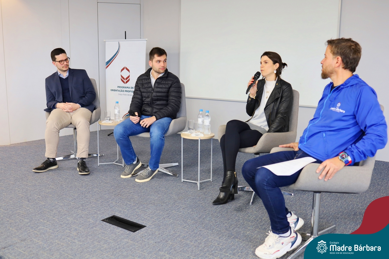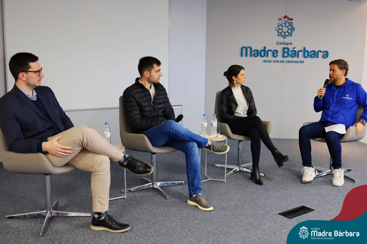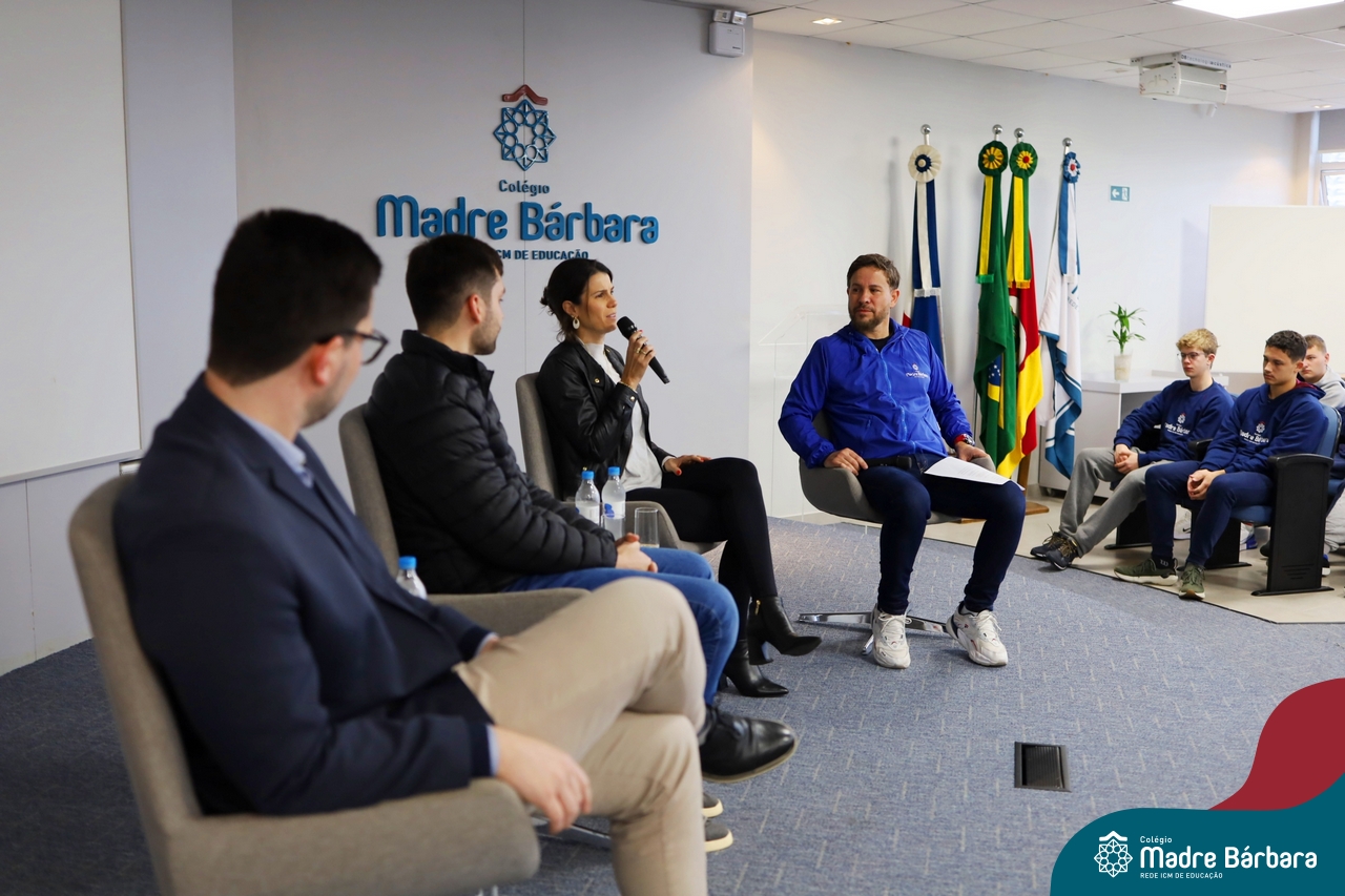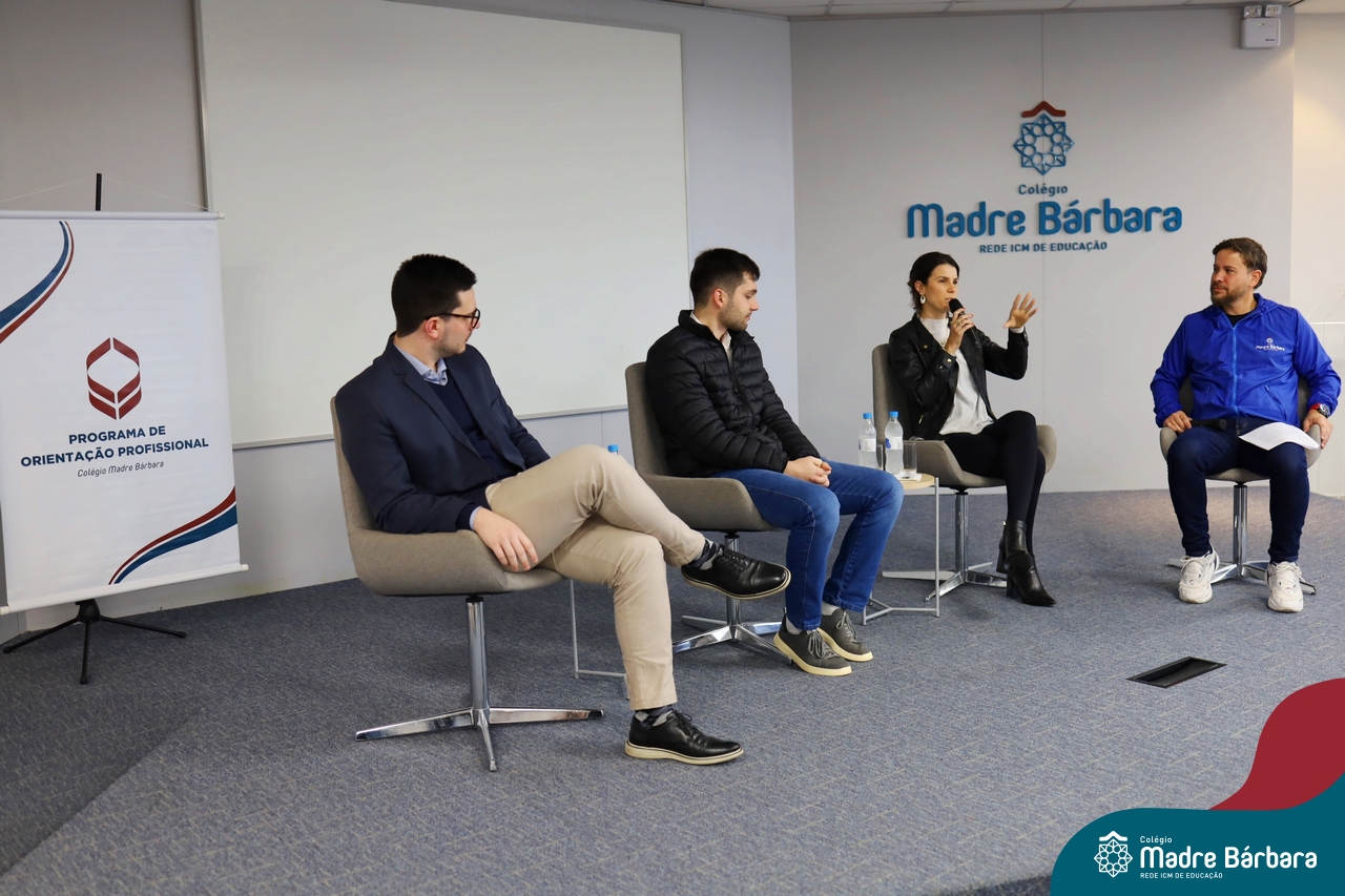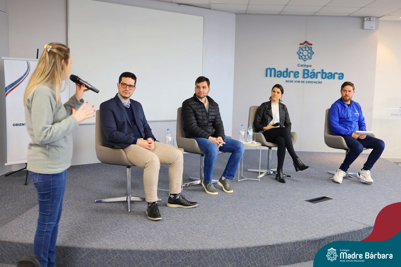 A escolha profissional é um projeto de vida e não apenas de carreira. Trata-se de um processo de autoconhecimento, de compreensão de suas habilidades e da busca constante por aprendizados. Sabendo que toda esta caminhada inicia muito antes da graduação, na manhã da última quinta-feira (07.07), os ex-alunos Augusto Armani, Gabriel Ely e Gabriela Pedó, estiveram no Colégio Madre Bárbara – Rede ICM para compartilhar com os estudantes do Ensino Médio um pouco sobre sua trajetória profissional e explorar como o Colégio contribuiu em seus processos de formação integral. O momento contou com a participação e condução do professor David Orling que, juntamente com os convidados, relembrou momentos marcantes da trajetória escolar dos mesmos.