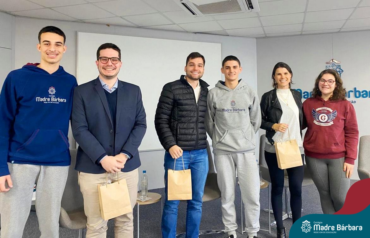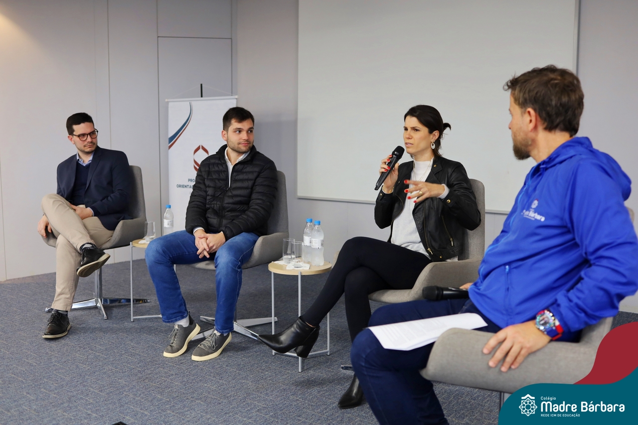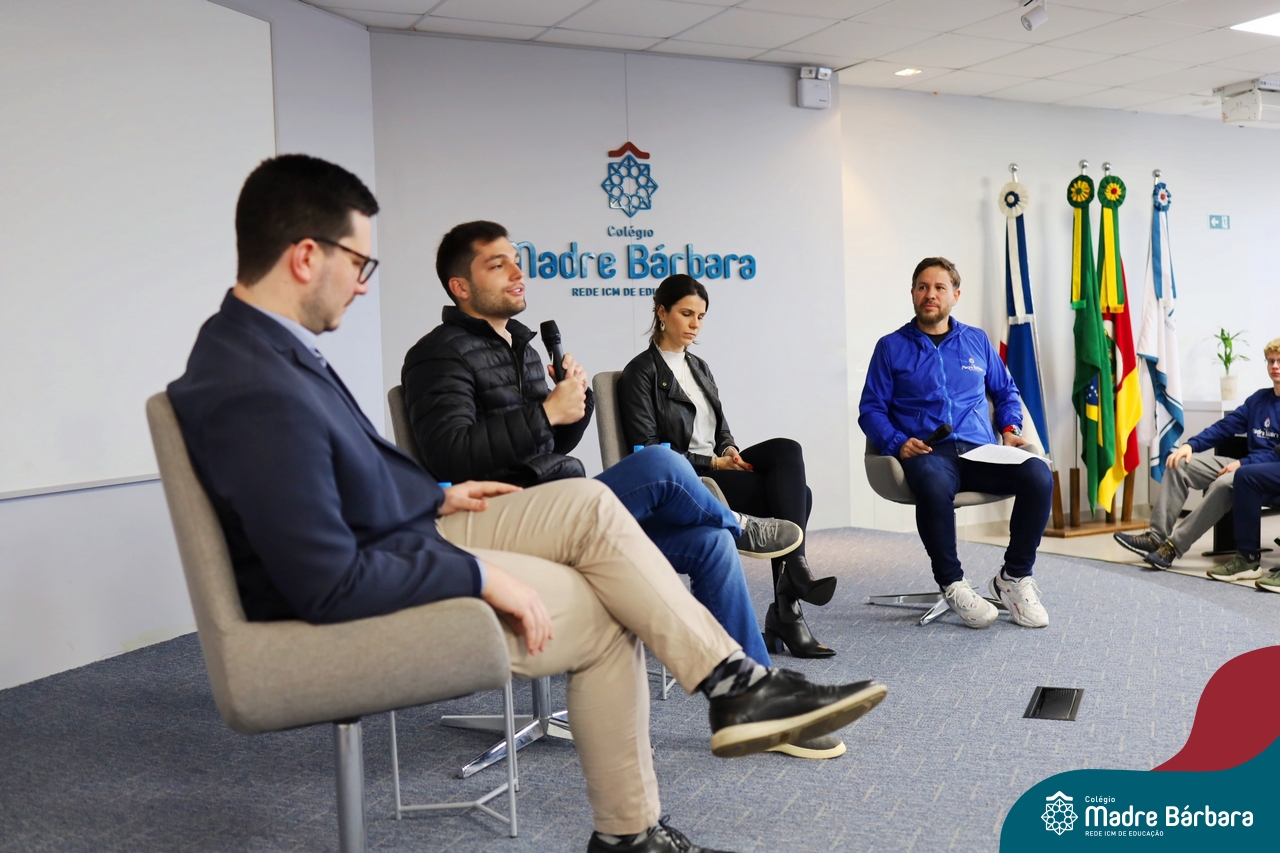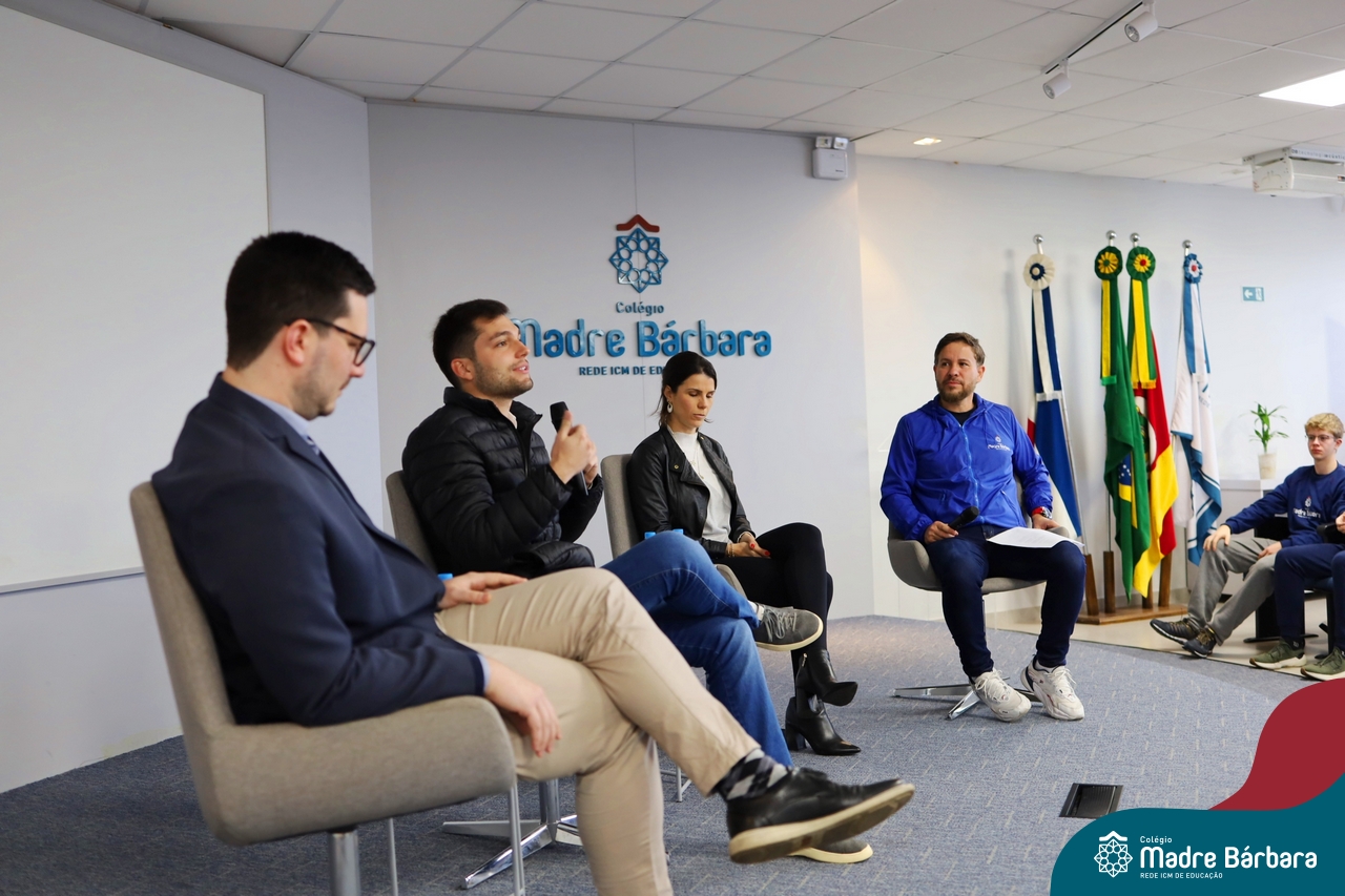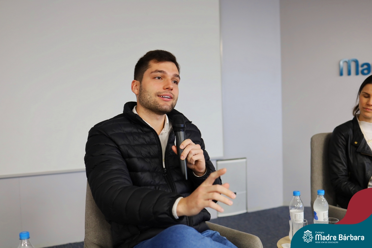A escolha profissional é um projeto de vida e não apenas de carreira. Trata-se de um processo de autoconhecimento, de compreensão de suas habilidades e da busca constante por aprendizados. Sabendo que toda esta caminhada inicia muito antes da graduação, na manhã da última quinta-feira (07.07), os ex-alunos Augusto Armani, Gabriel Ely e Gabriela Pedó, estiveram no Colégio Madre Bárbara – Rede ICM para compartilhar com os estudantes do Ensino Médio um pouco sobre sua trajetória profissional e explorar como o Colégio contribuiu em seus processos de formação integral. O momento contou com a participação e condução do professor David Orling que, juntamente com os convidados, relembrou momentos marcantes da trajetória escolar dos mesmos.