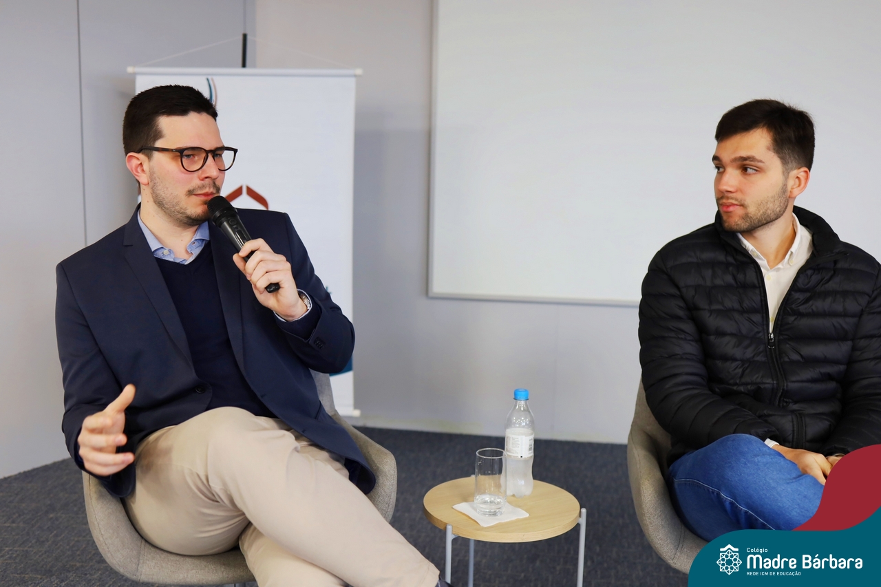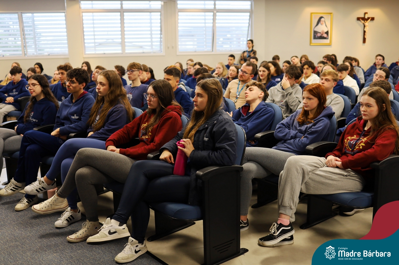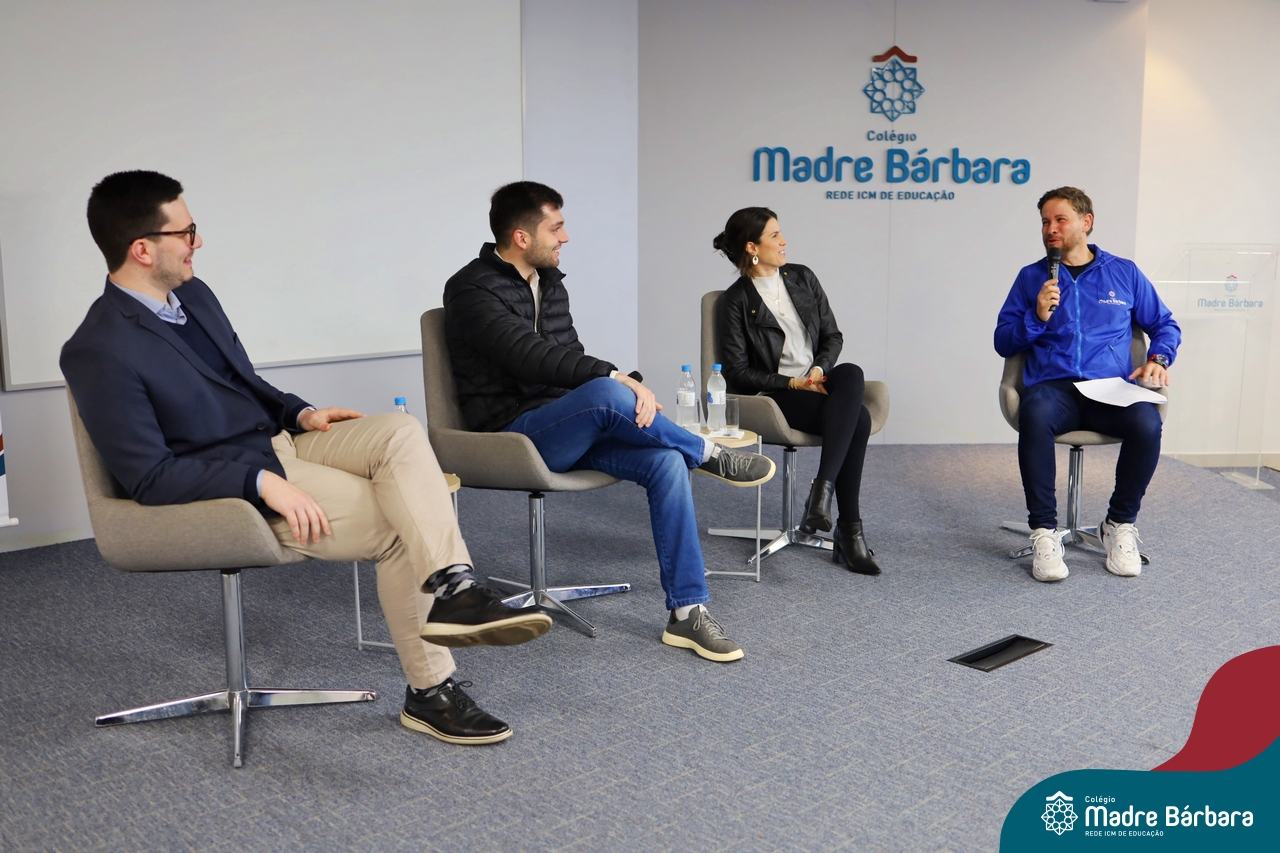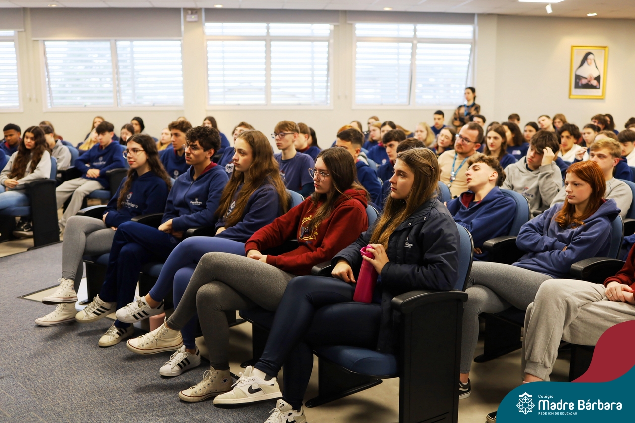 A escolha profissional é um projeto de vida e não apenas de carreira. Trata-se de um processo de autoconhecimento, de compreensão de suas habilidades e da busca constante por aprendizados. Sabendo que toda esta caminhada inicia muito antes da graduação, na manhã da última quinta-feira (07.07), os ex-alunos Augusto Armani, Gabriel Ely e Gabriela Pedó, estiveram no Colégio Madre Bárbara – Rede ICM para compartilhar com os estudantes do Ensino Médio um pouco sobre sua trajetória profissional e explorar como o Colégio contribuiu em seus processos de formação integral. O momento contou com a participação e condução do professor David Orling que, juntamente com os convidados, relembrou momentos marcantes da trajetória escolar dos mesmos.