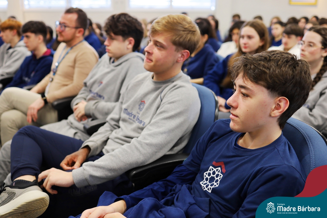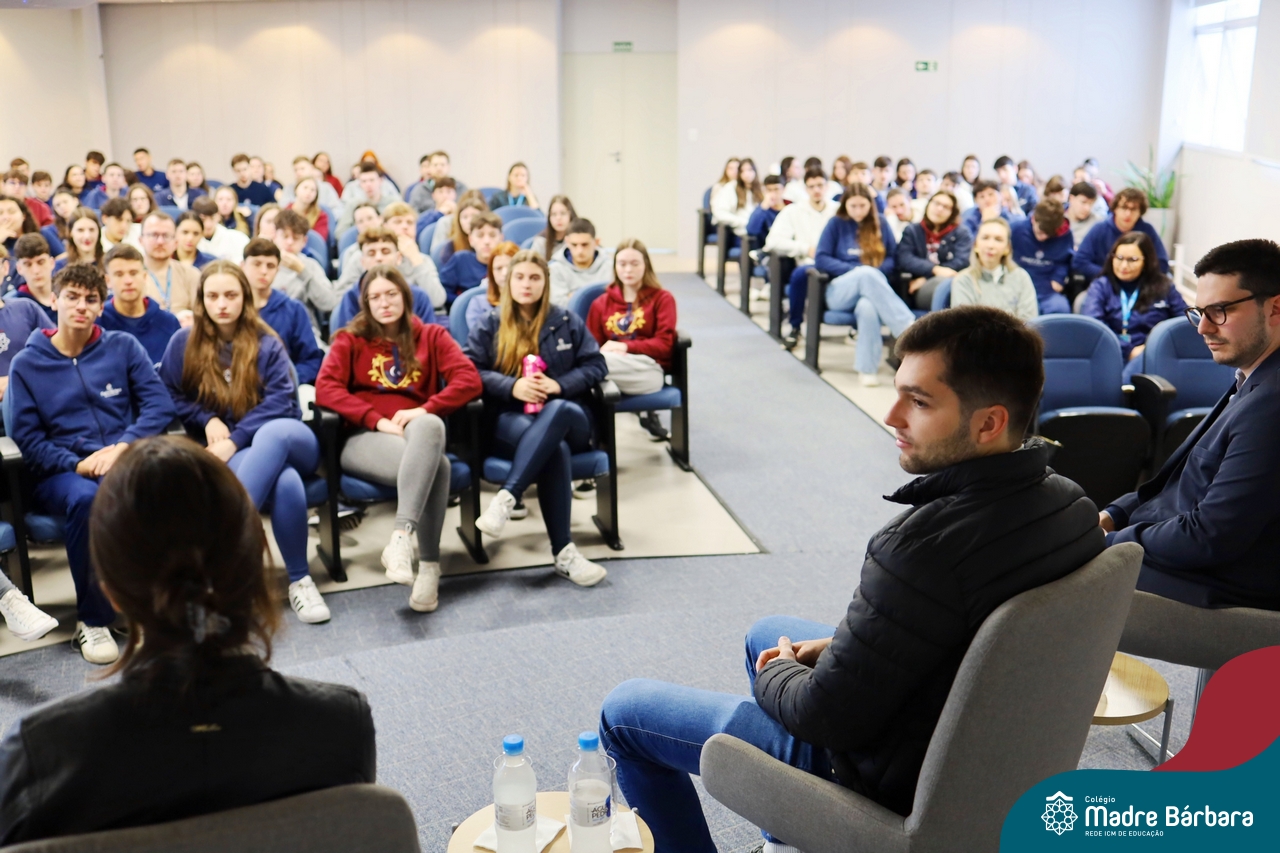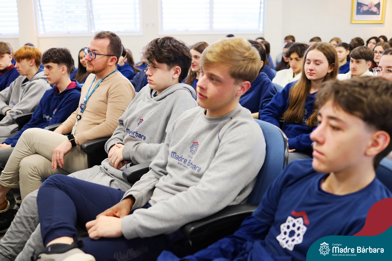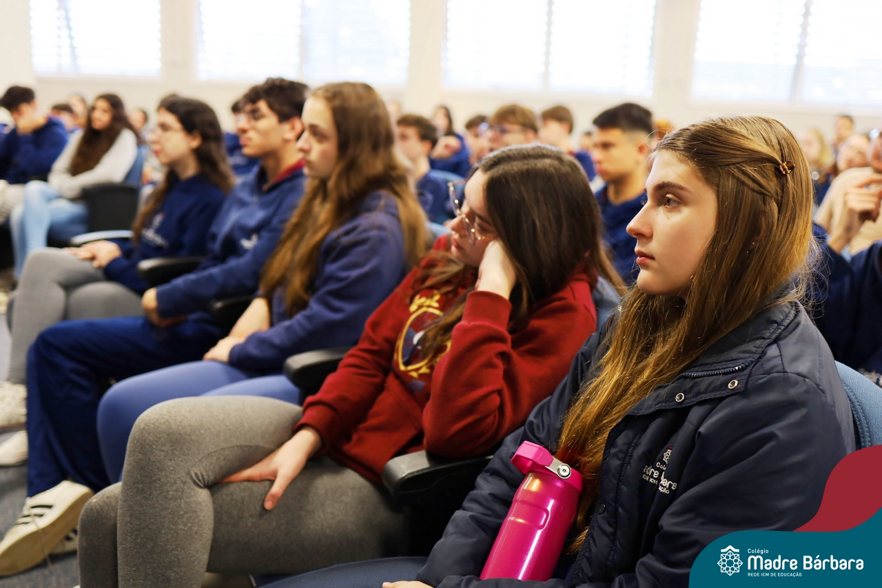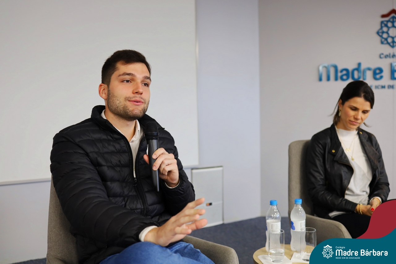 A escolha profissional é um projeto de vida e não apenas de carreira. Trata-se de um processo de autoconhecimento, de compreensão de suas habilidades e da busca constante por aprendizados. Sabendo que toda esta caminhada inicia muito antes da graduação, na manhã da última quinta-feira (07.07), os ex-alunos Augusto Armani, Gabriel Ely e Gabriela Pedó, estiveram no Colégio Madre Bárbara – Rede ICM para compartilhar com os estudantes do Ensino Médio um pouco sobre sua trajetória profissional e explorar como o Colégio contribuiu em seus processos de formação integral. O momento contou com a participação e condução do professor David Orling que, juntamente com os convidados, relembrou momentos marcantes da trajetória escolar dos mesmos.