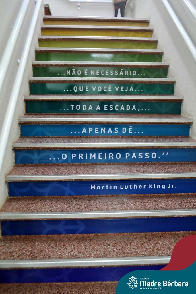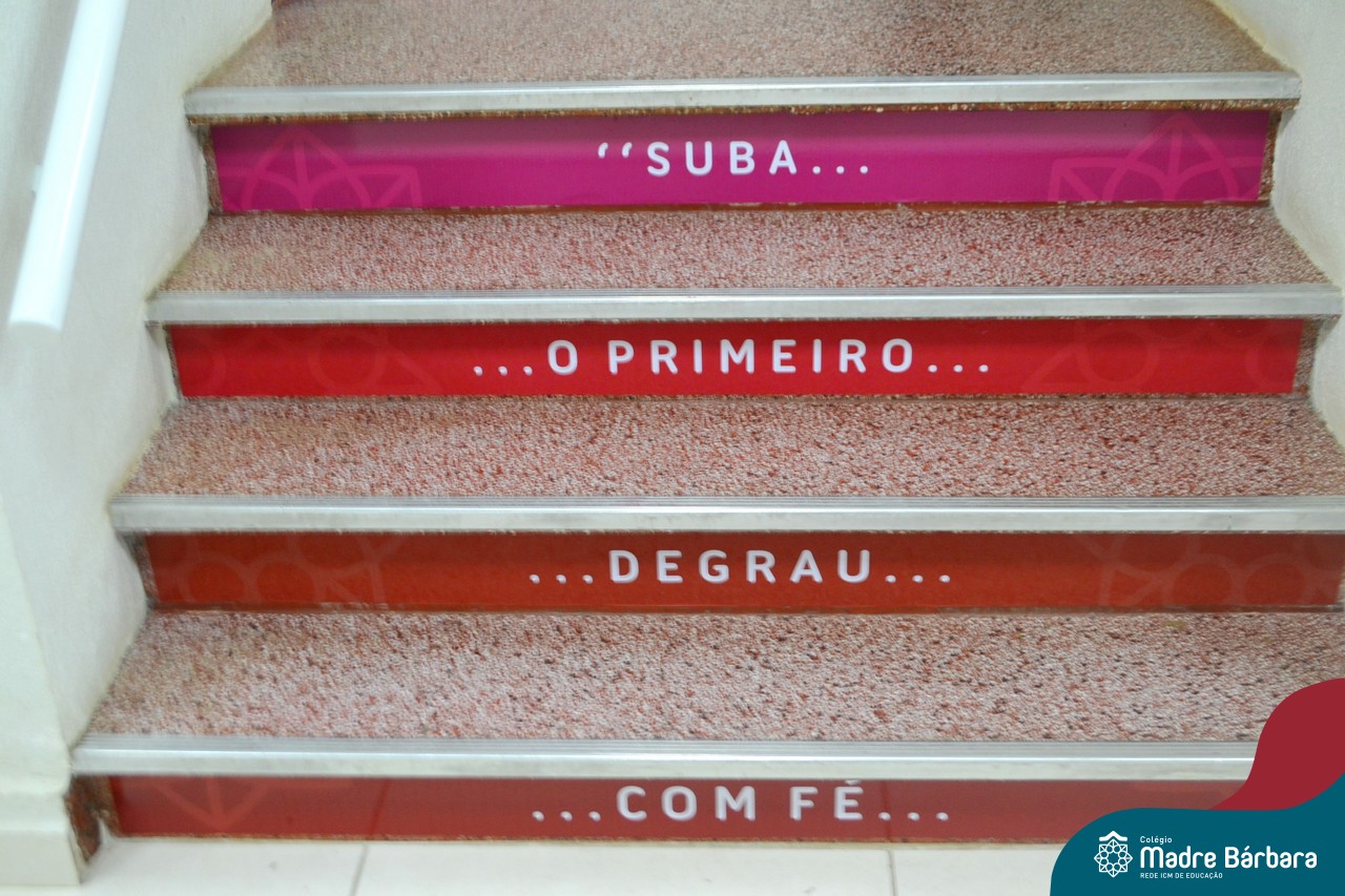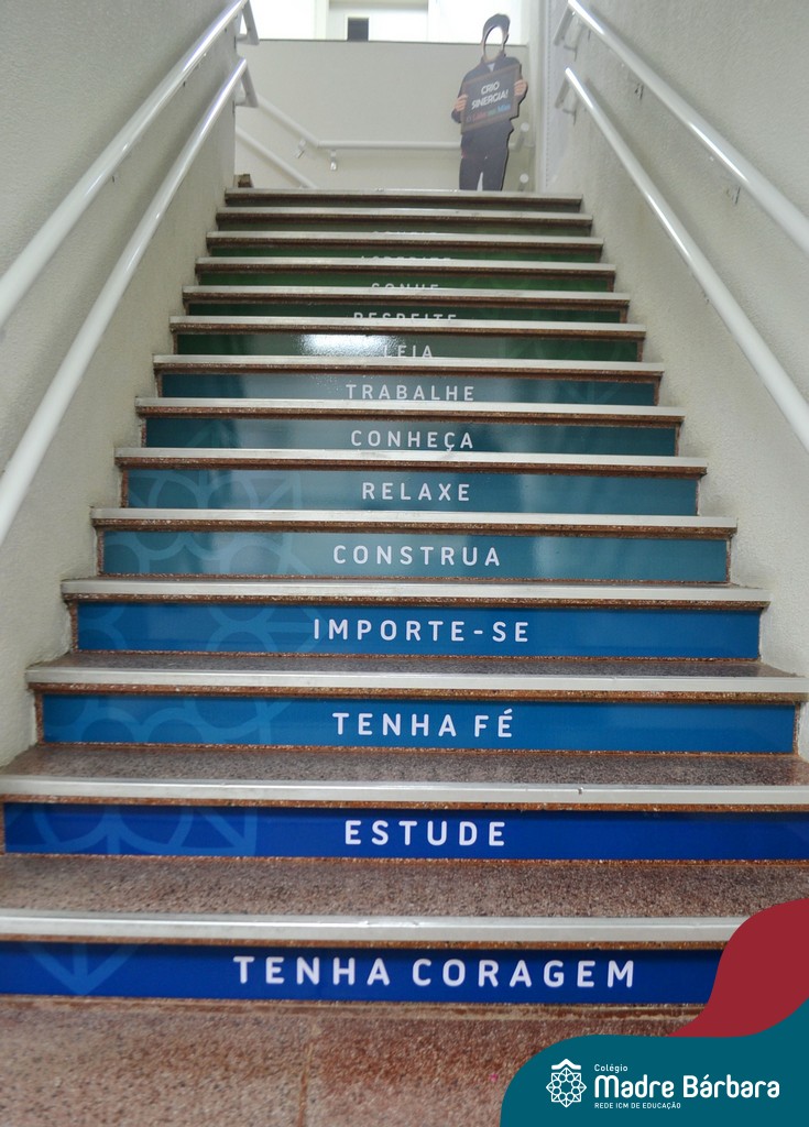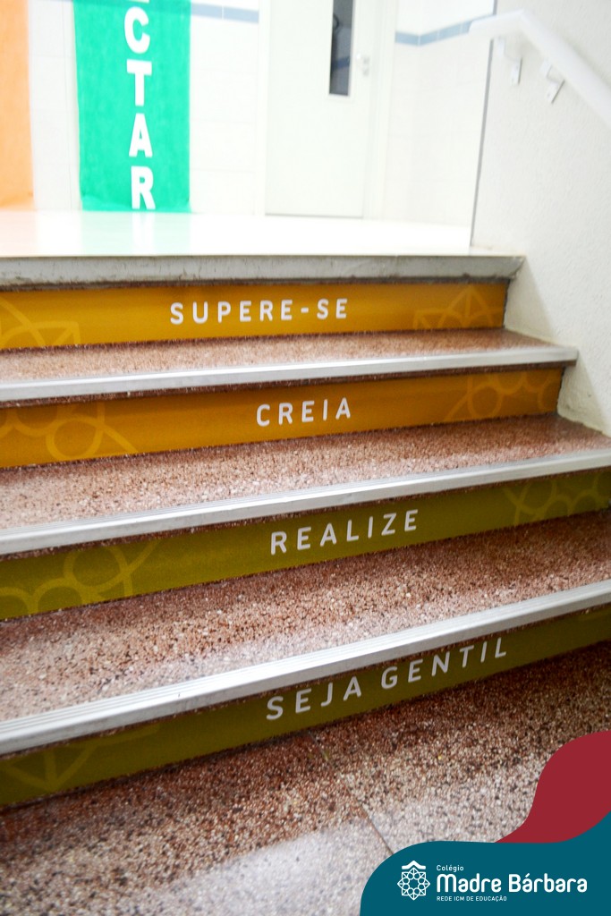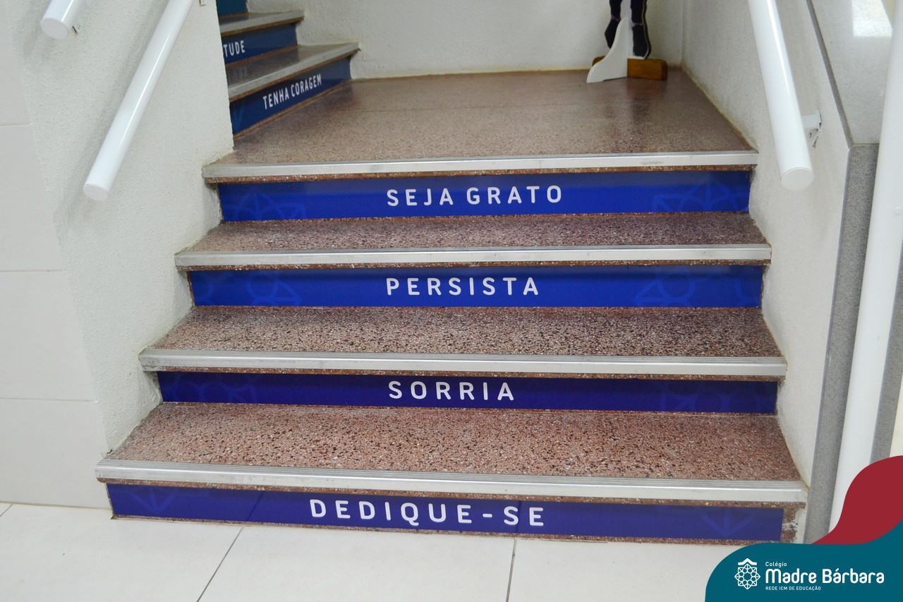 Nessa quarta-feira (26.02) os alunos e professores dos Anos Iniciais do Colégio Madre Bárbara – Rede ICM foram surpreendidos ao subir a escada do prédio. Em todos os andares, palavras de motivação, citações e dicas de livros enfeitavam e coloriam os degraus. A novidade além de levar mais conhecimento e fazer com que subam animados para suas salas, busca inserir e lembrar os alunos dos sete hábitos do Líder em Mim (OLEM).