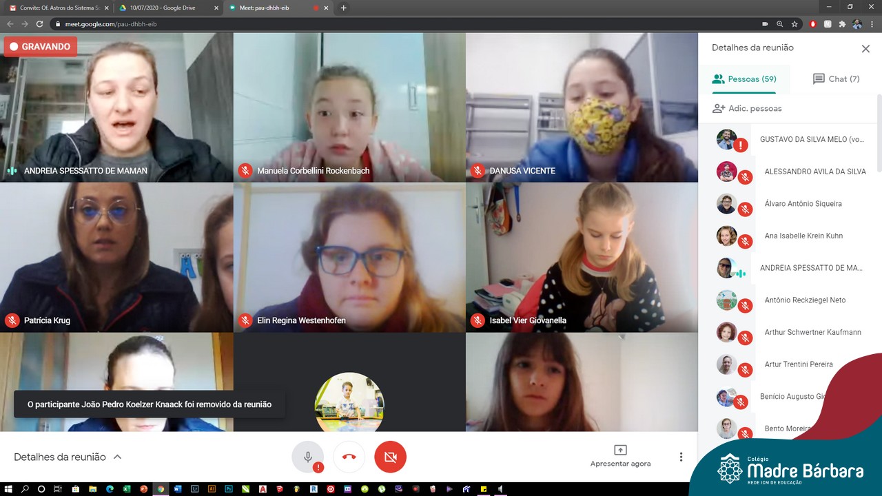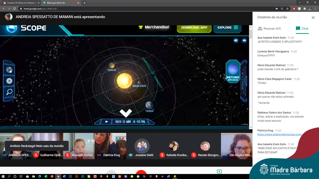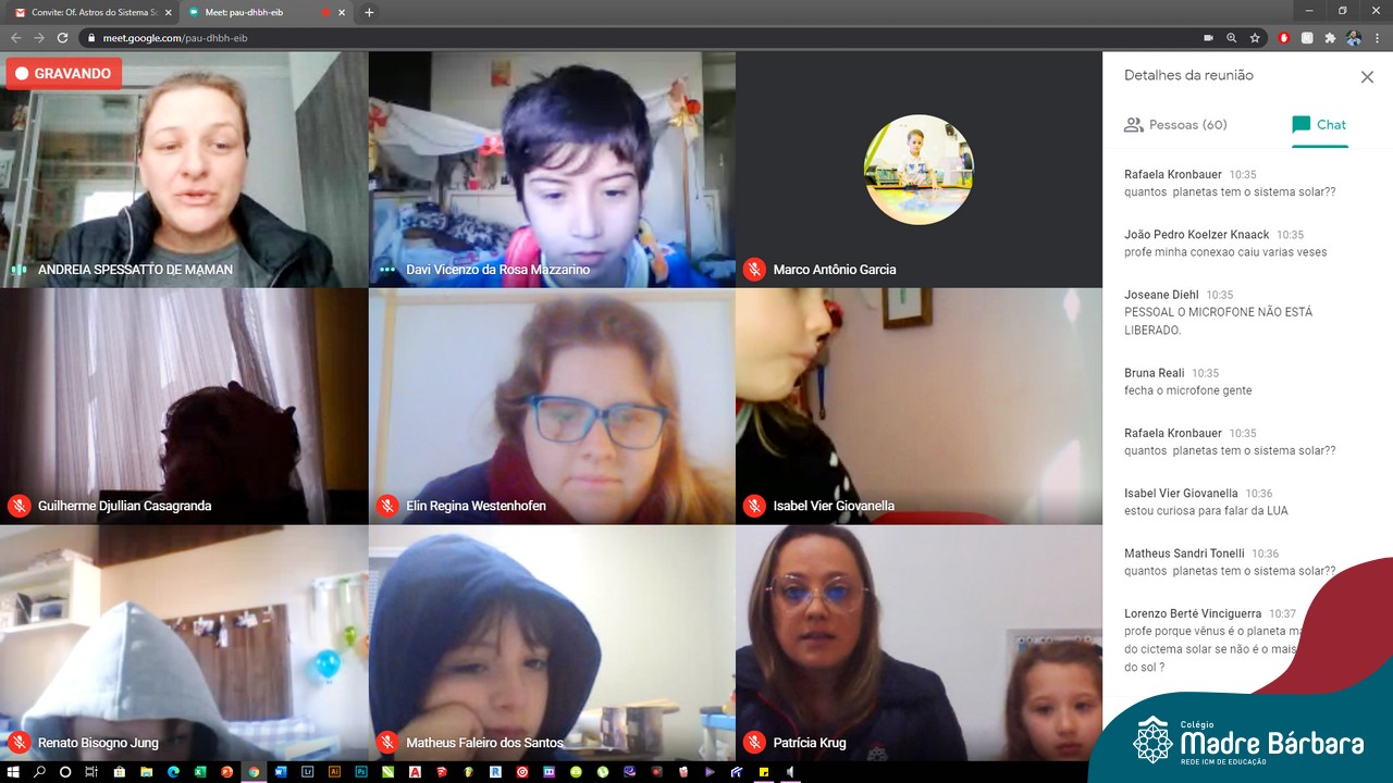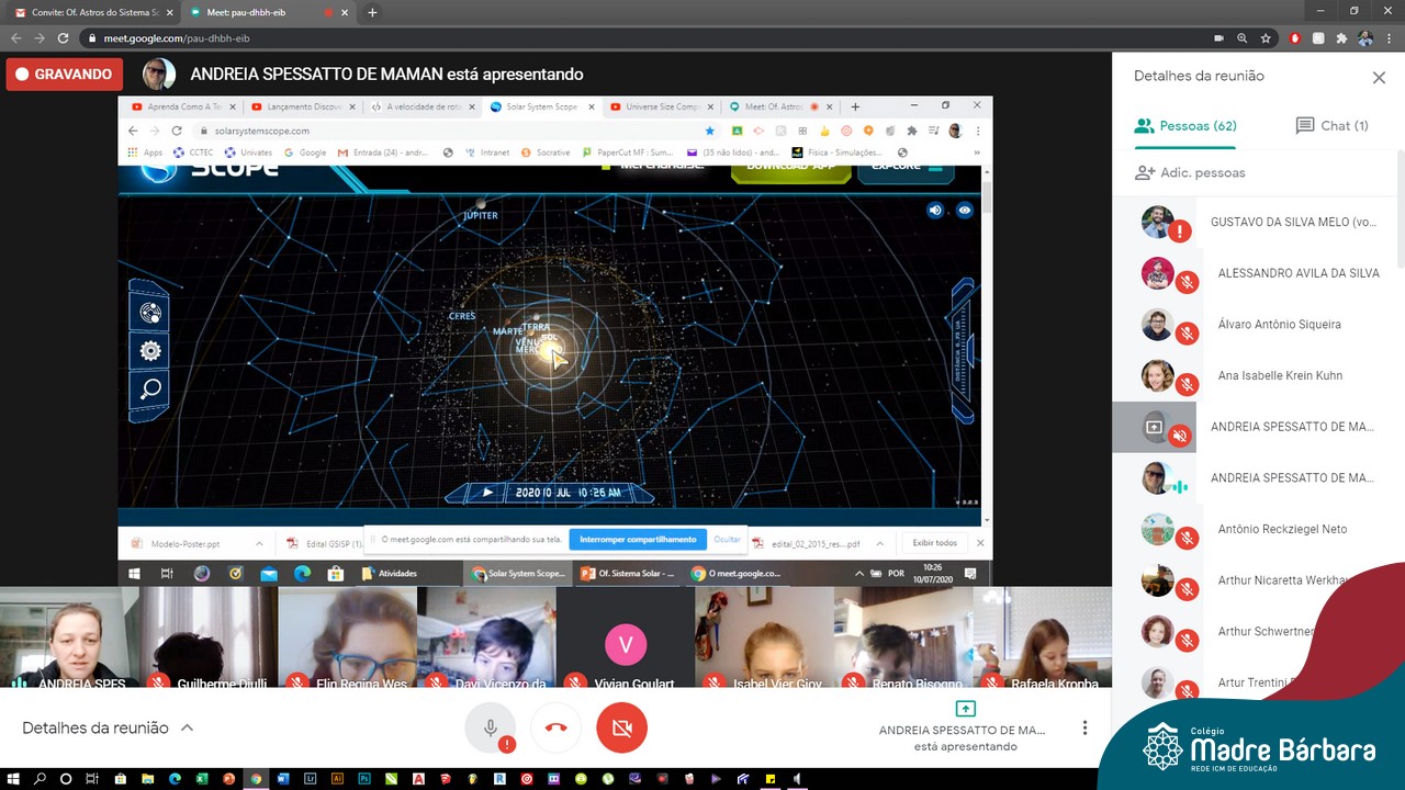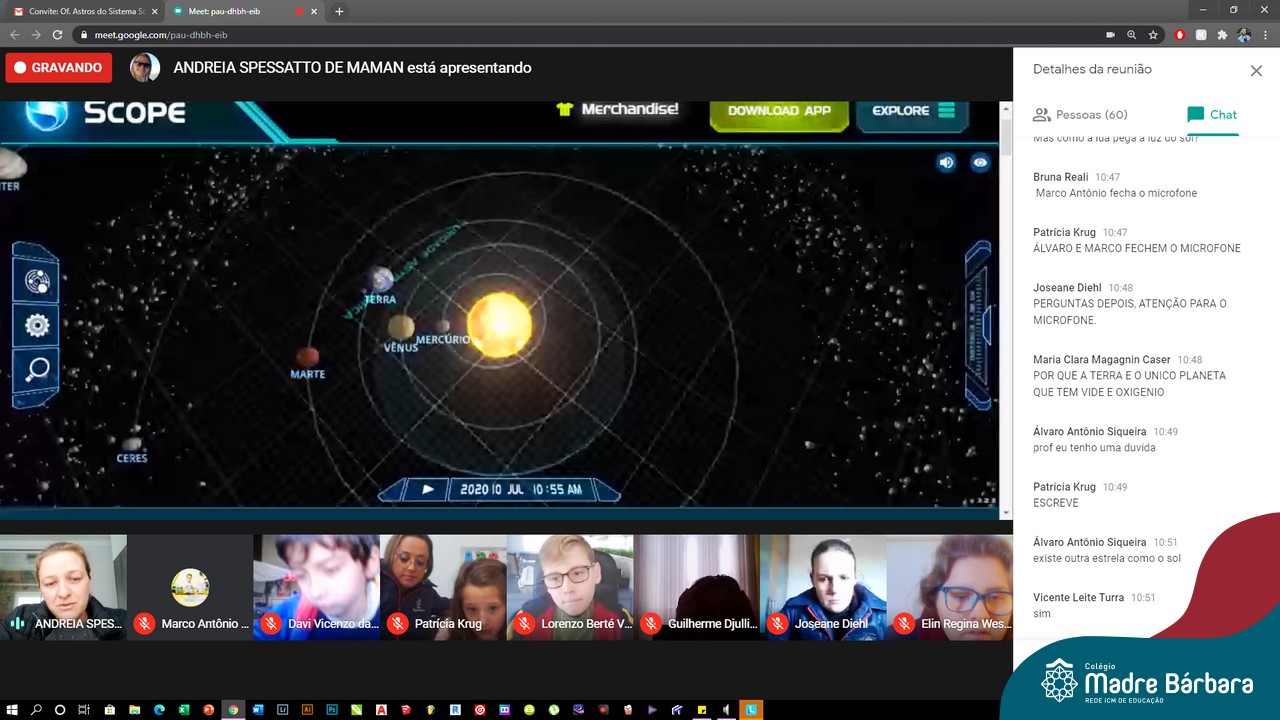 Em julho, as turmas 41, 42 e 44, juntamente com as professoras Patrícia Krug, Joseane Diehl e Élin Westenhofen, participaram da oficina virtualizada “Desvendando o Céu”, ministrada pela Professora e Coordenadora do projeto Planetário Univates Andréia Spessatto De Maman.