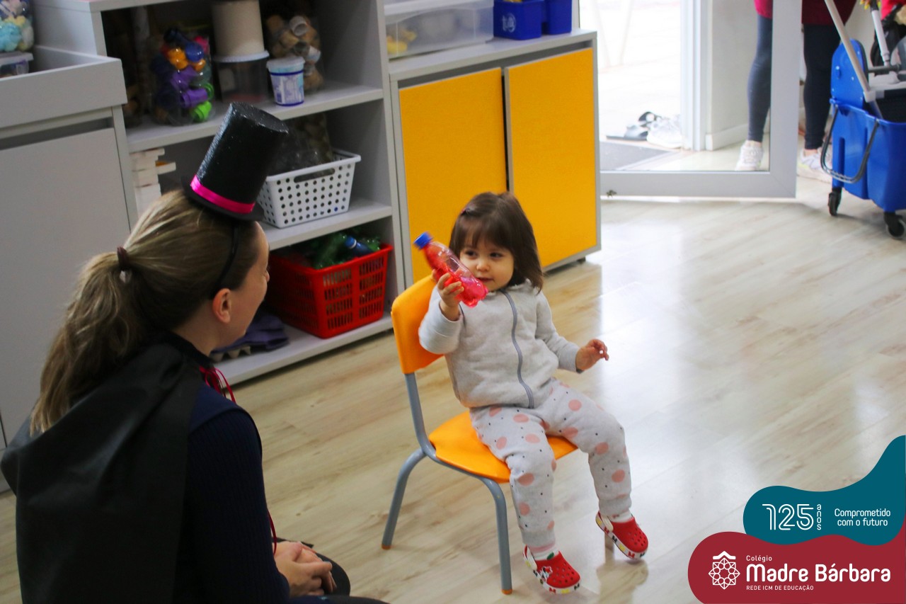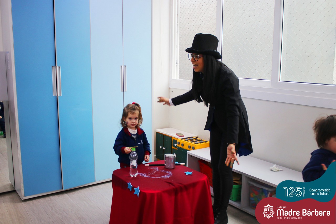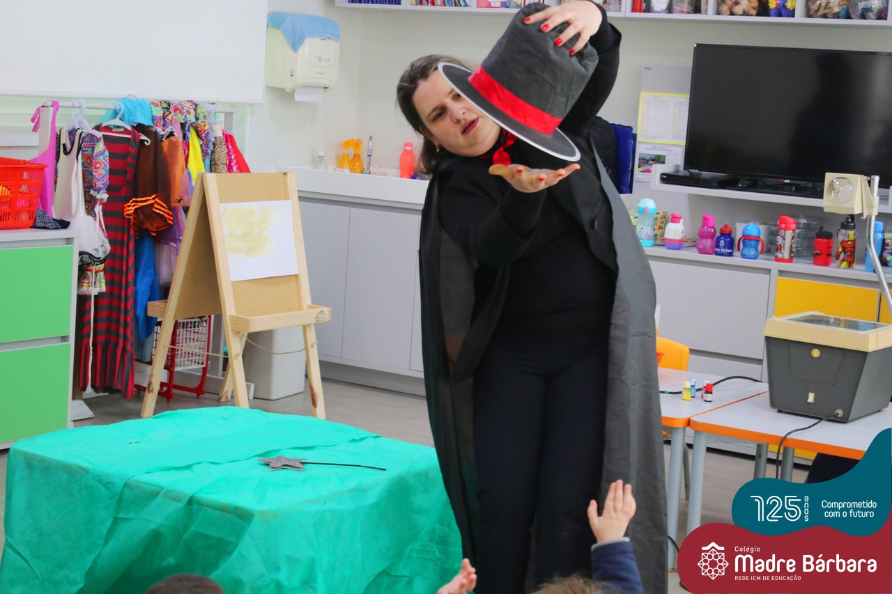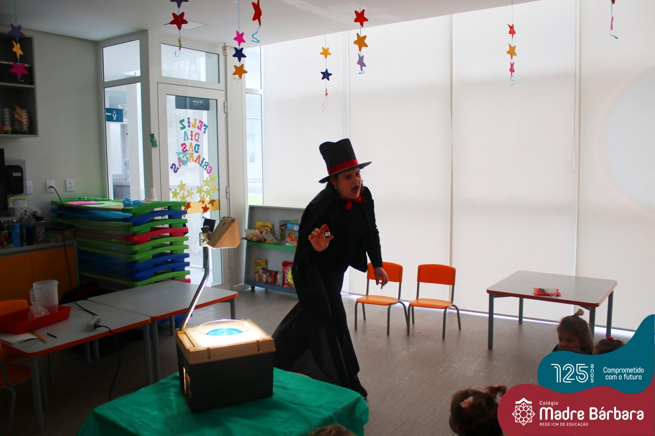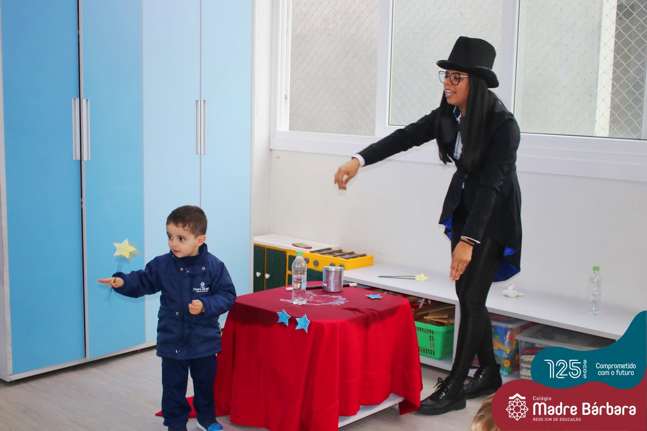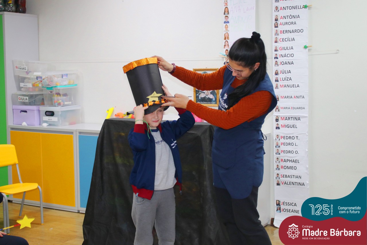 O primeiro dia da Semana da Criança foi marcado por encanto e magia. As crianças foram recebidas em um ambiente especialmente preparado com muita cor, cartolas e estrelas! O dia foi de mágicas que empolgaram as crianças e professoras. Abracadabra…simsalabim!!!