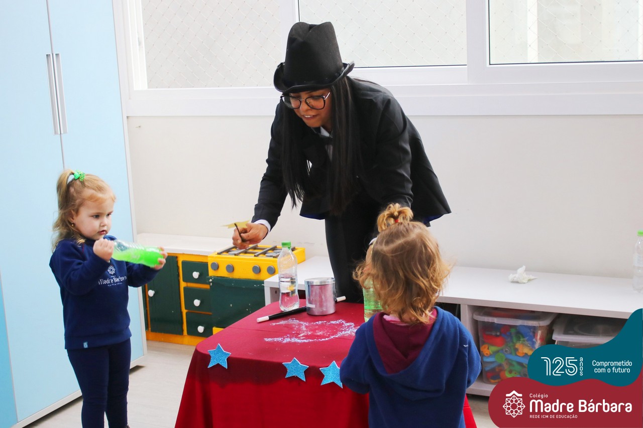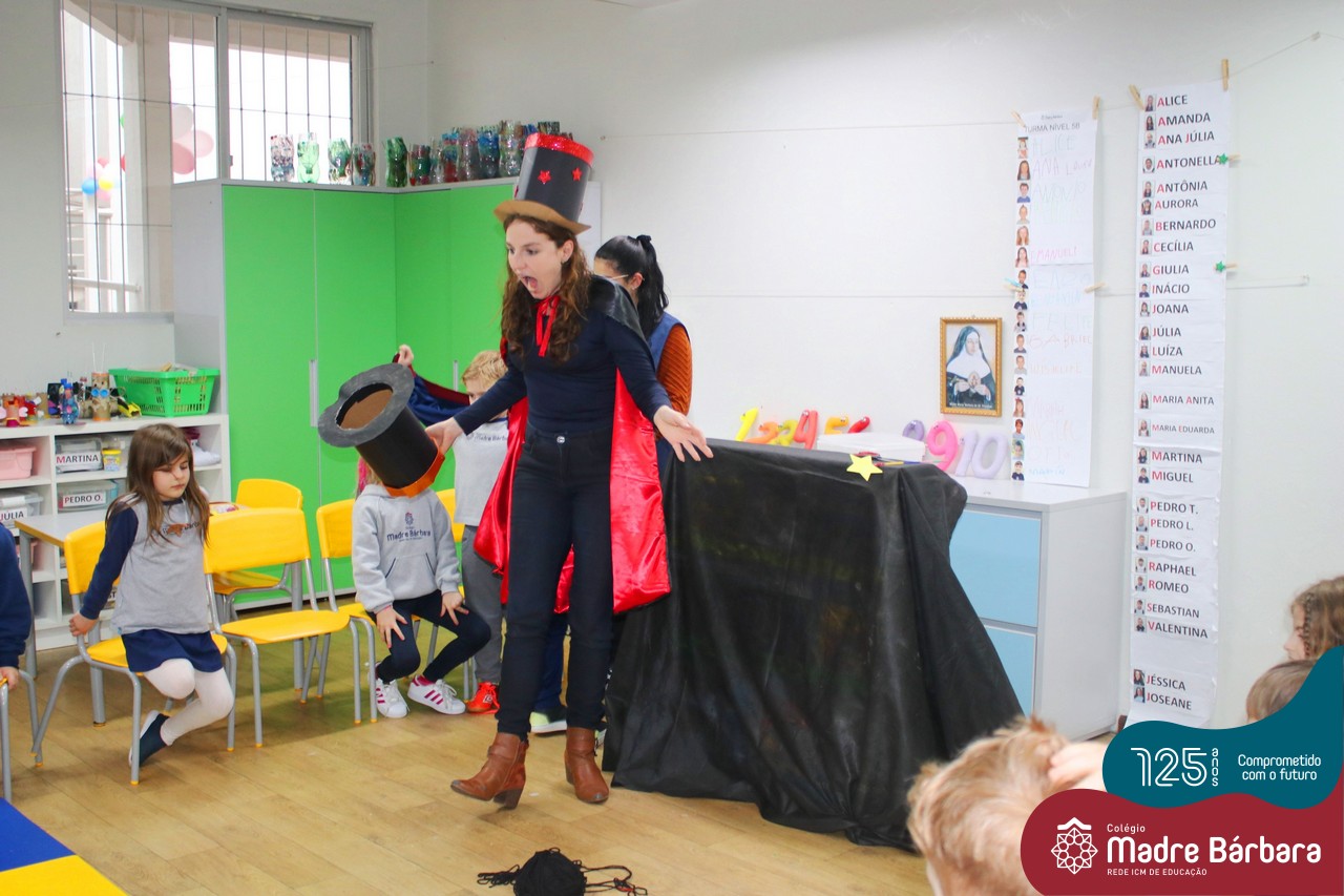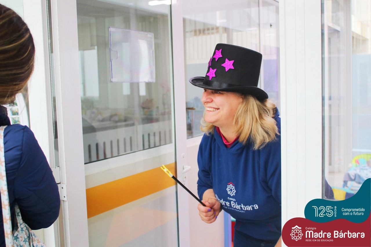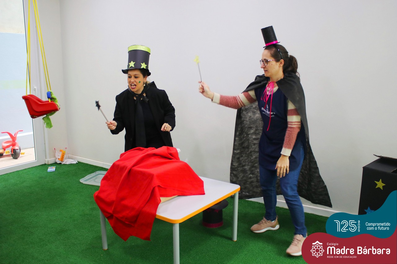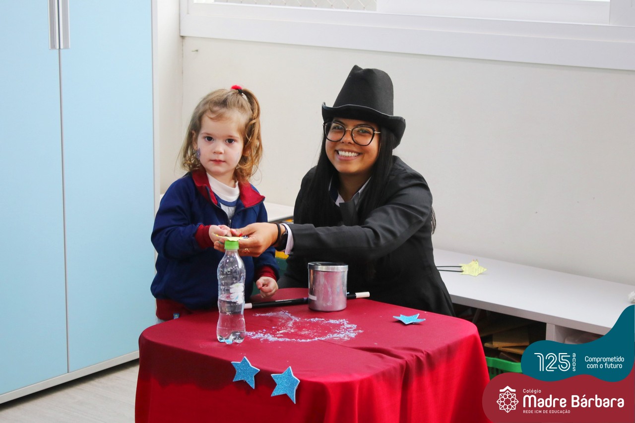 O primeiro dia da Semana da Criança foi marcado por encanto e magia. As crianças foram recebidas em um ambiente especialmente preparado com muita cor, cartolas e estrelas! O dia foi de mágicas que empolgaram as crianças e professoras. Abracadabra…simsalabim!!!