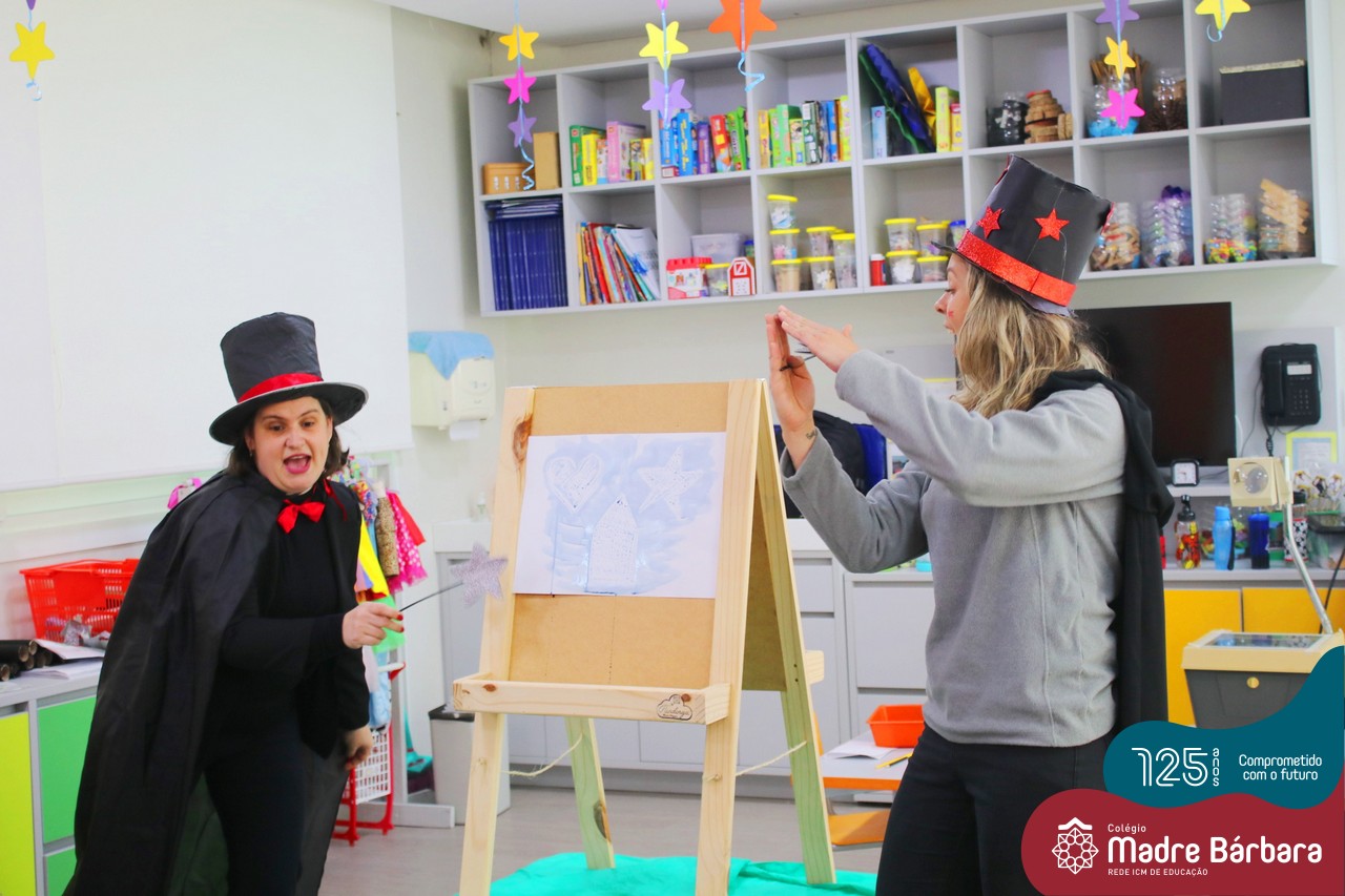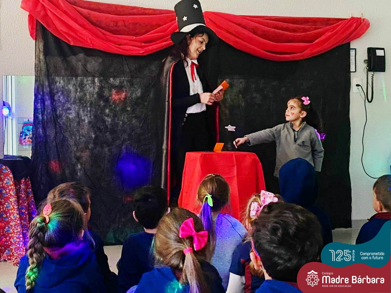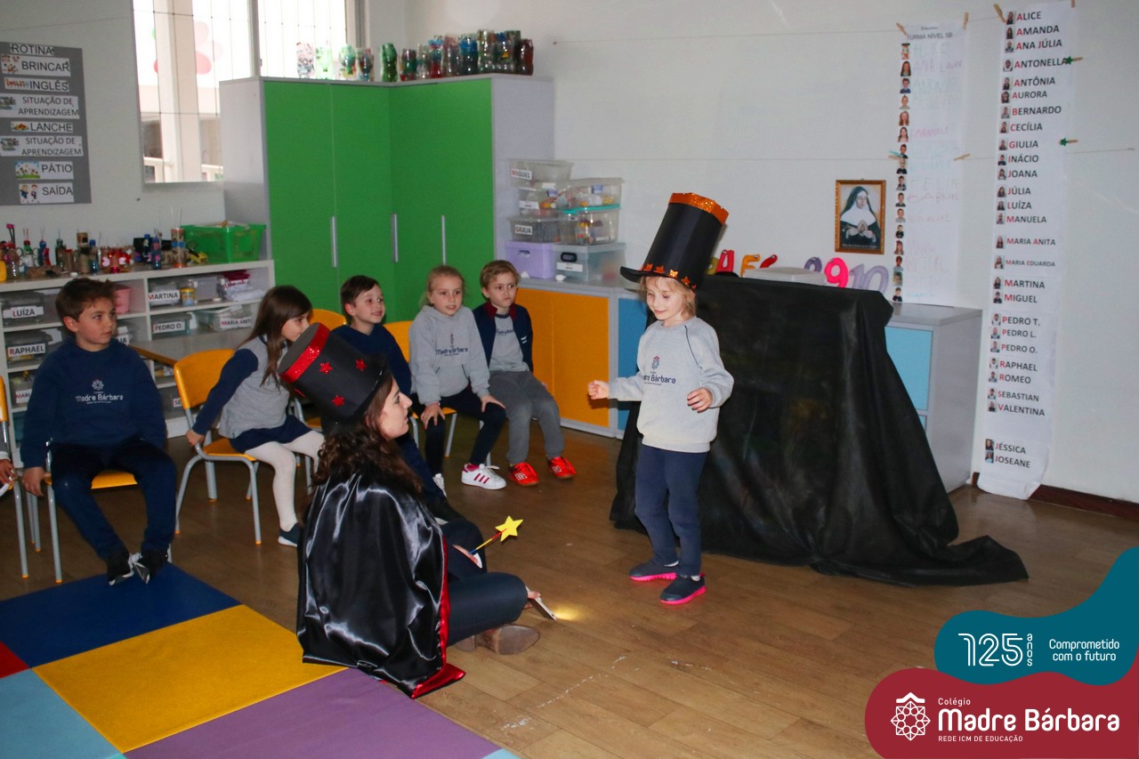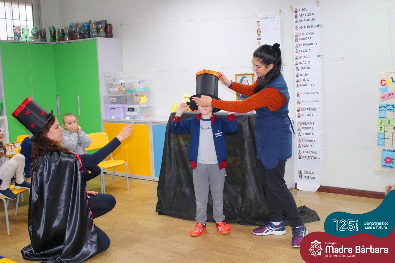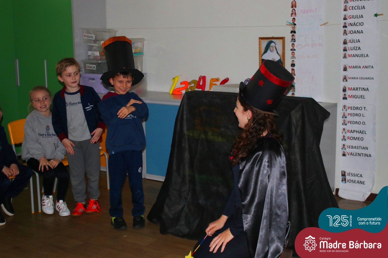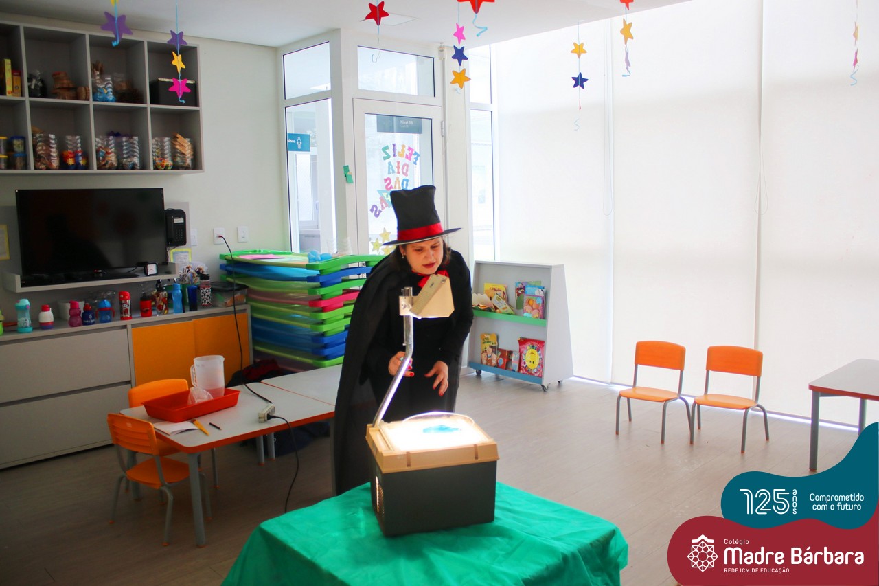 O primeiro dia da Semana da Criança foi marcado por encanto e magia. As crianças foram recebidas em um ambiente especialmente preparado com muita cor, cartolas e estrelas! O dia foi de mágicas que empolgaram as crianças e professoras. Abracadabra…simsalabim!!!