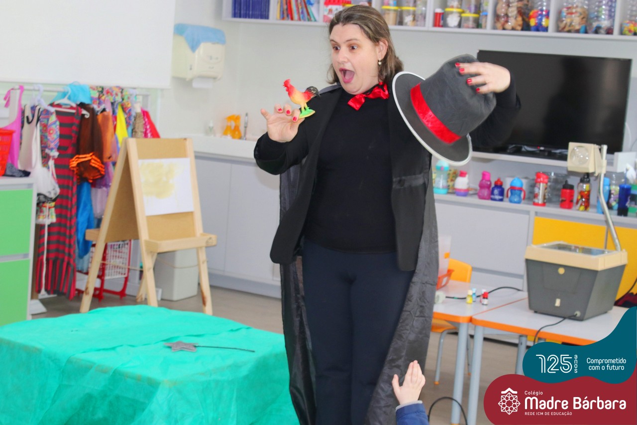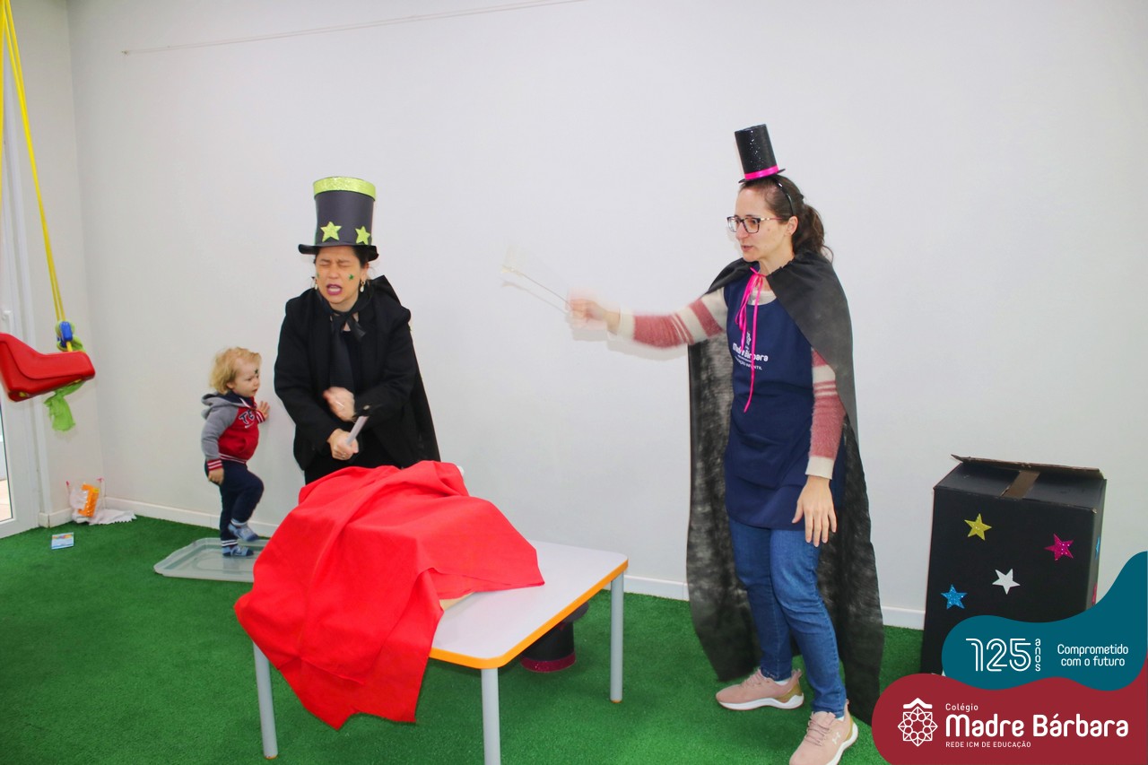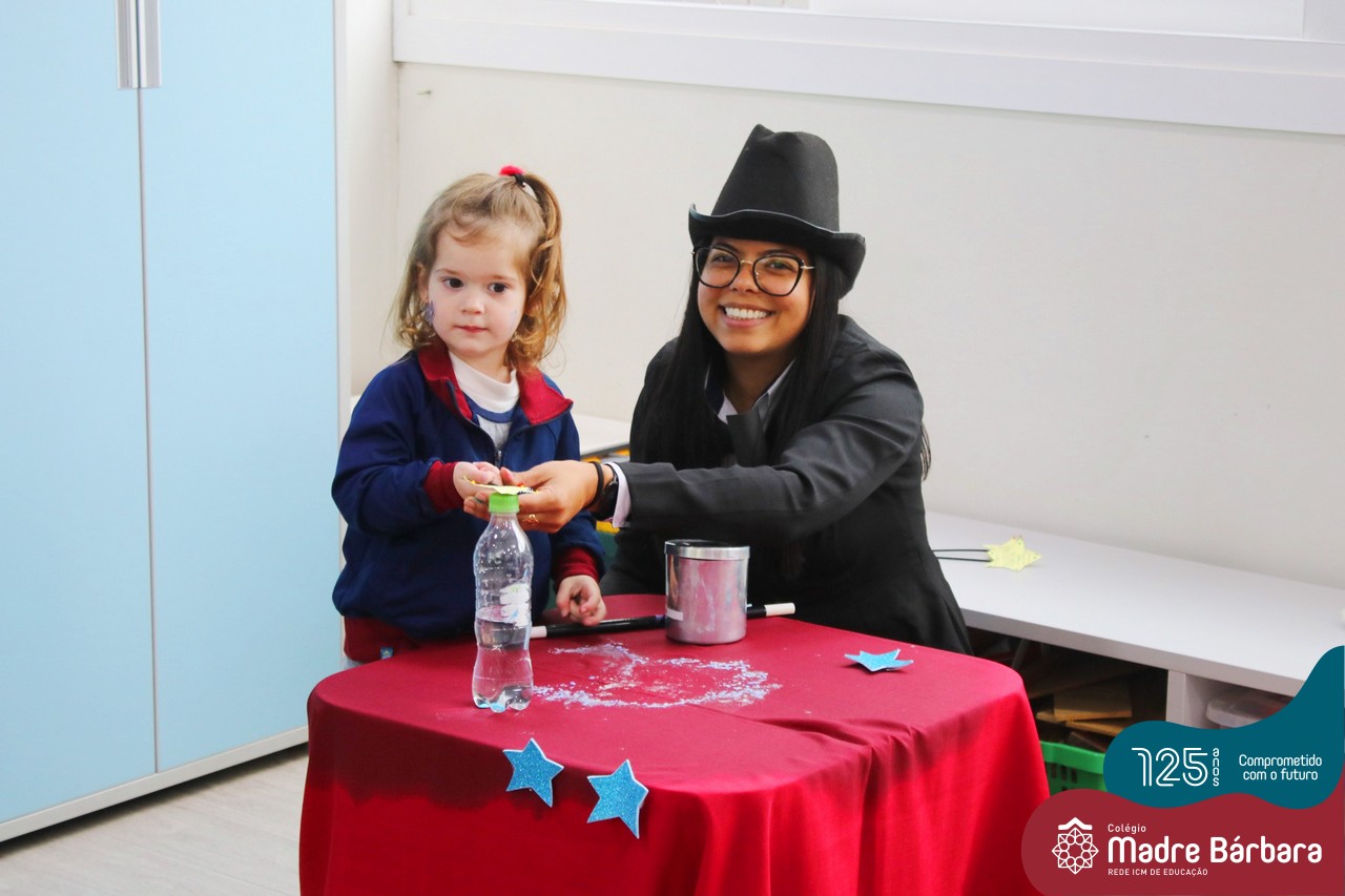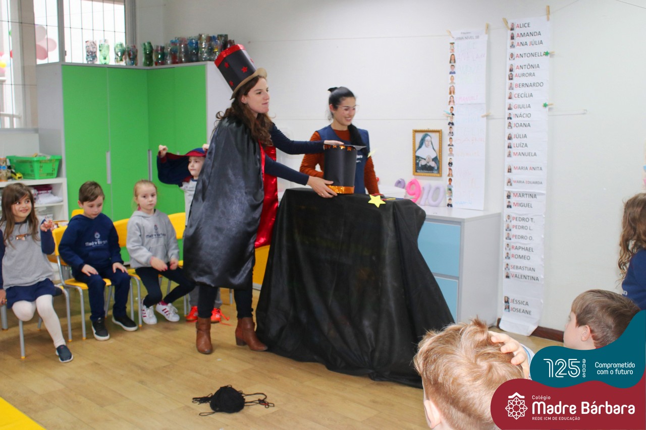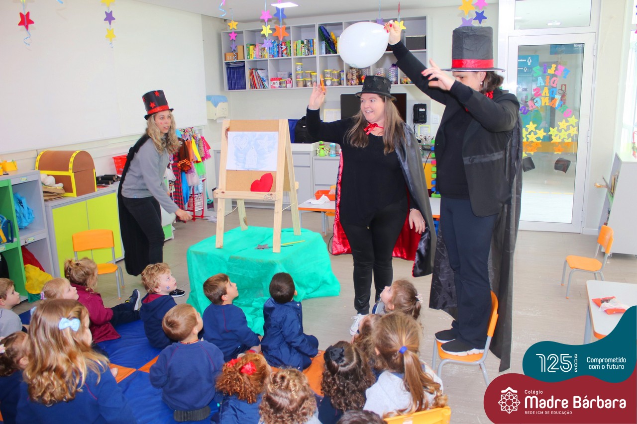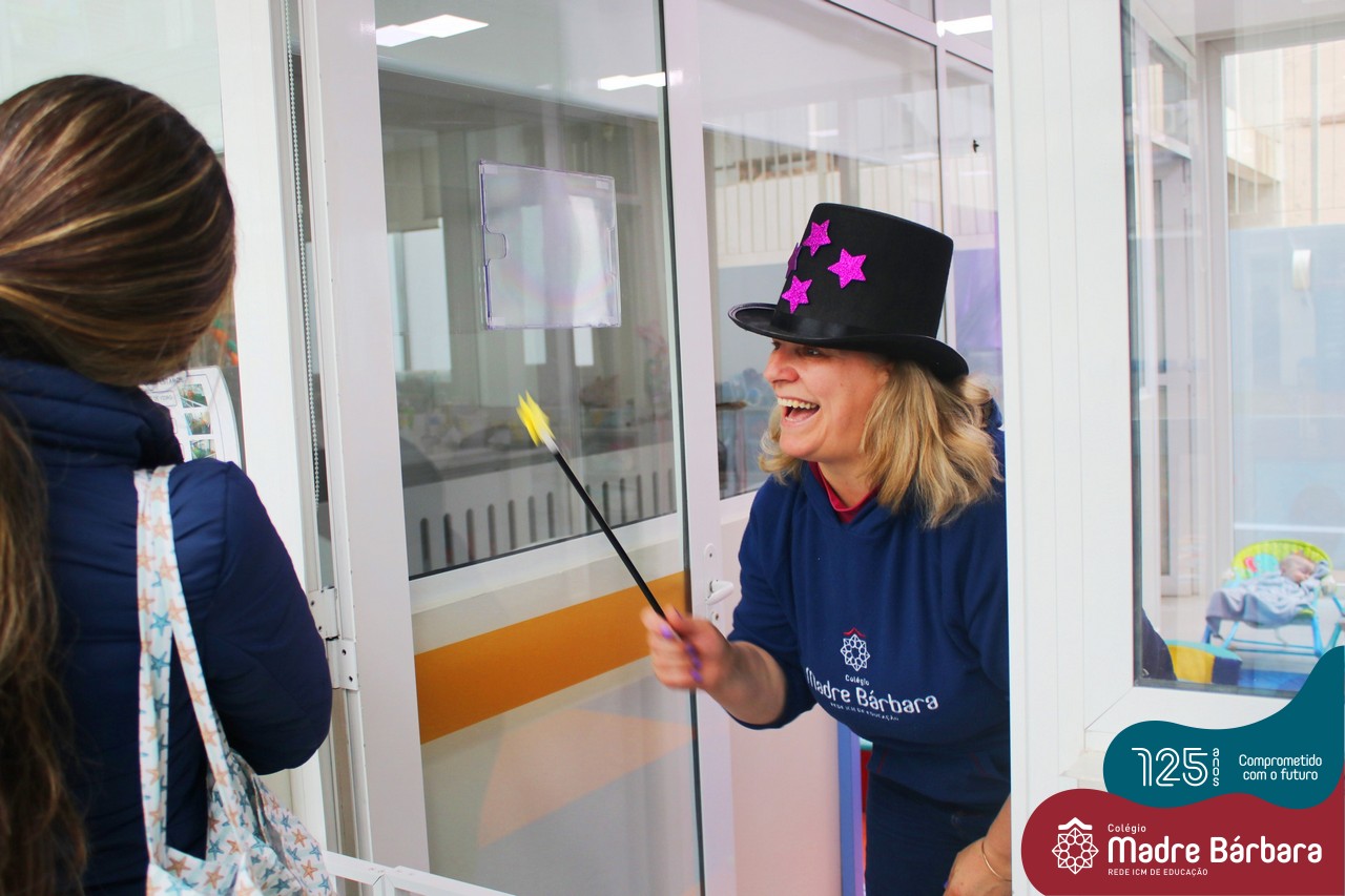 O primeiro dia da Semana da Criança foi marcado por encanto e magia. As crianças foram recebidas em um ambiente especialmente preparado com muita cor, cartolas e estrelas! O dia foi de mágicas que empolgaram as crianças e professoras. Abracadabra…simsalabim!!!