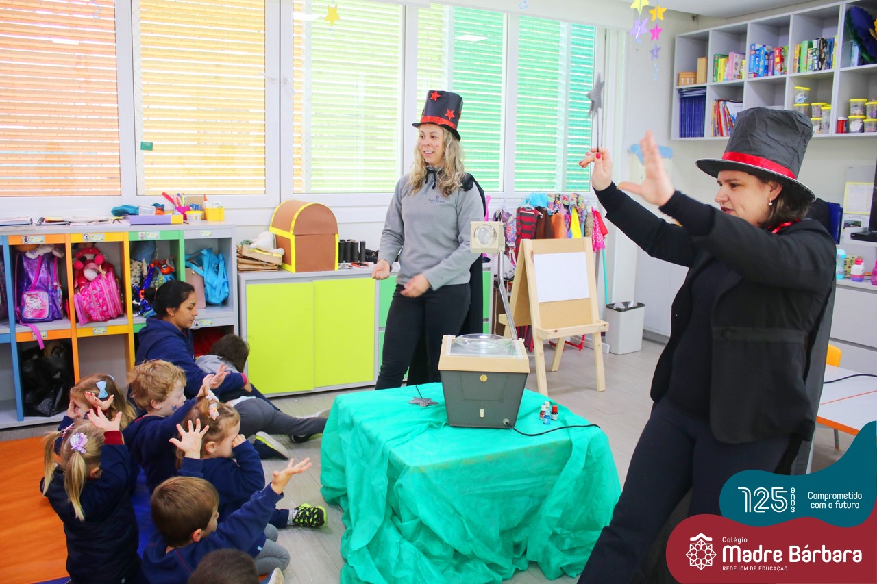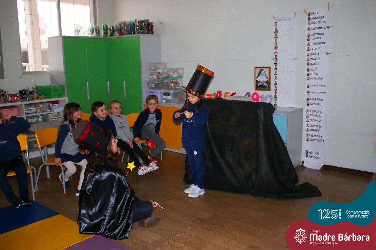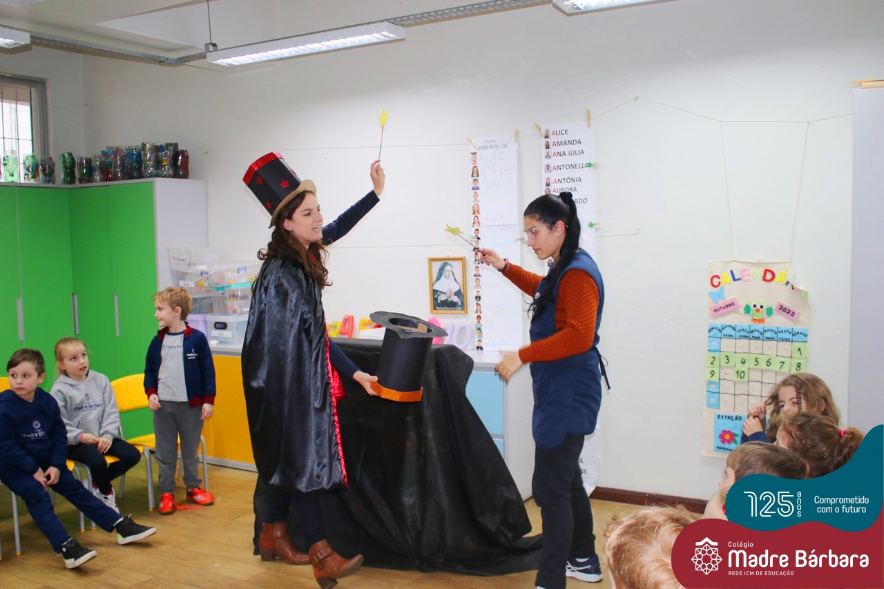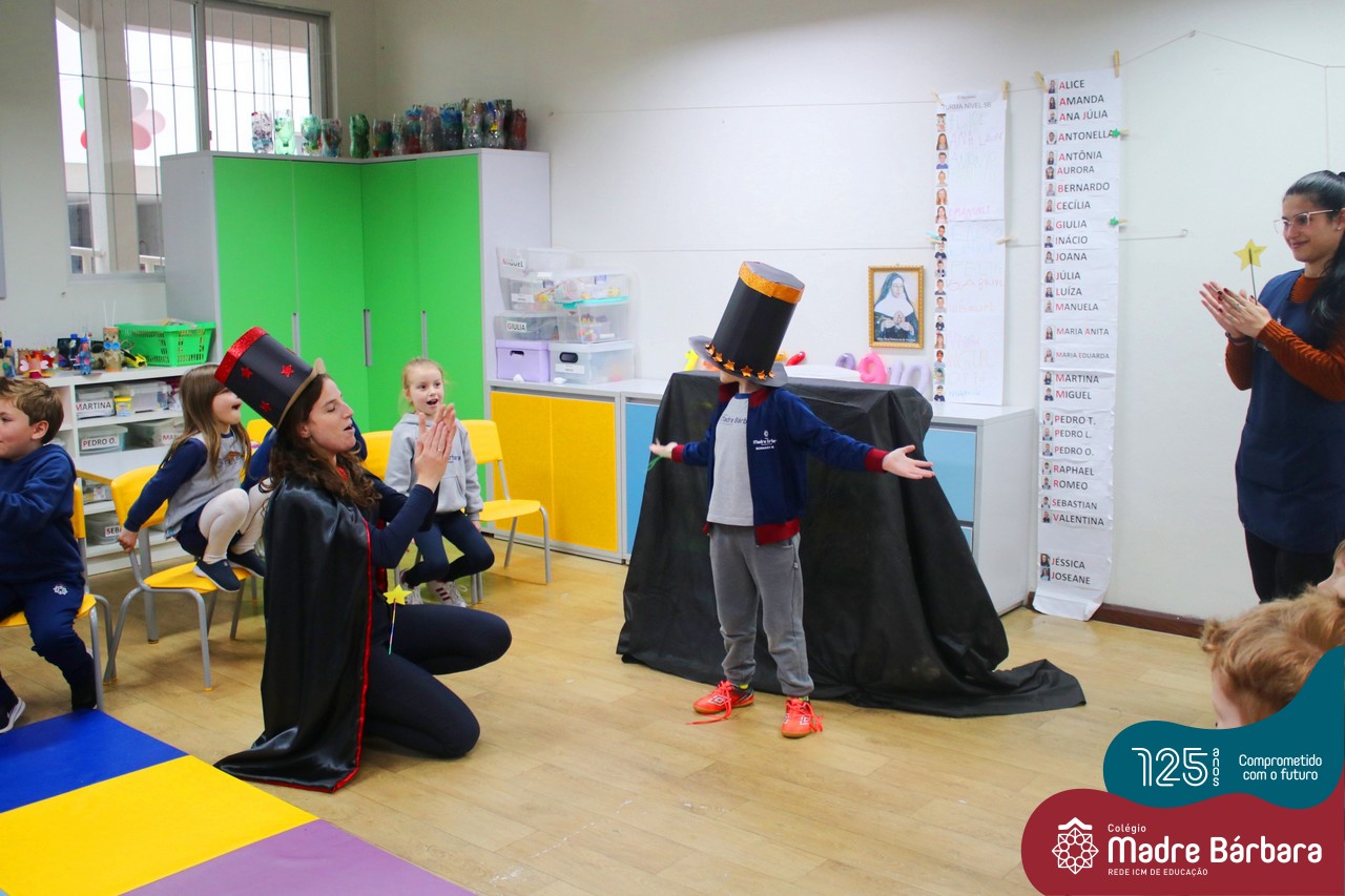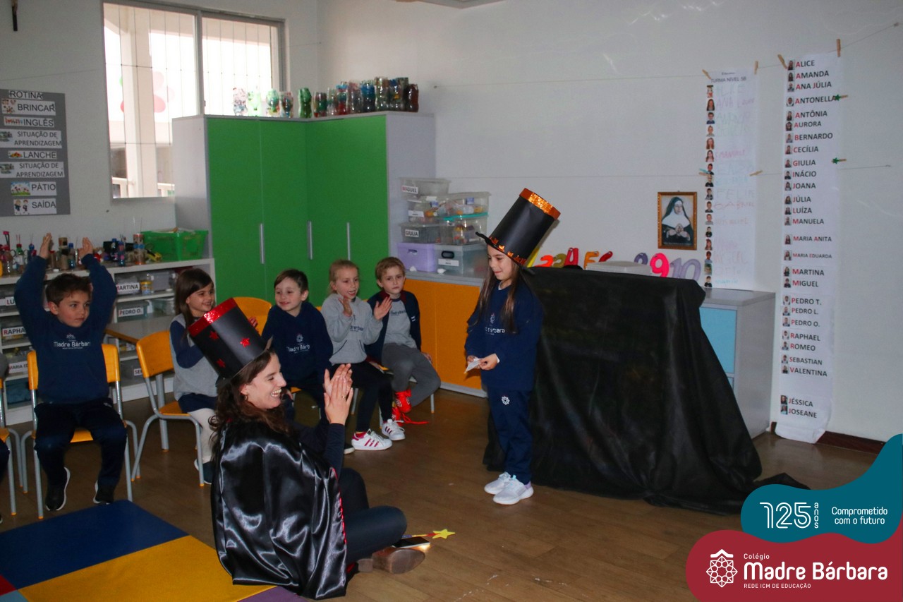 O primeiro dia da Semana da Criança foi marcado por encanto e magia. As crianças foram recebidas em um ambiente especialmente preparado com muita cor, cartolas e estrelas! O dia foi de mágicas que empolgaram as crianças e professoras. Abracadabra…simsalabim!!!
