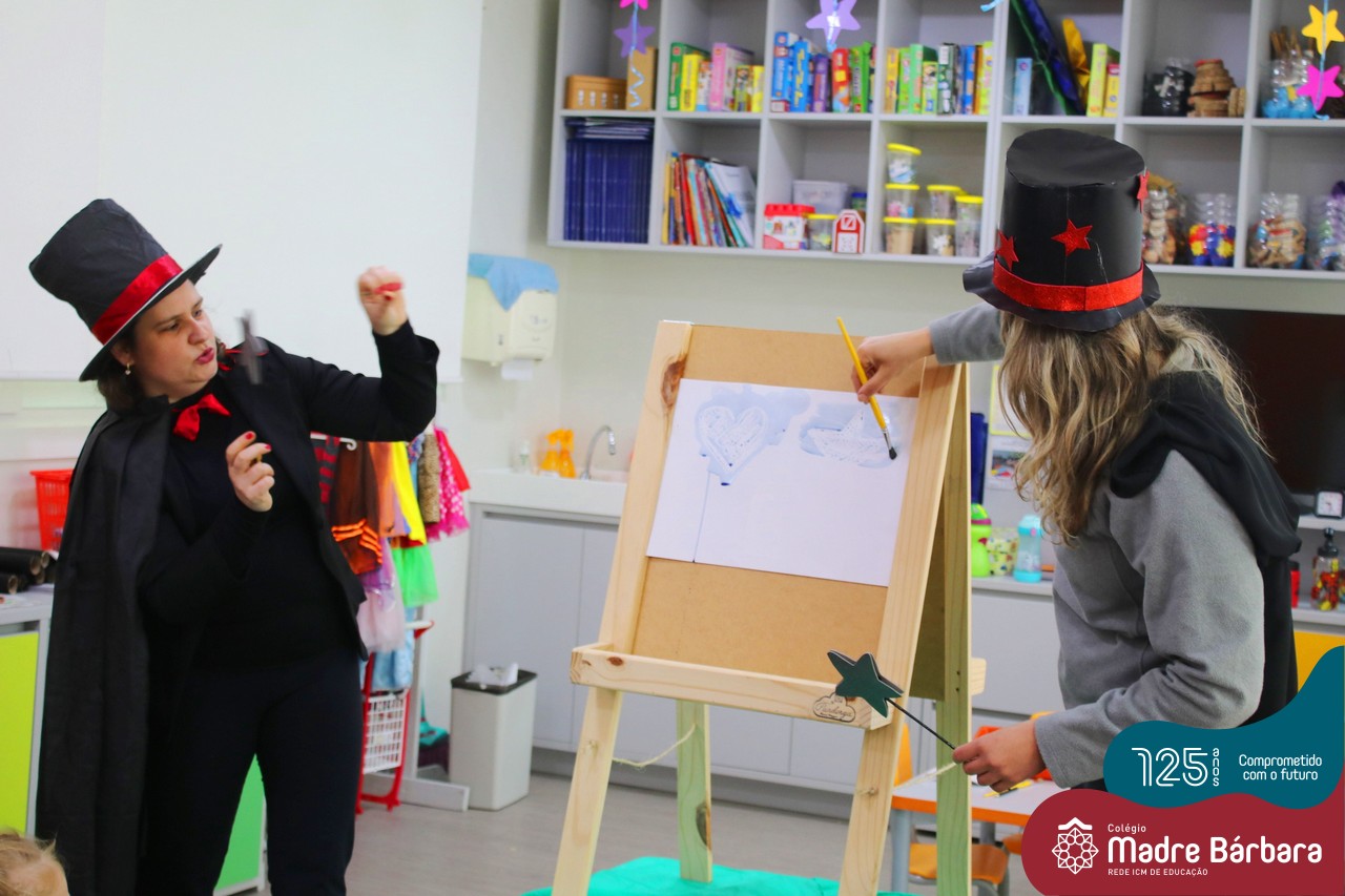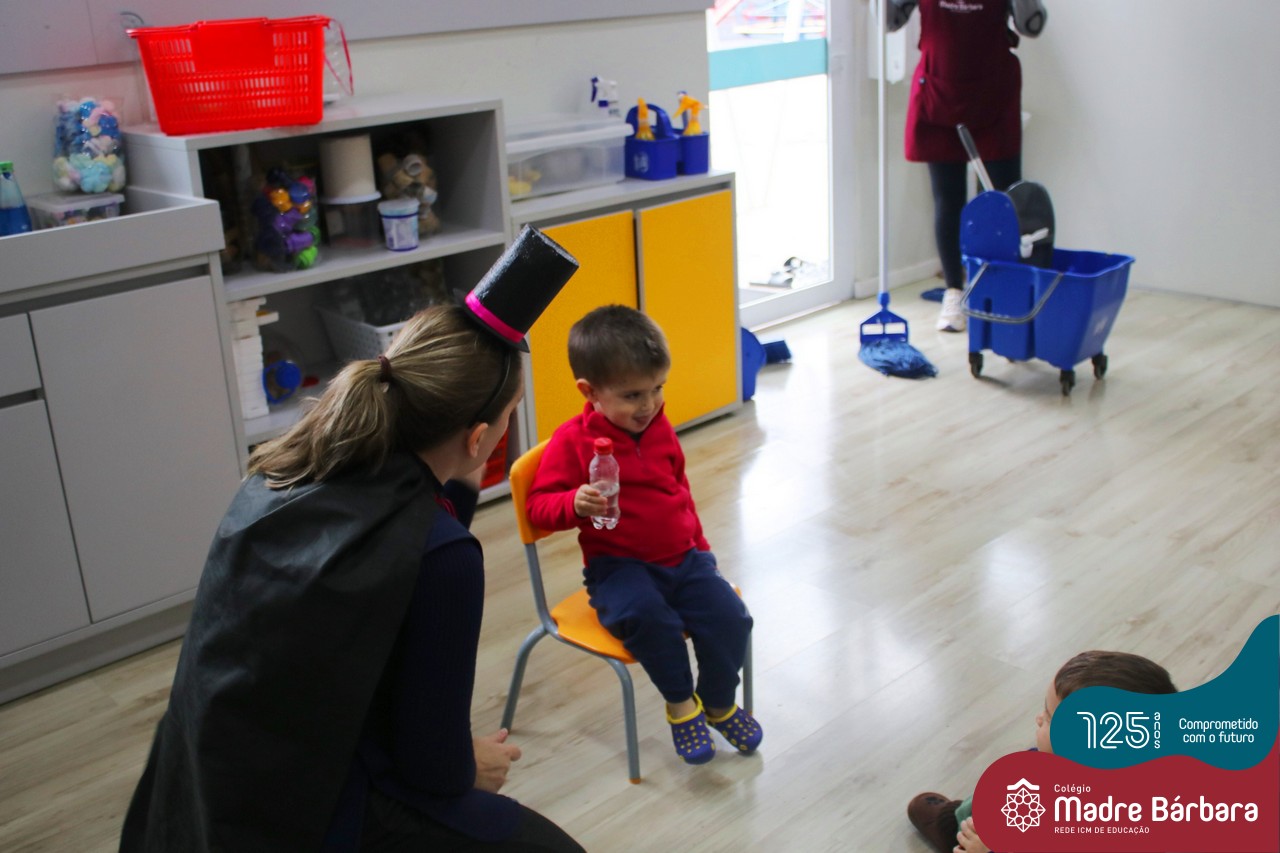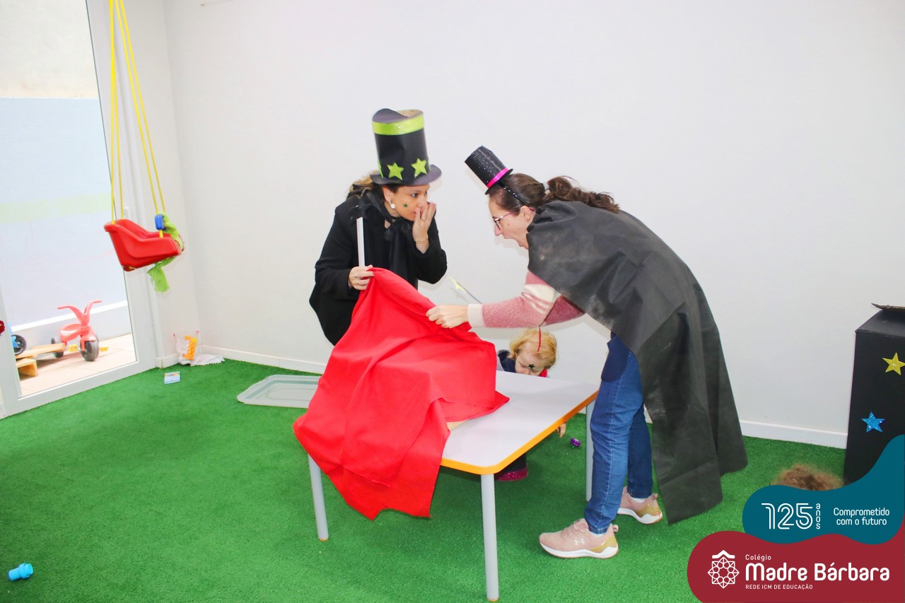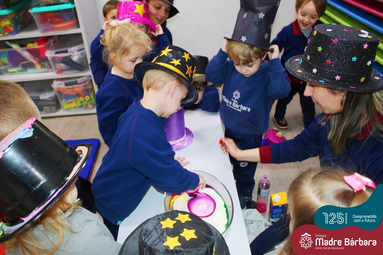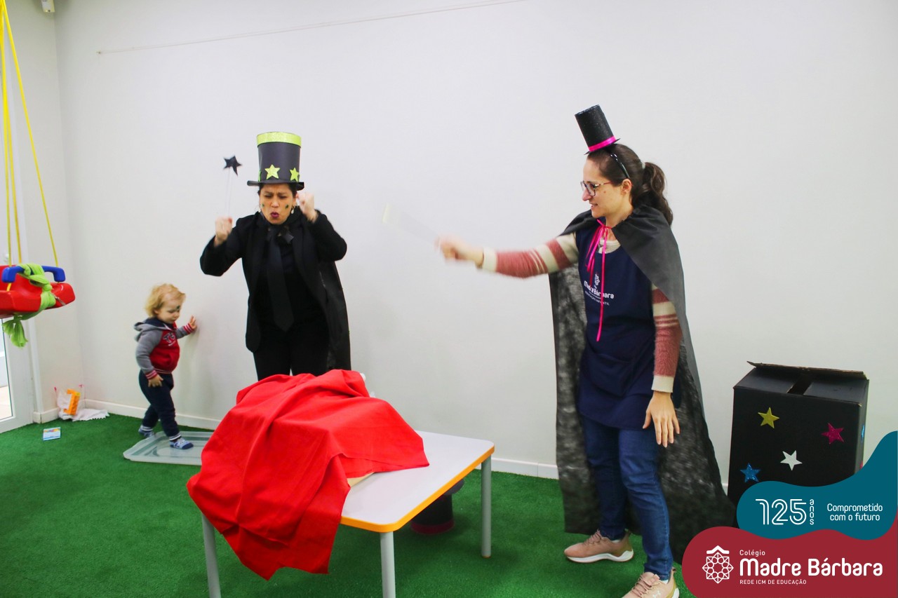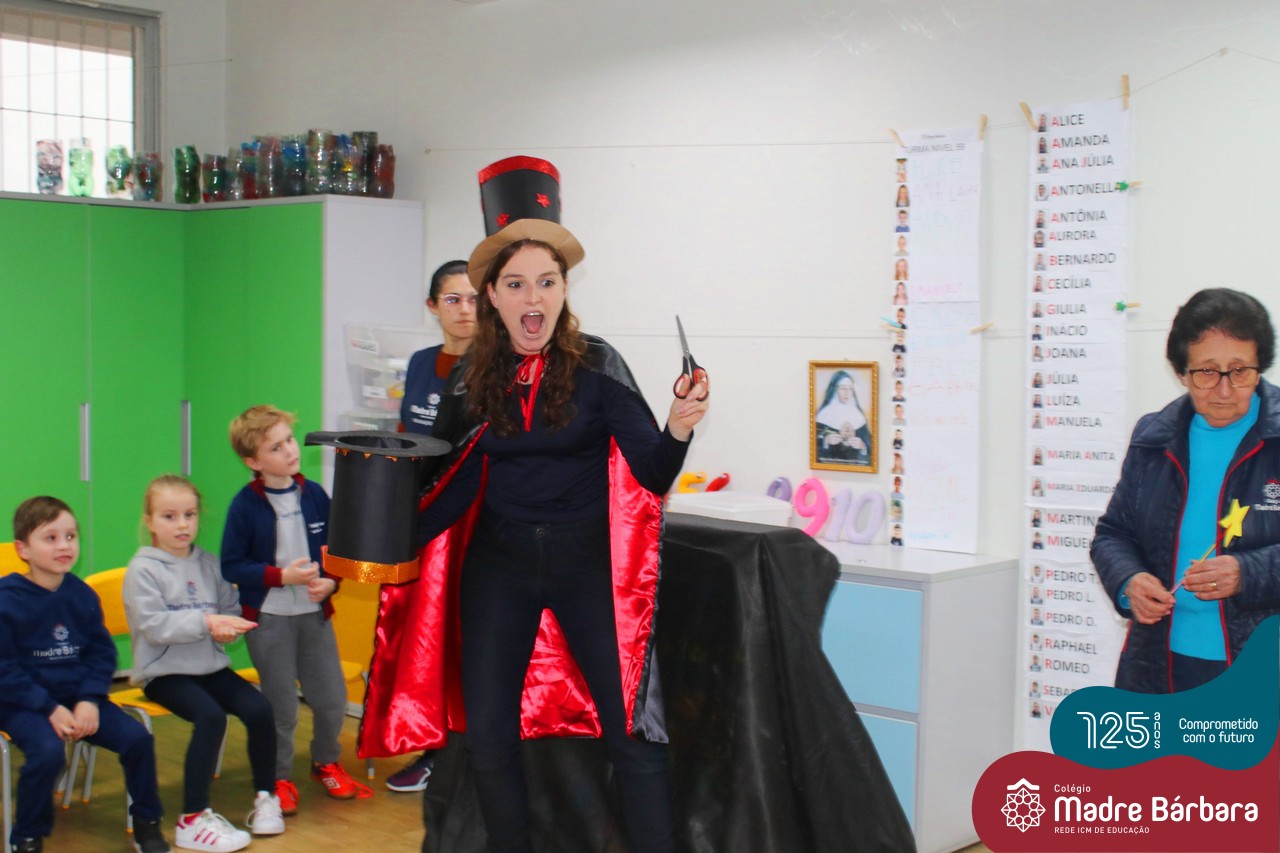 O primeiro dia da Semana da Criança foi marcado por encanto e magia. As crianças foram recebidas em um ambiente especialmente preparado com muita cor, cartolas e estrelas! O dia foi de mágicas que empolgaram as crianças e professoras. Abracadabra…simsalabim!!!