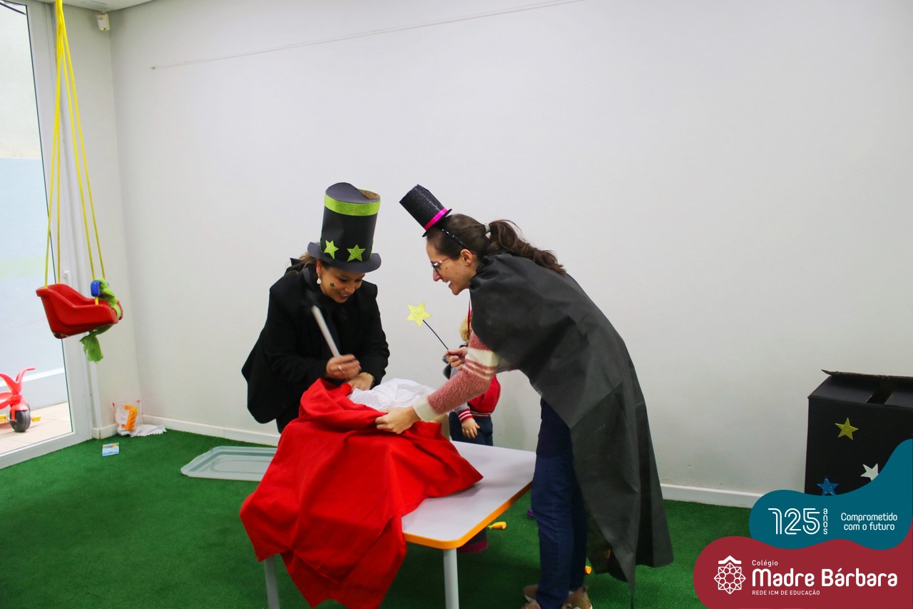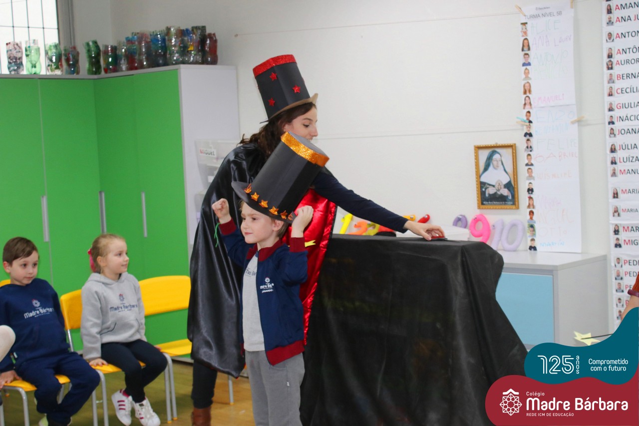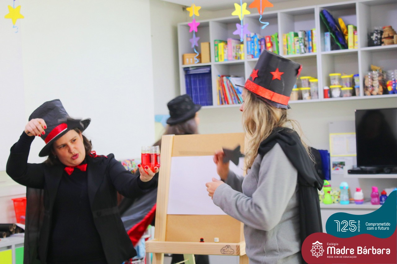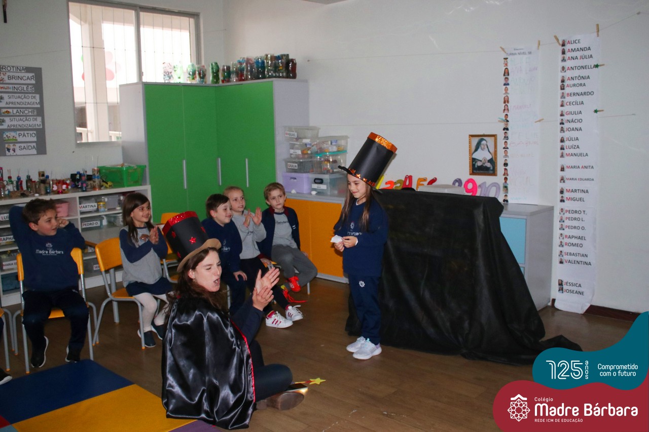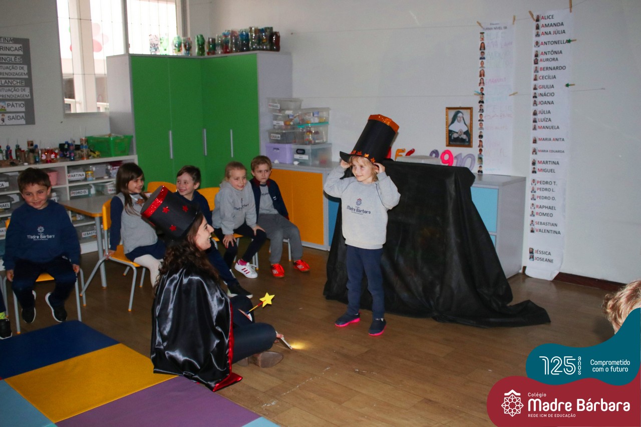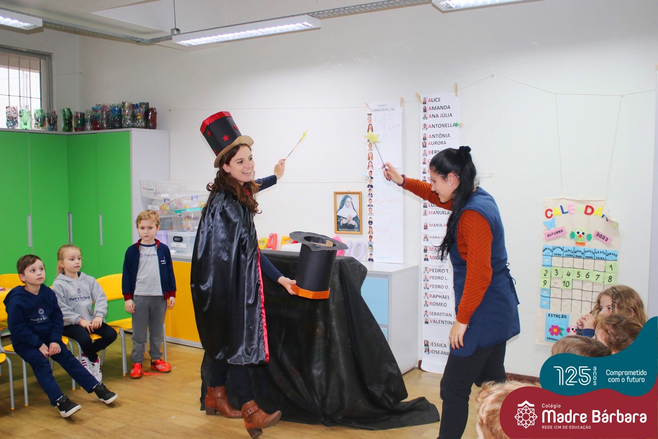 O primeiro dia da Semana da Criança foi marcado por encanto e magia. As crianças foram recebidas em um ambiente especialmente preparado com muita cor, cartolas e estrelas! O dia foi de mágicas que empolgaram as crianças e professoras. Abracadabra…simsalabim!!!