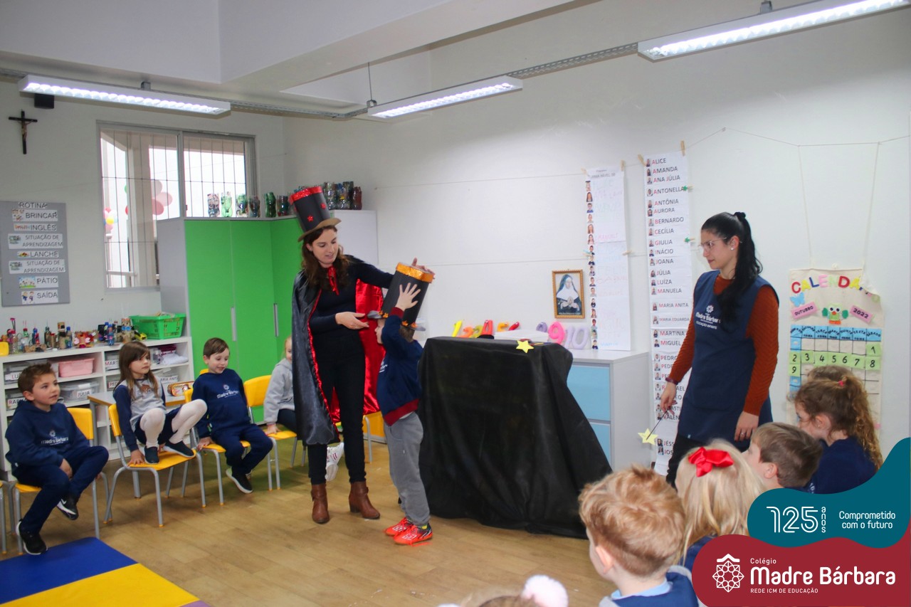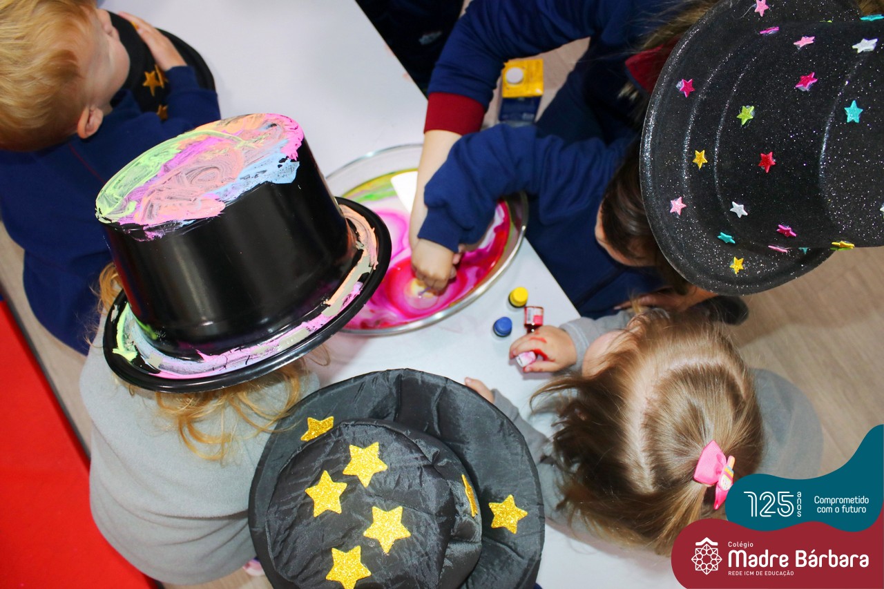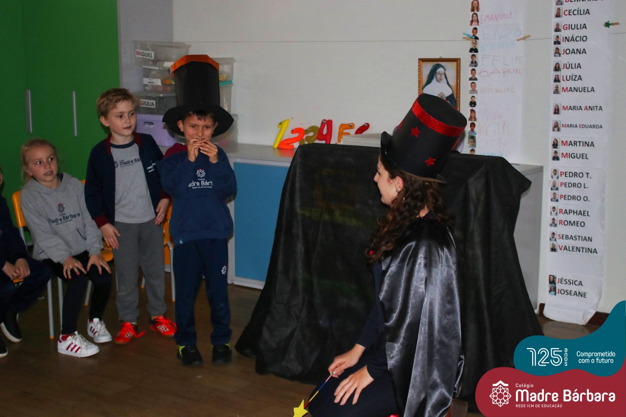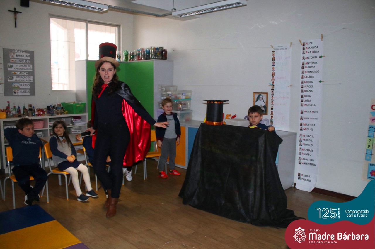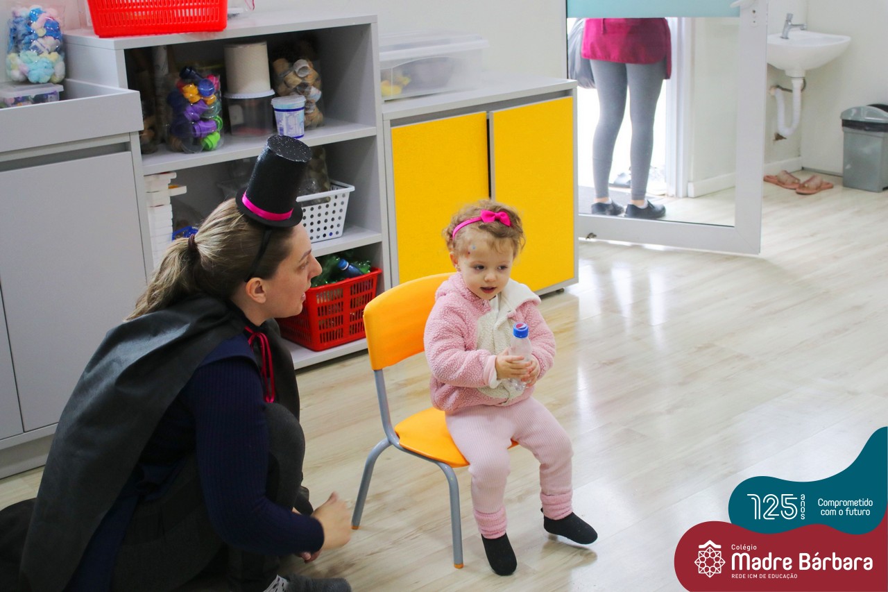 O primeiro dia da Semana da Criança foi marcado por encanto e magia. As crianças foram recebidas em um ambiente especialmente preparado com muita cor, cartolas e estrelas! O dia foi de mágicas que empolgaram as crianças e professoras. Abracadabra…simsalabim!!!