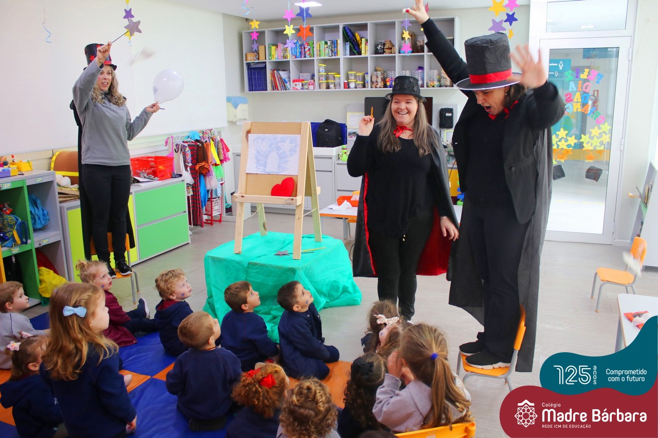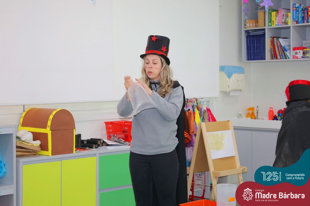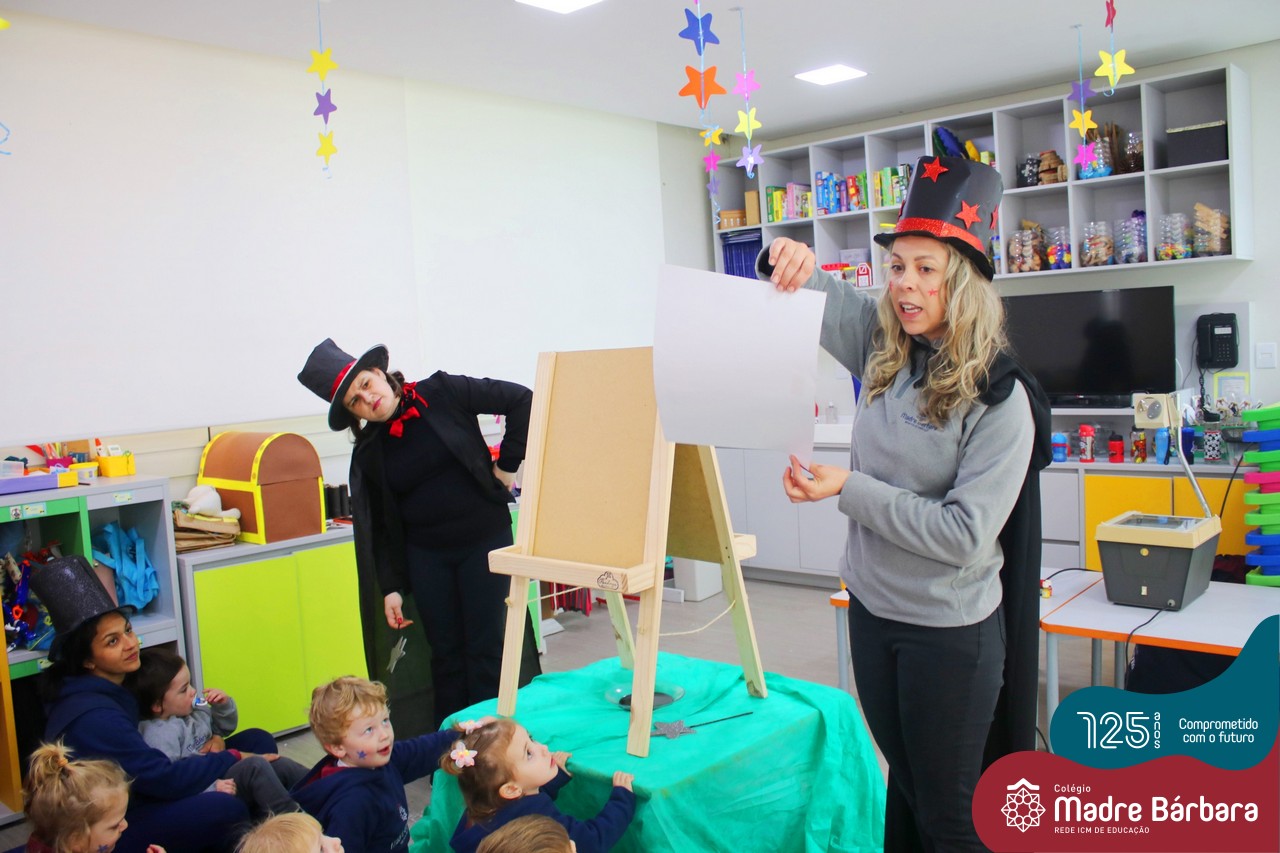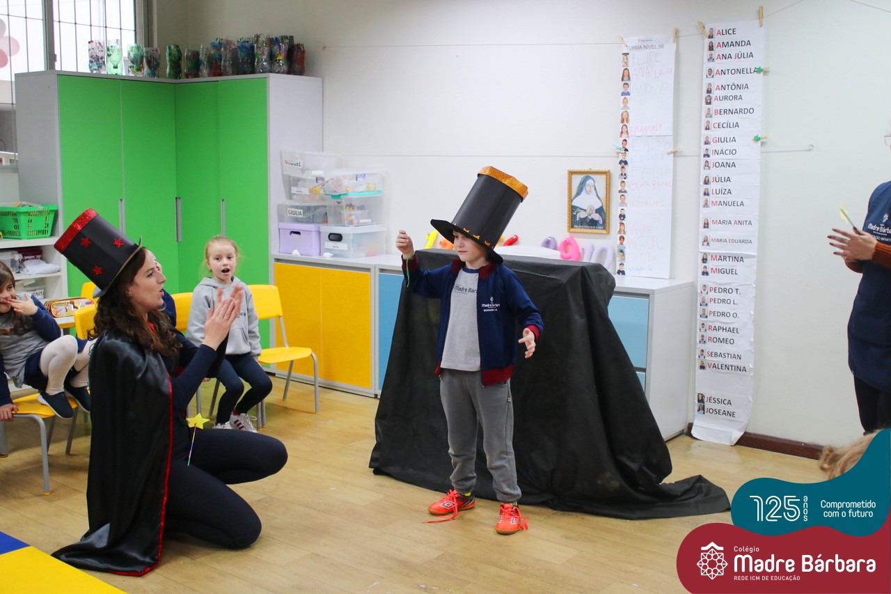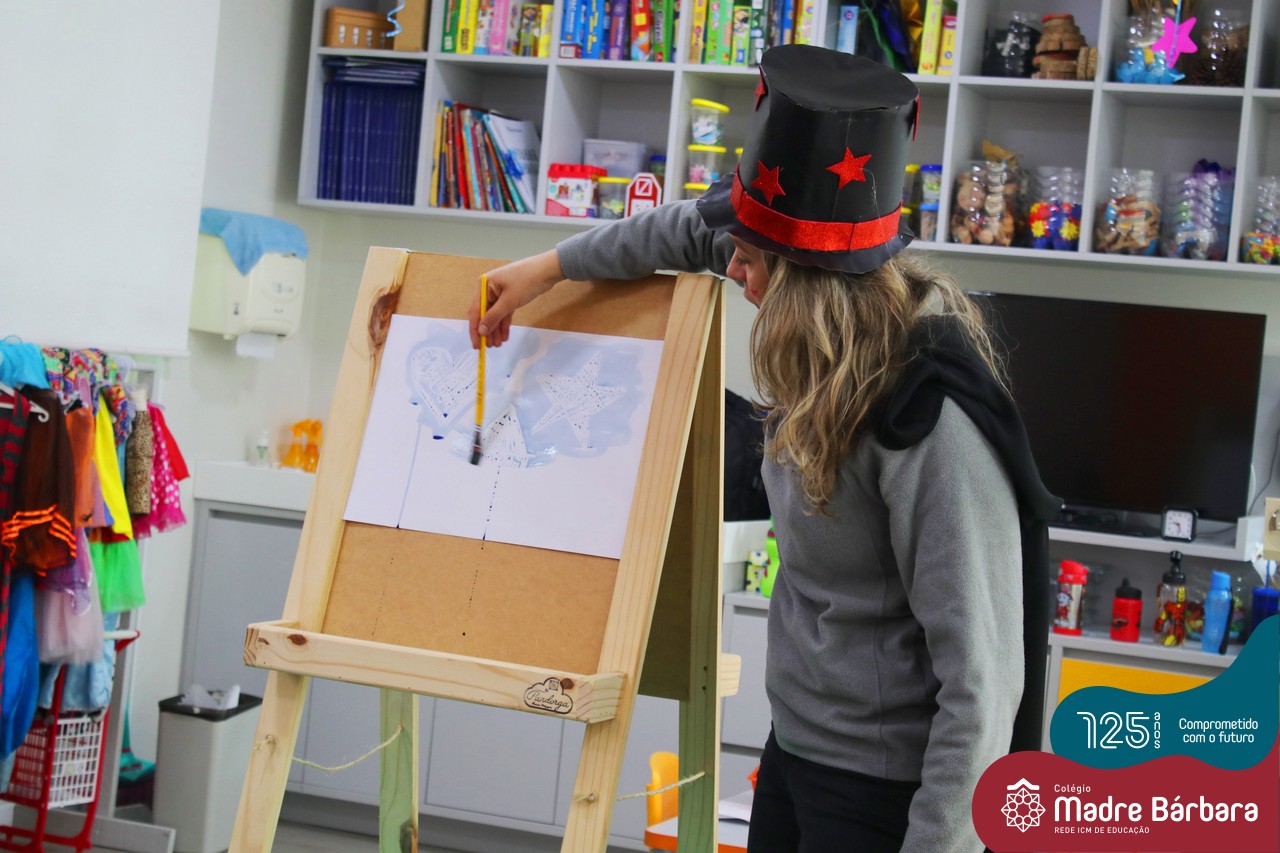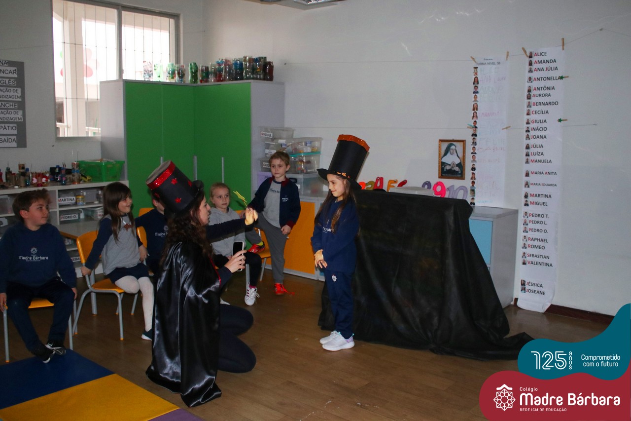 O primeiro dia da Semana da Criança foi marcado por encanto e magia. As crianças foram recebidas em um ambiente especialmente preparado com muita cor, cartolas e estrelas! O dia foi de mágicas que empolgaram as crianças e professoras. Abracadabra…simsalabim!!!