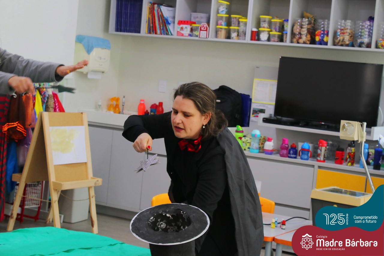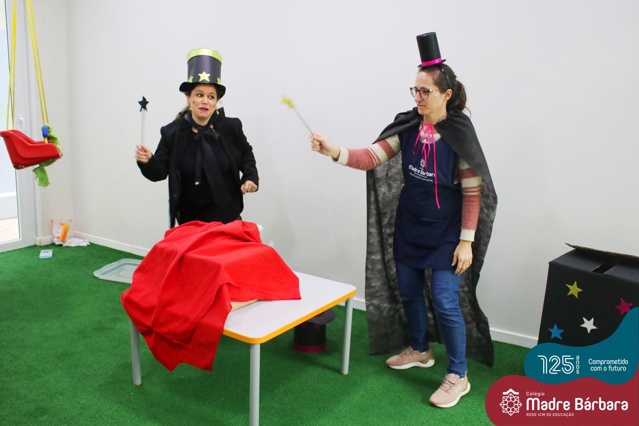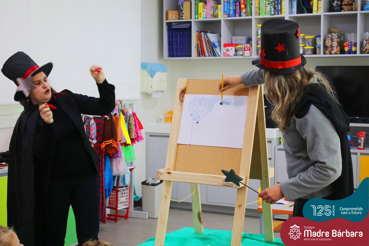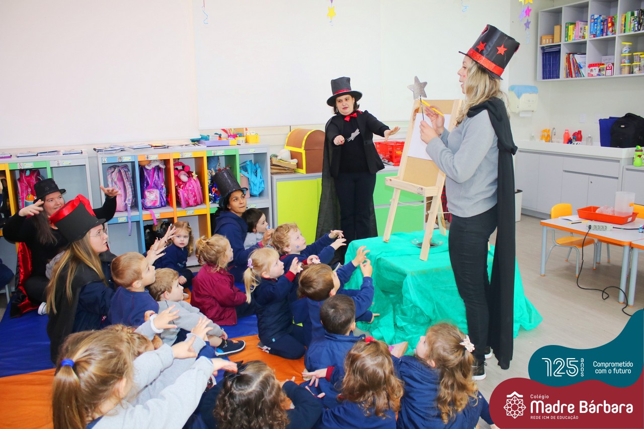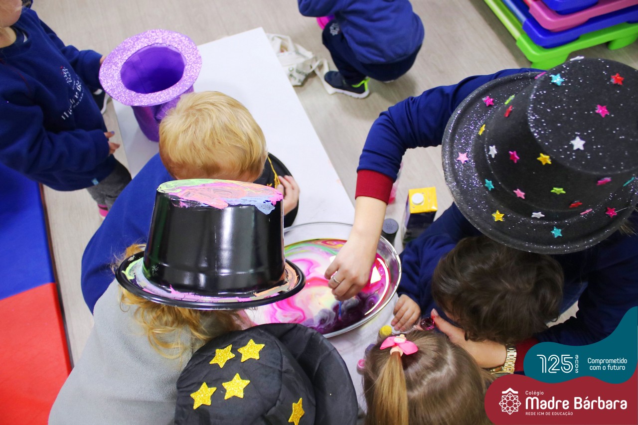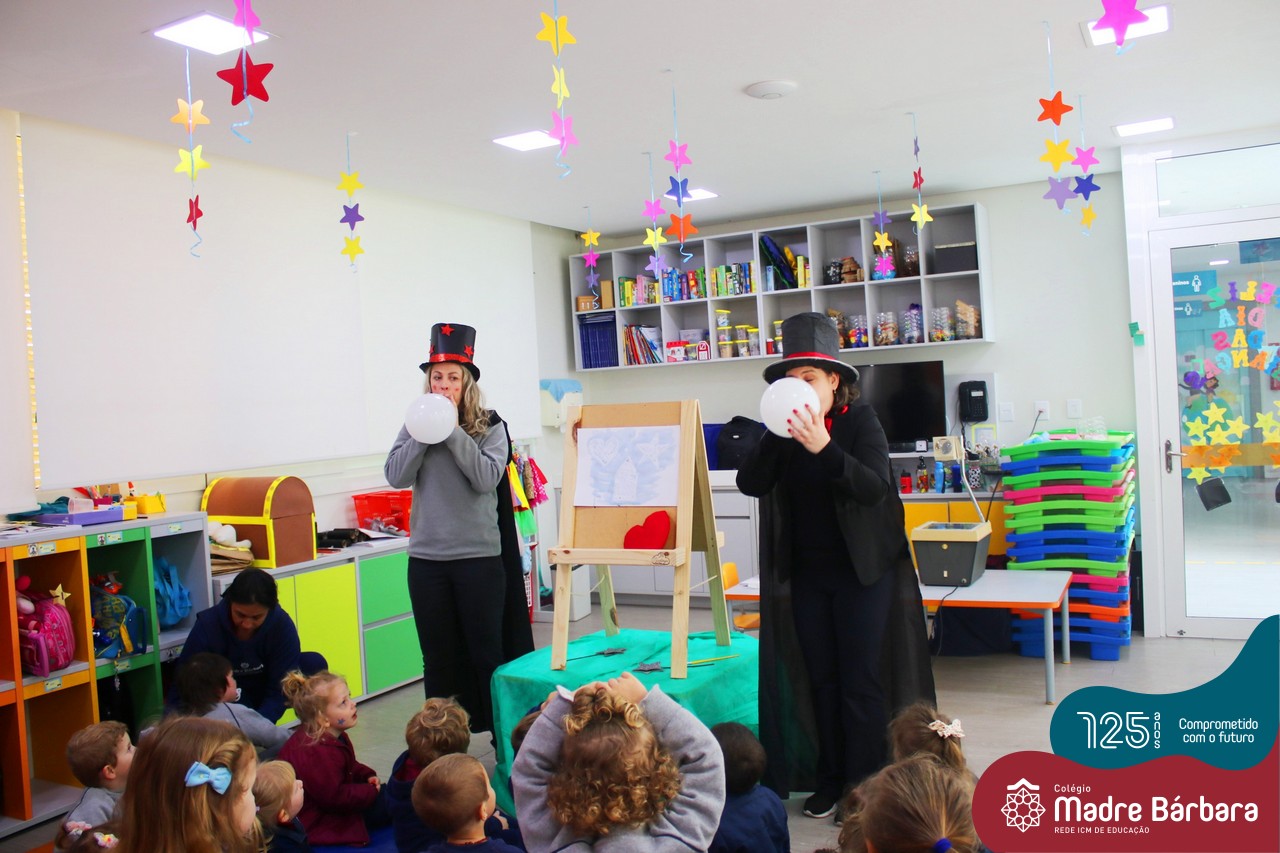 O primeiro dia da Semana da Criança foi marcado por encanto e magia. As crianças foram recebidas em um ambiente especialmente preparado com muita cor, cartolas e estrelas! O dia foi de mágicas que empolgaram as crianças e professoras. Abracadabra…simsalabim!!!