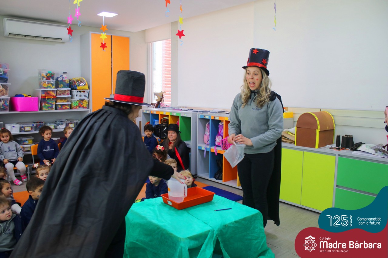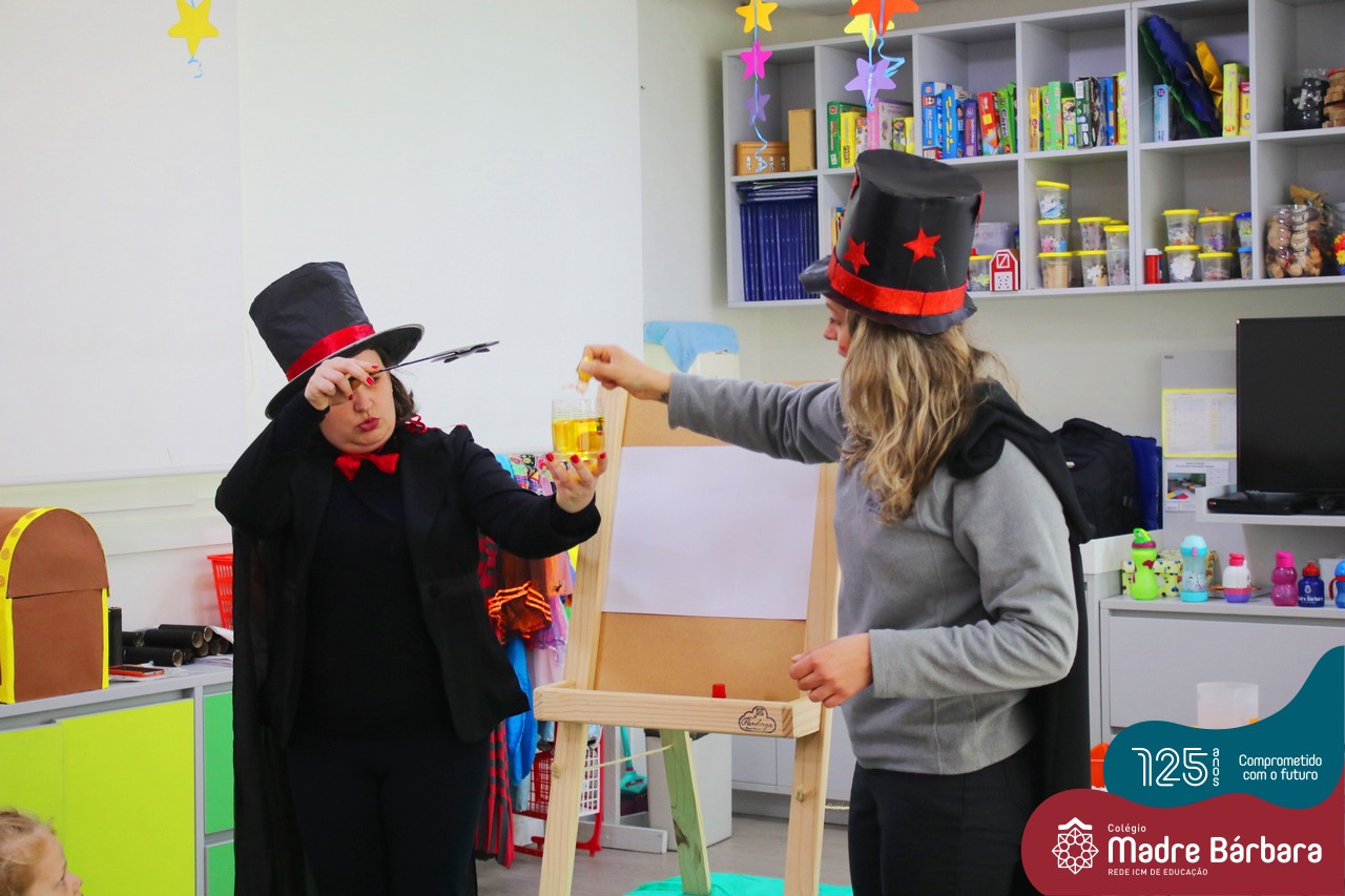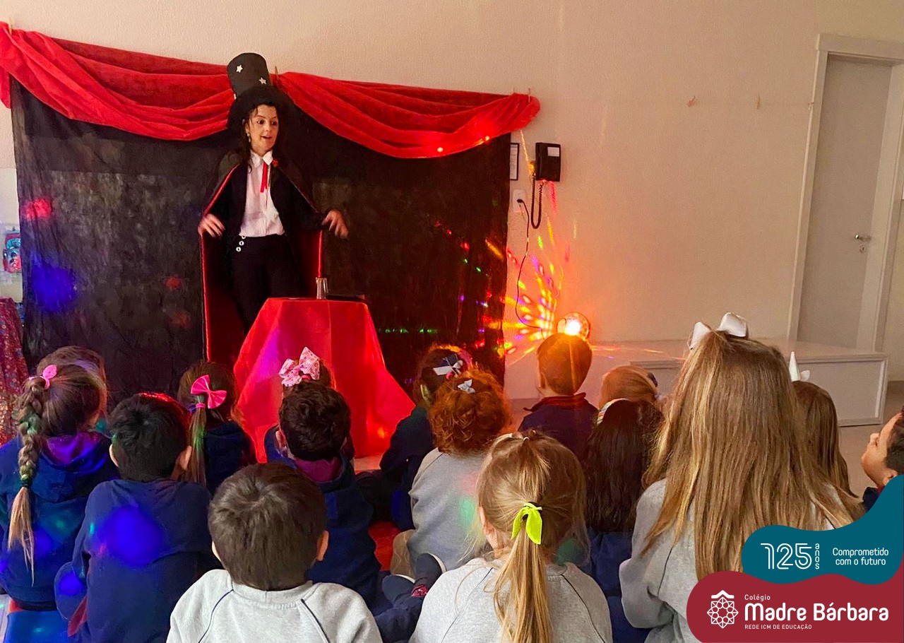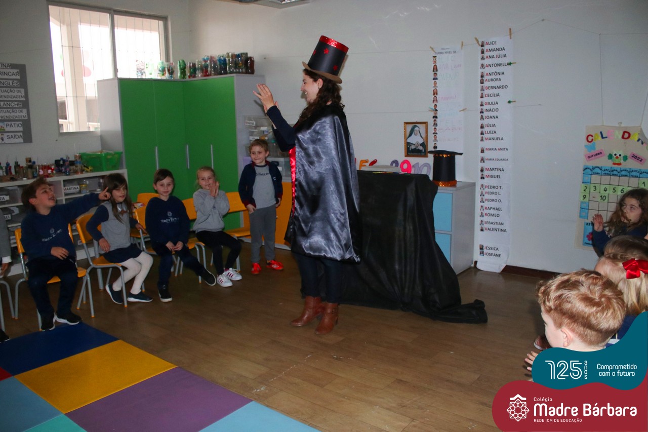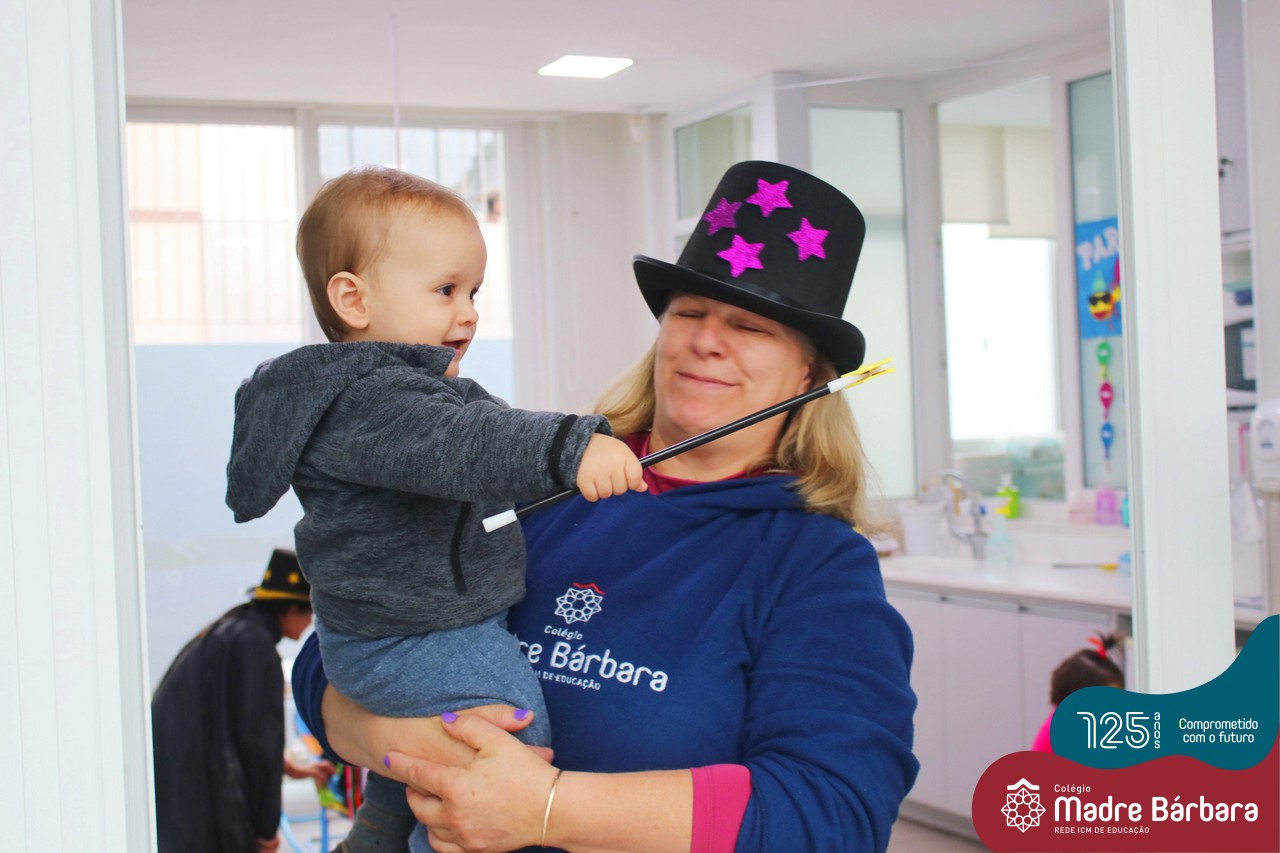 O primeiro dia da Semana da Criança foi marcado por encanto e magia. As crianças foram recebidas em um ambiente especialmente preparado com muita cor, cartolas e estrelas! O dia foi de mágicas que empolgaram as crianças e professoras. Abracadabra…simsalabim!!!