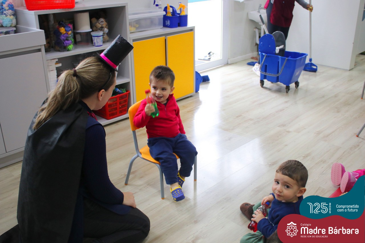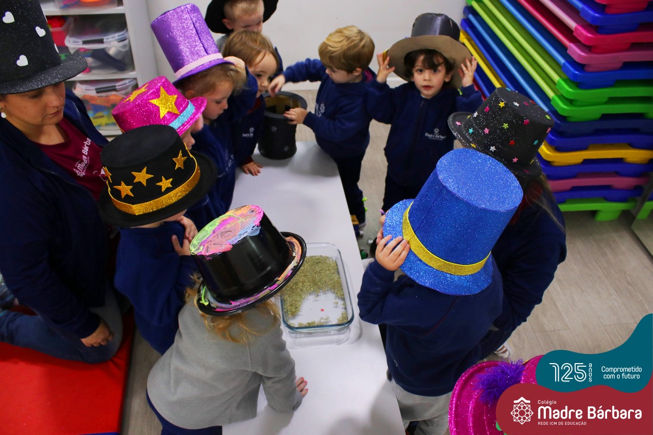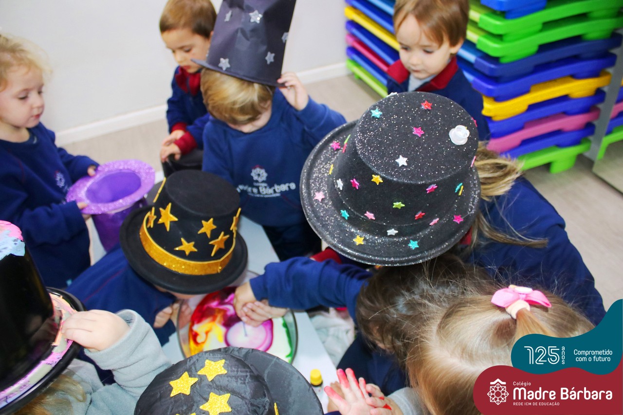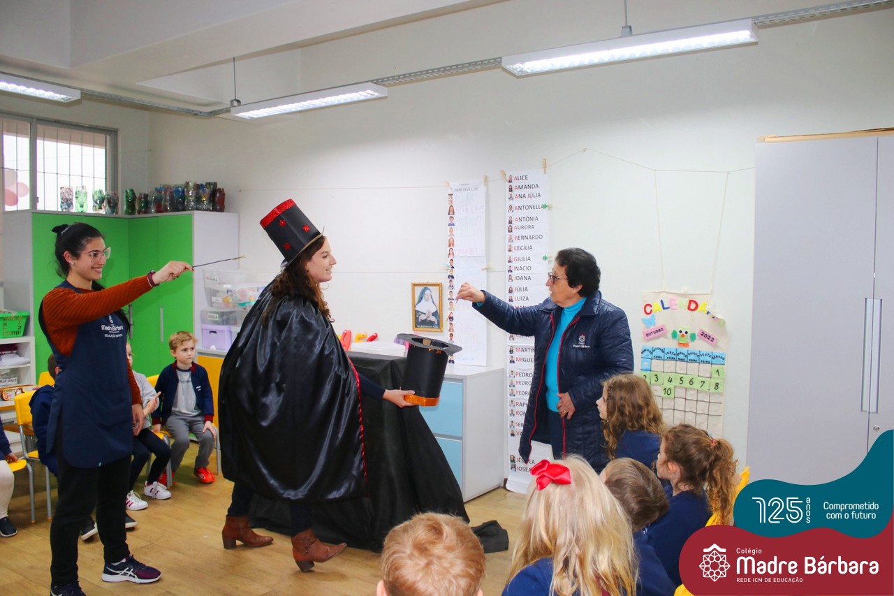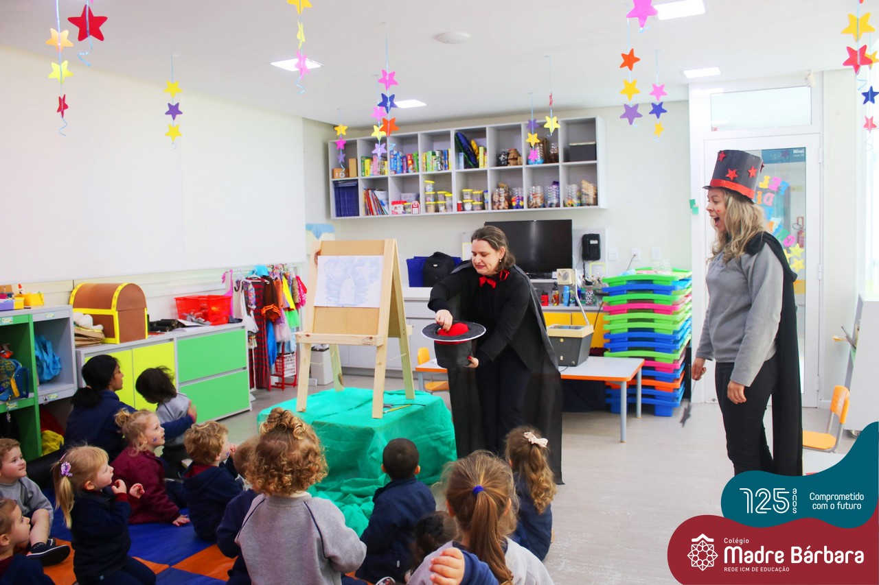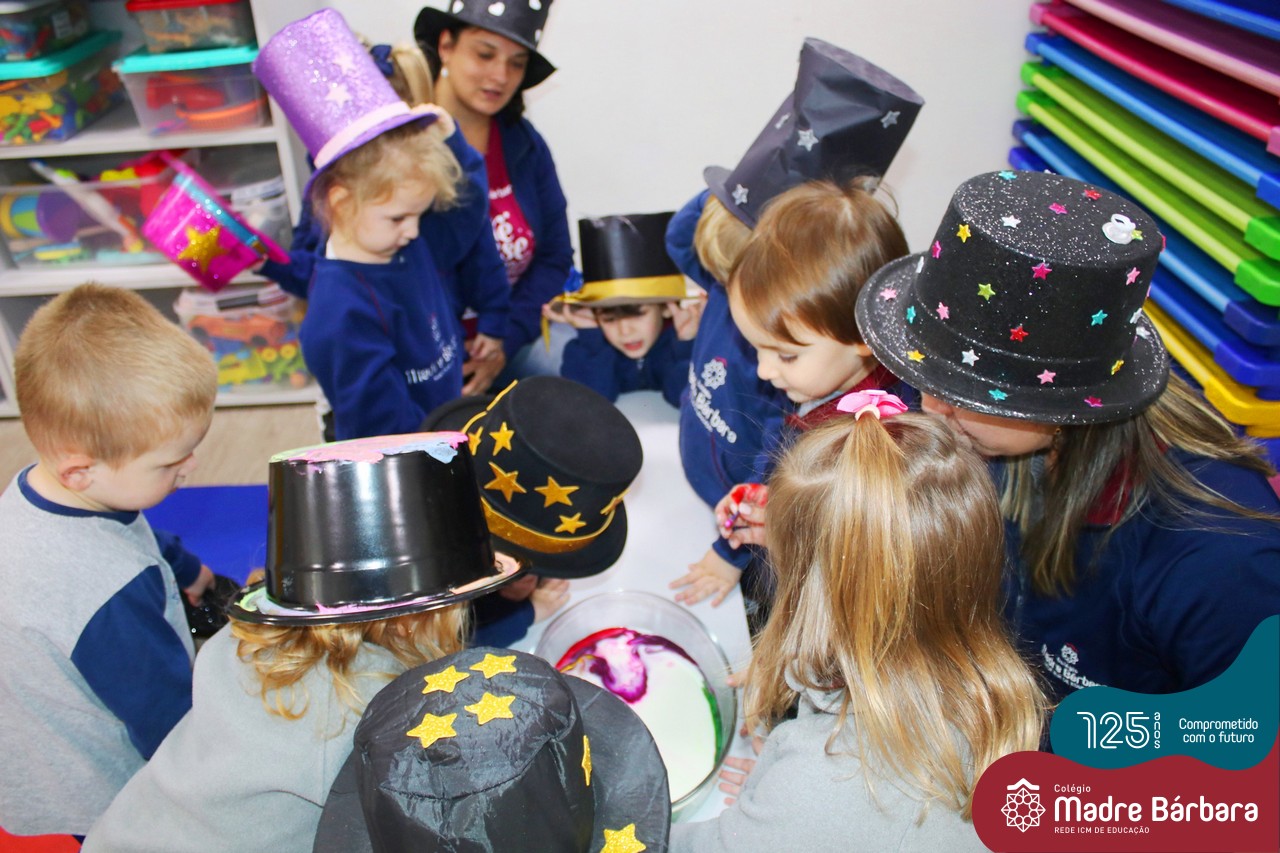 O primeiro dia da Semana da Criança foi marcado por encanto e magia. As crianças foram recebidas em um ambiente especialmente preparado com muita cor, cartolas e estrelas! O dia foi de mágicas que empolgaram as crianças e professoras. Abracadabra…simsalabim!!!