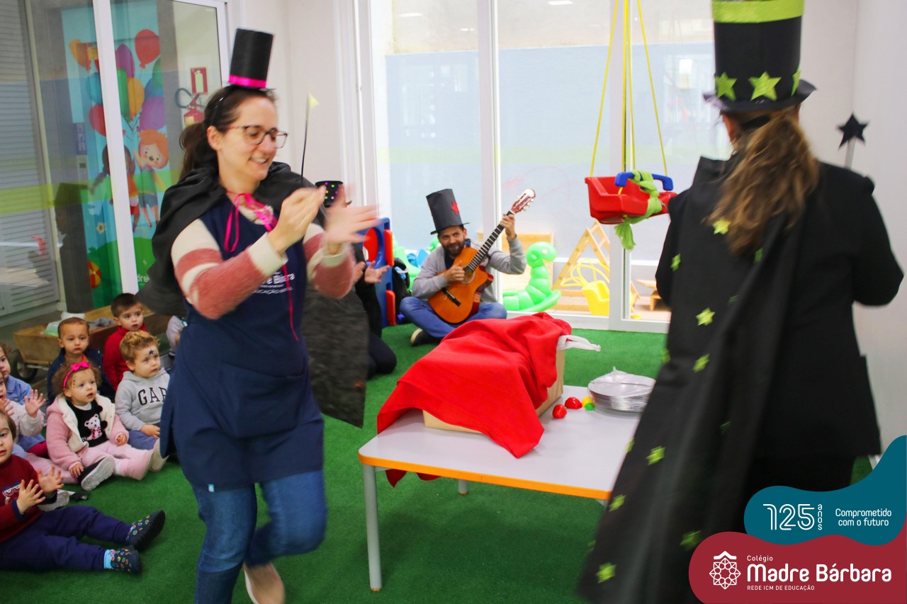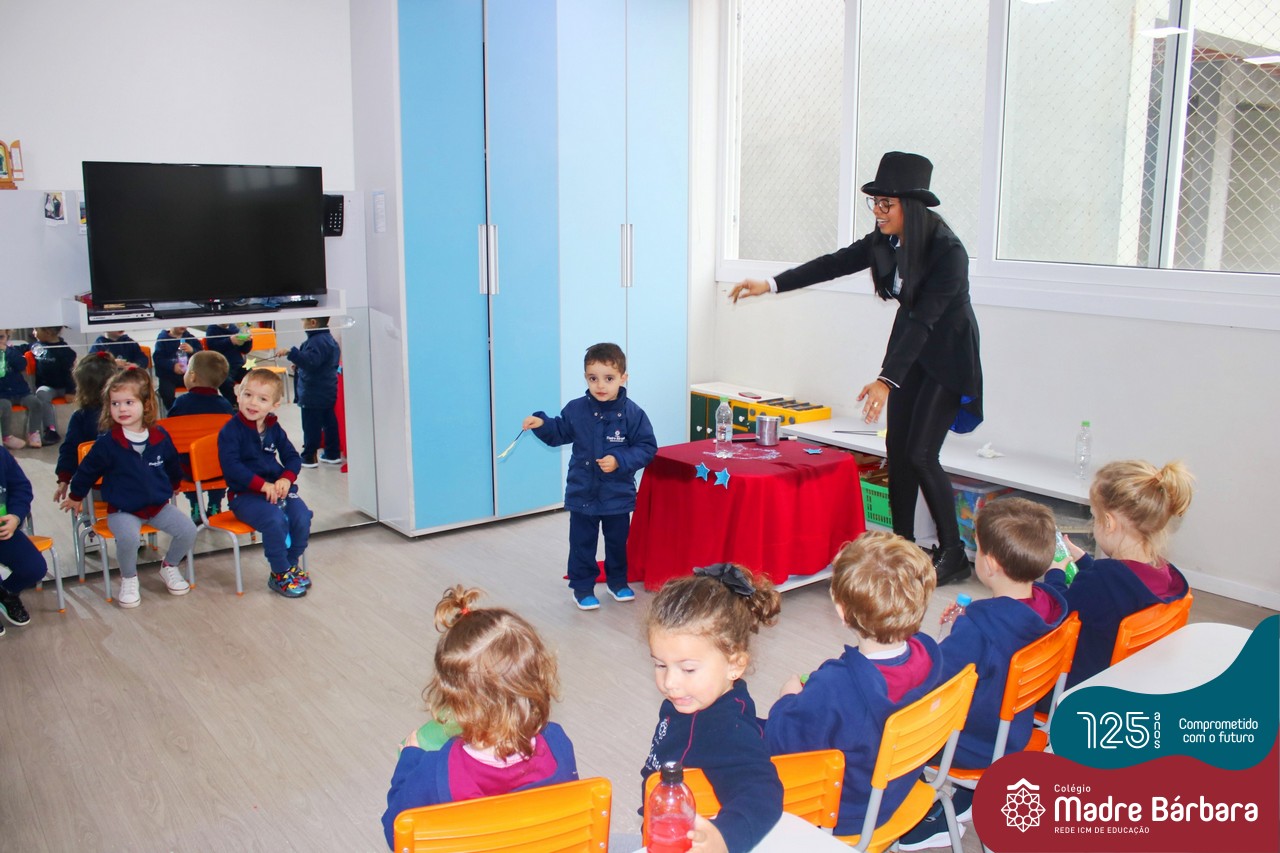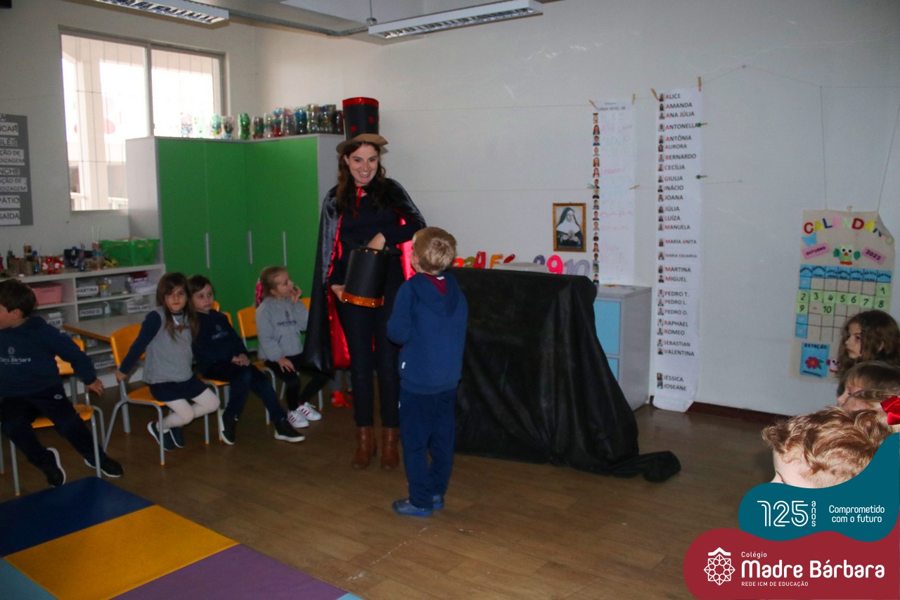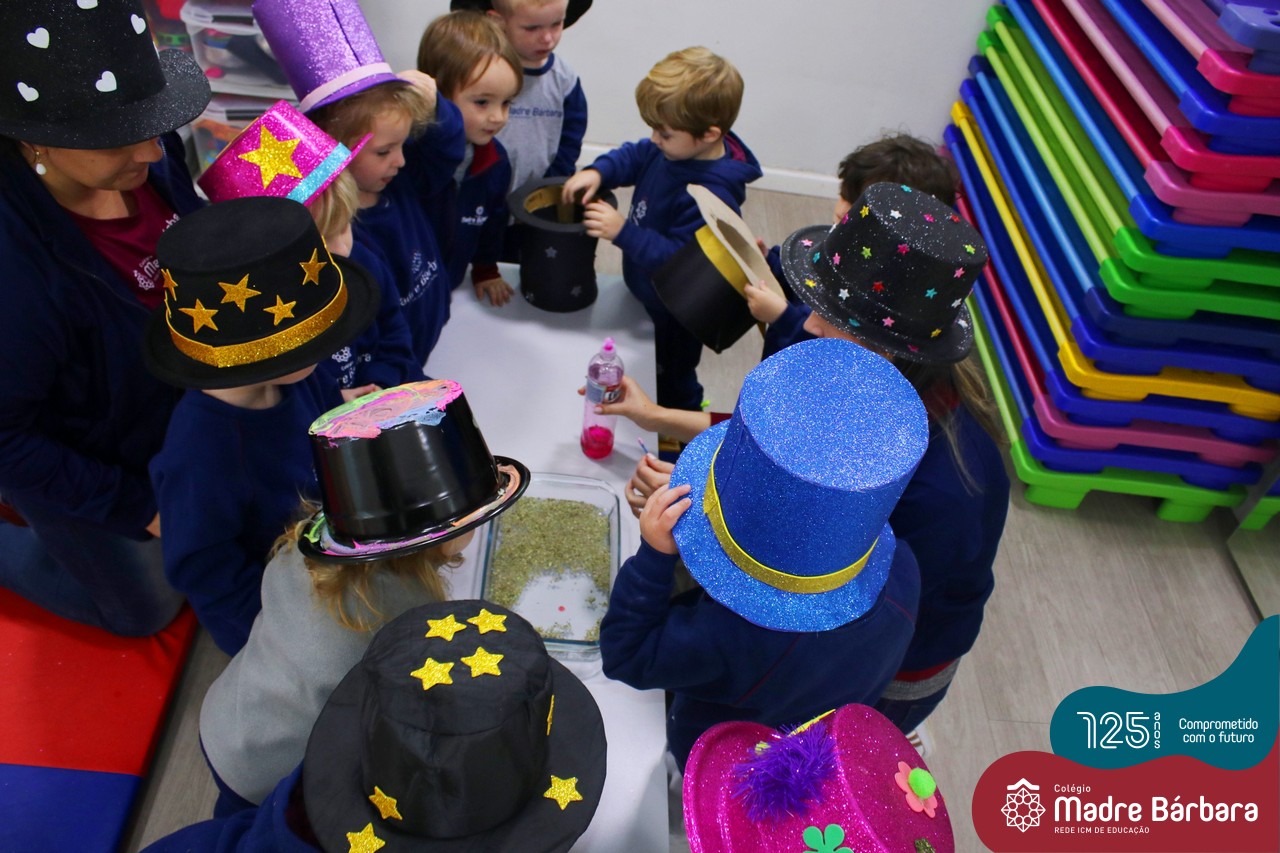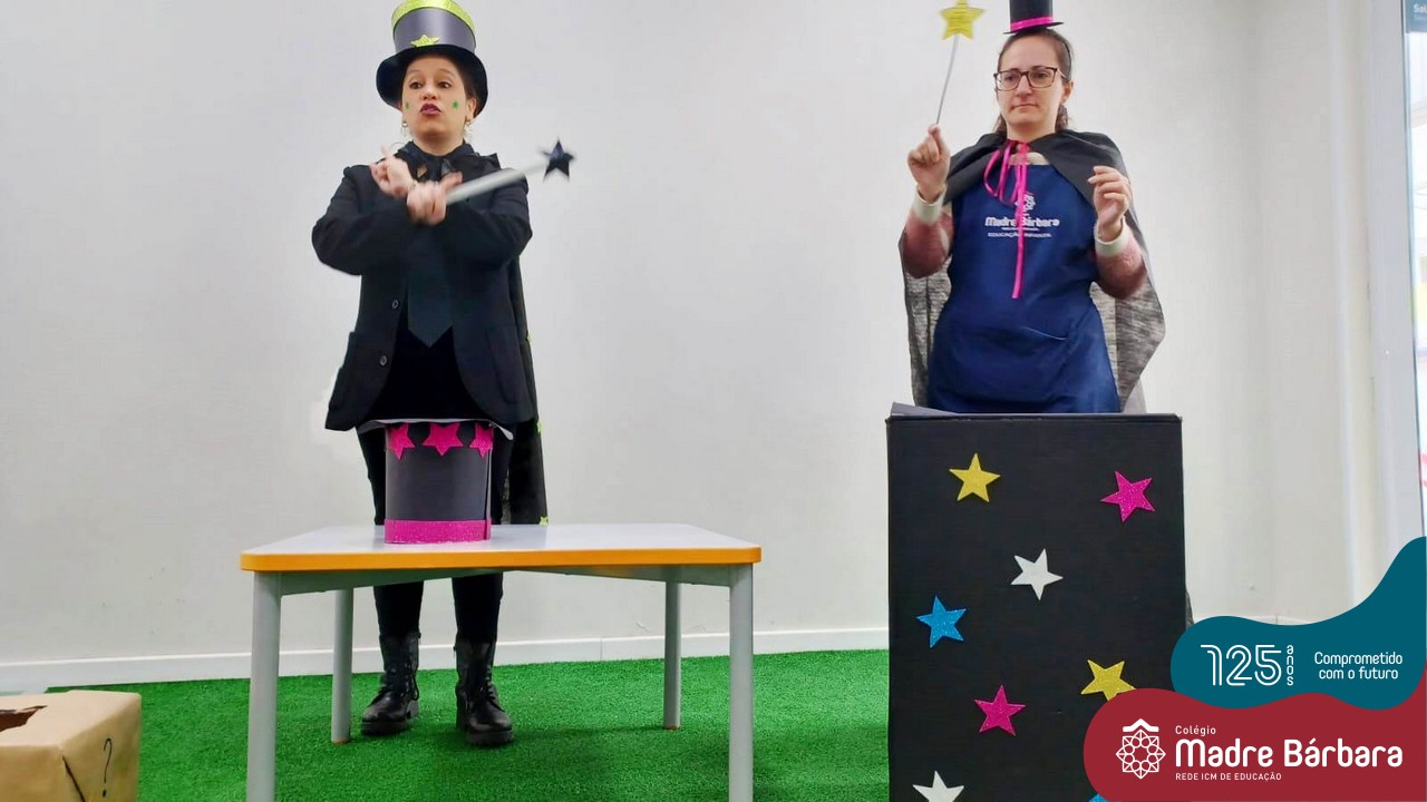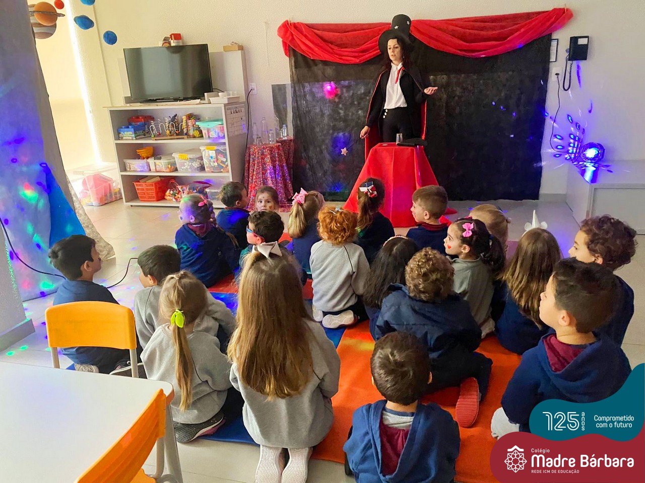 O primeiro dia da Semana da Criança foi marcado por encanto e magia. As crianças foram recebidas em um ambiente especialmente preparado com muita cor, cartolas e estrelas! O dia foi de mágicas que empolgaram as crianças e professoras. Abracadabra…simsalabim!!!