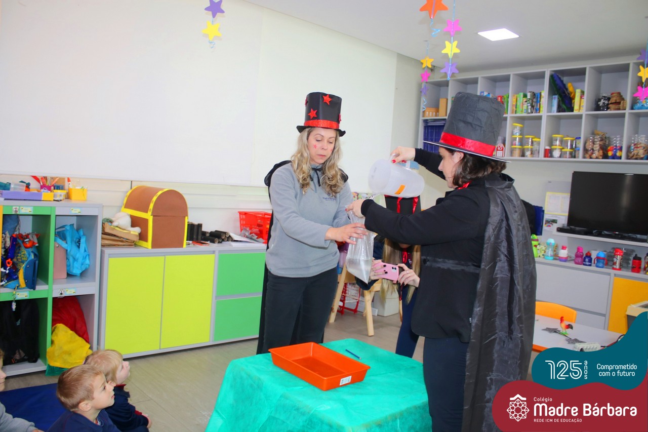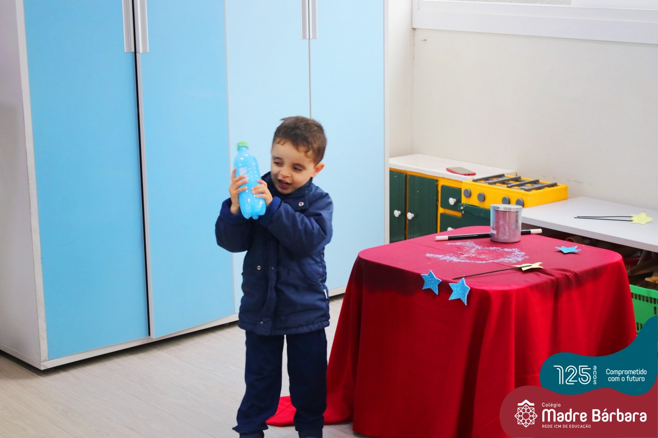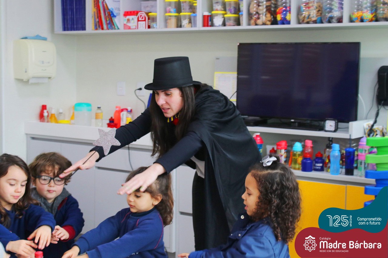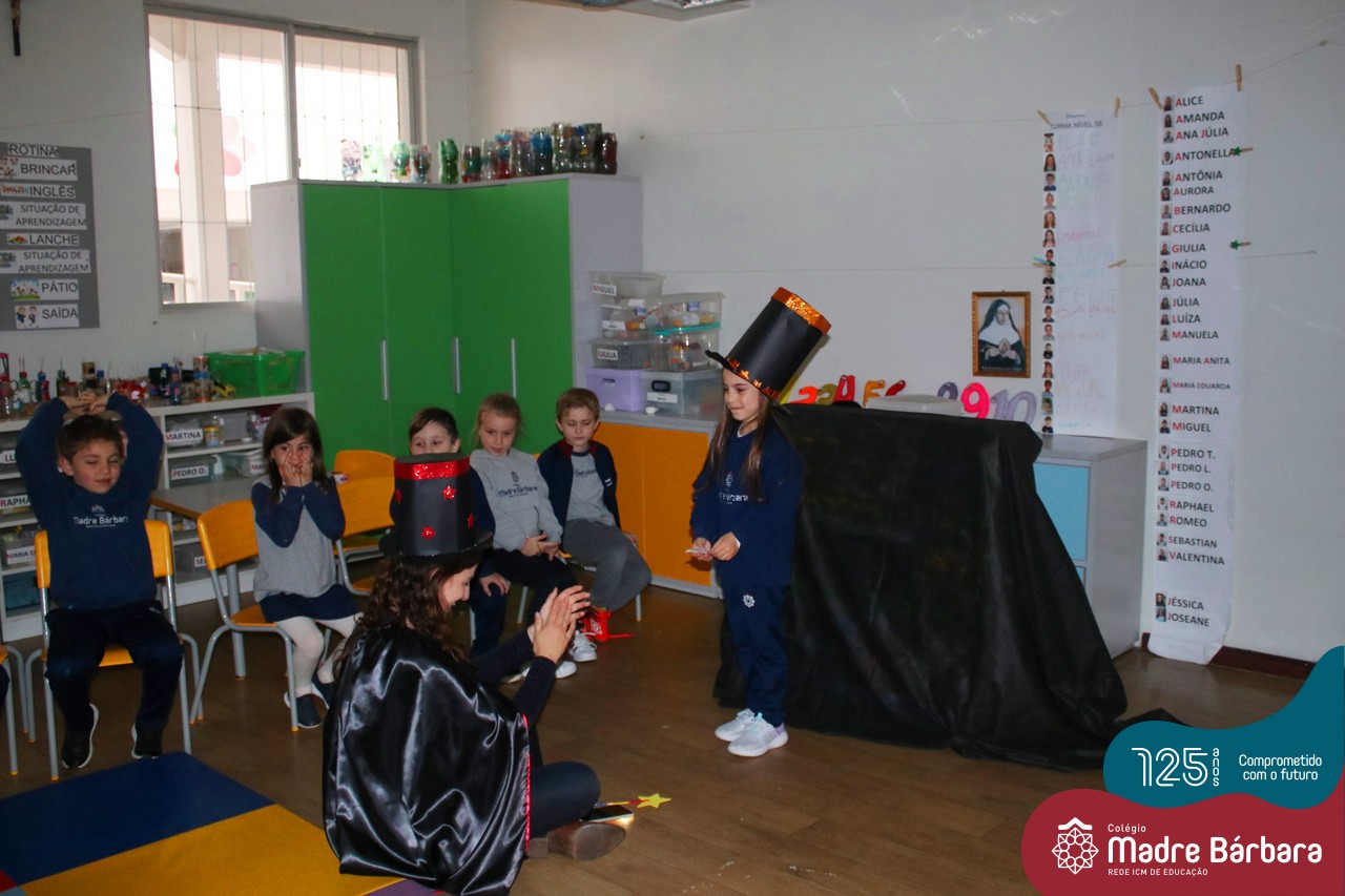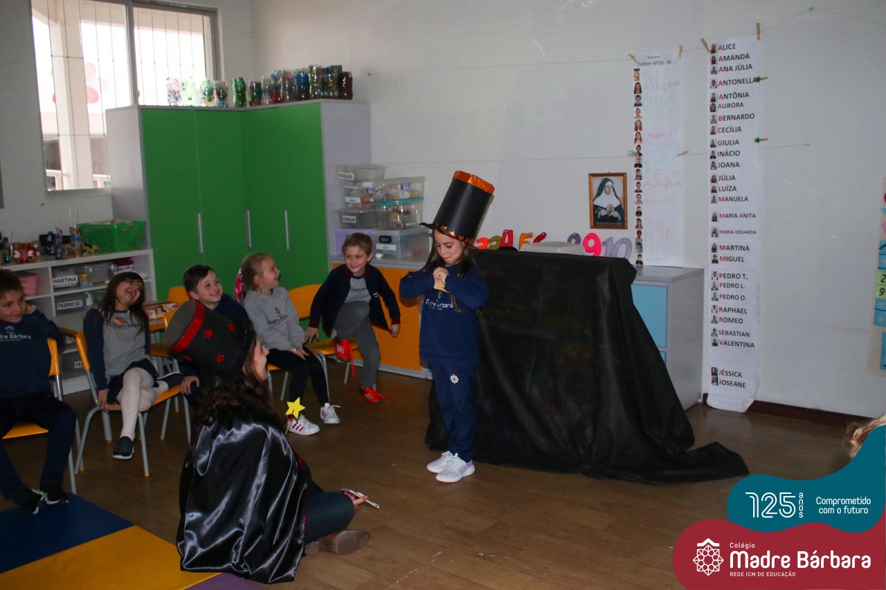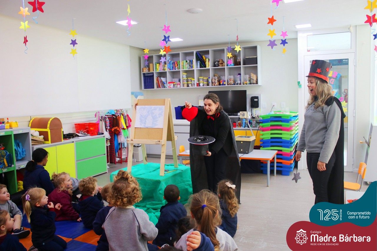 O primeiro dia da Semana da Criança foi marcado por encanto e magia. As crianças foram recebidas em um ambiente especialmente preparado com muita cor, cartolas e estrelas! O dia foi de mágicas que empolgaram as crianças e professoras. Abracadabra…simsalabim!!!
