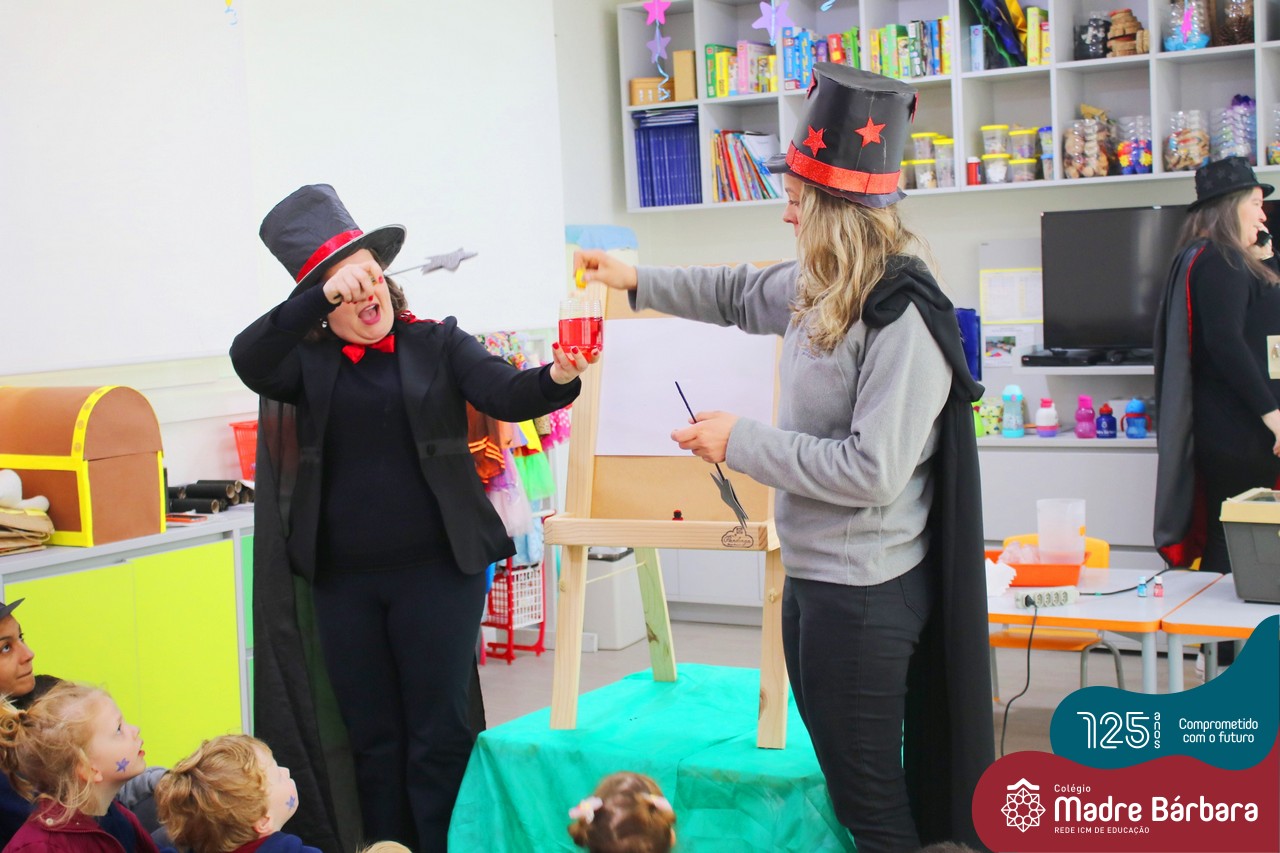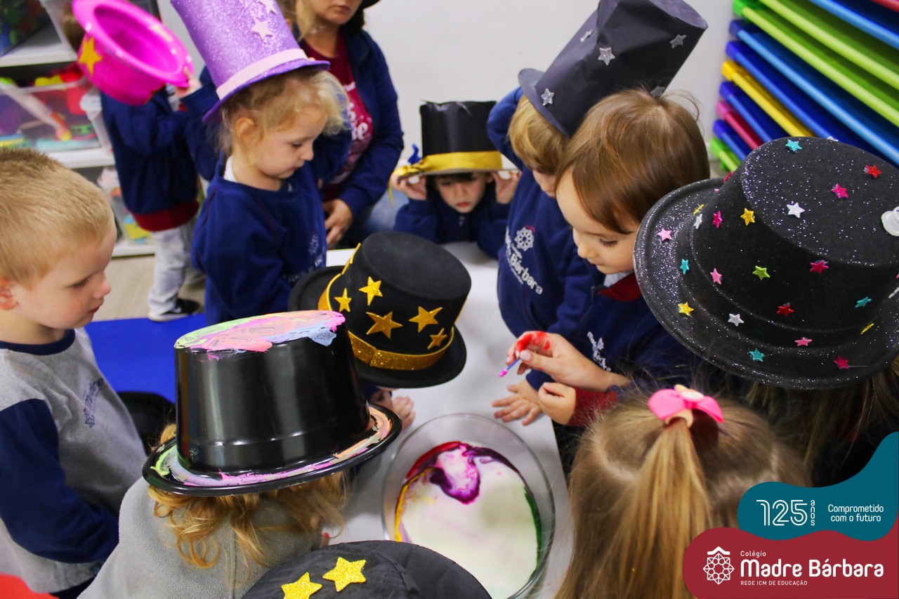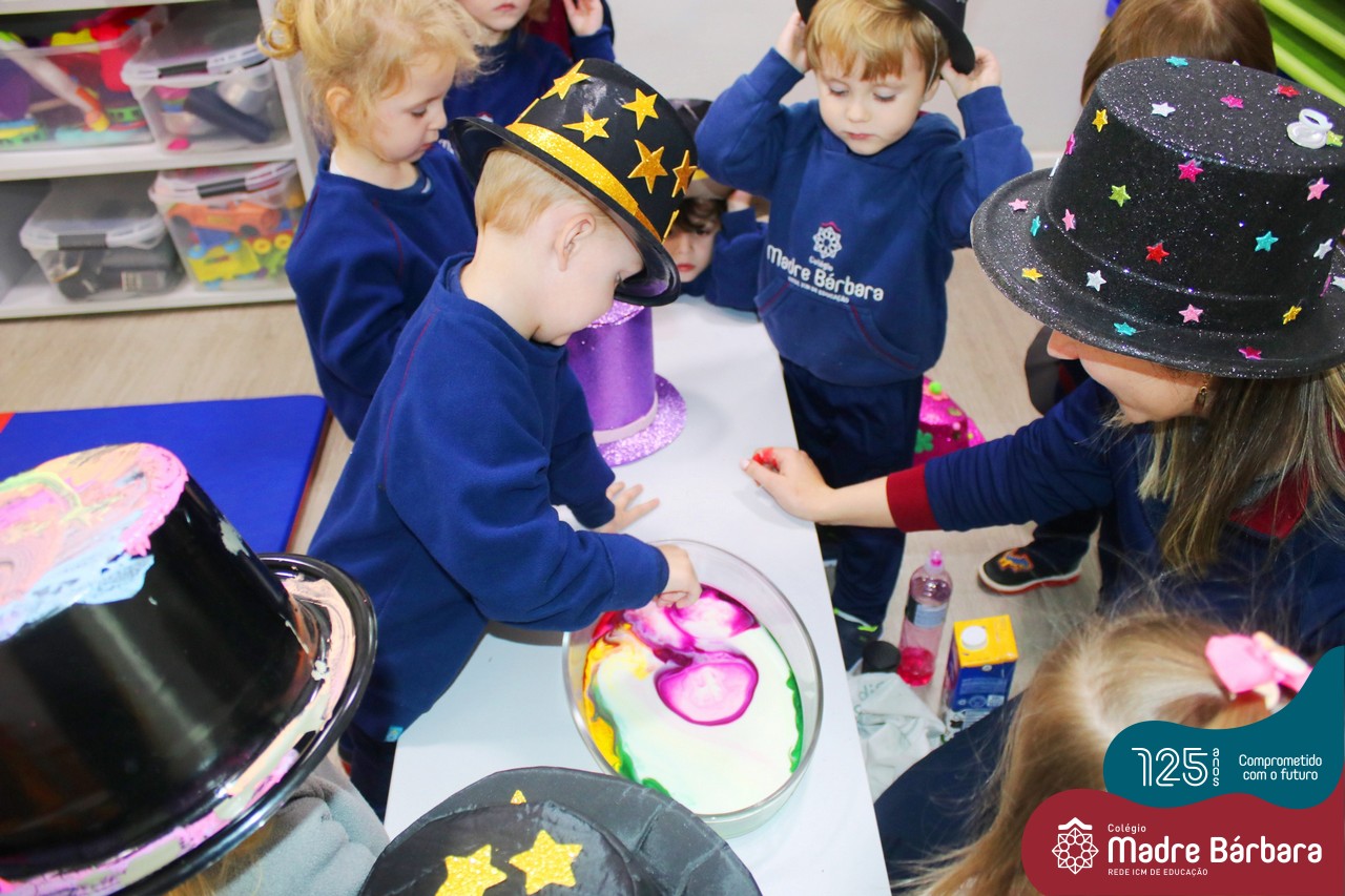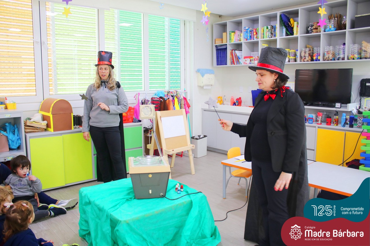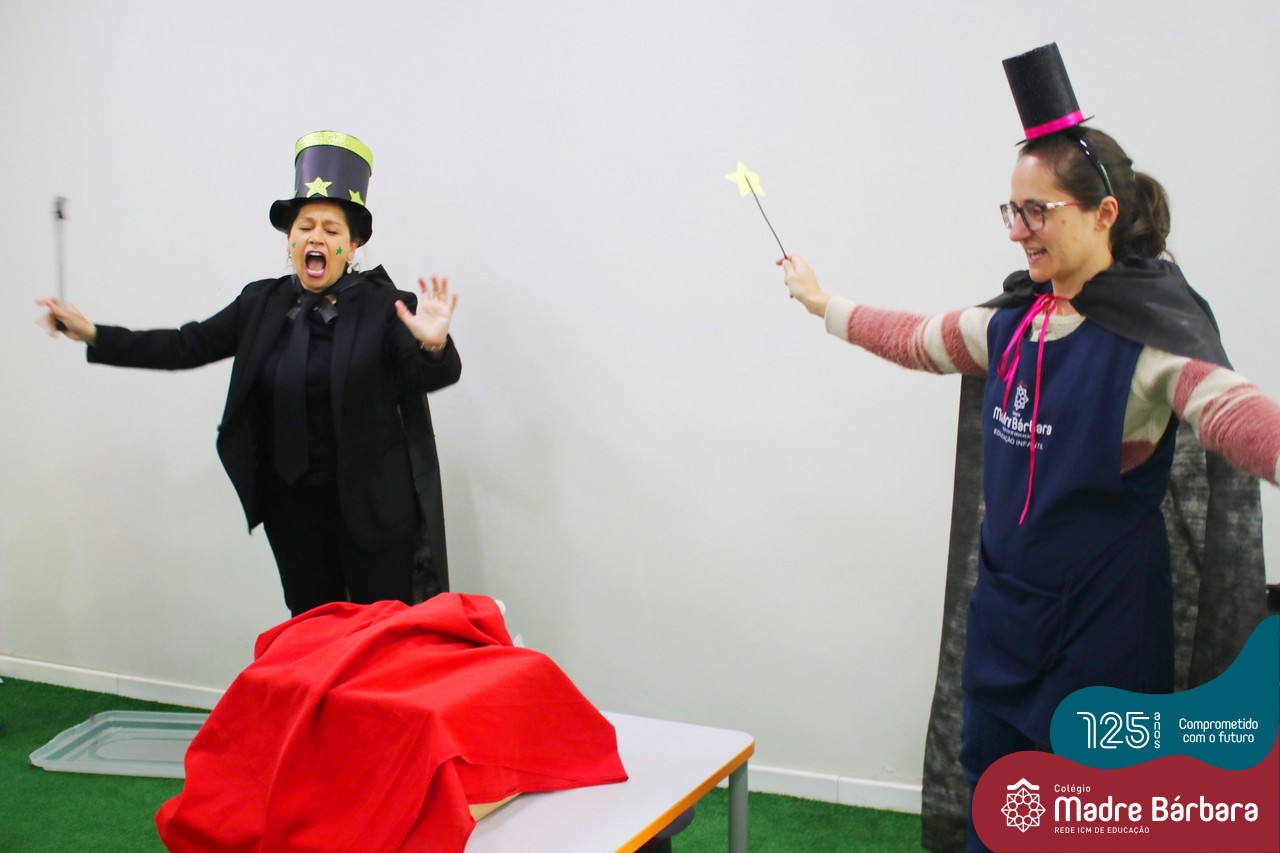 O primeiro dia da Semana da Criança foi marcado por encanto e magia. As crianças foram recebidas em um ambiente especialmente preparado com muita cor, cartolas e estrelas! O dia foi de mágicas que empolgaram as crianças e professoras. Abracadabra…simsalabim!!!